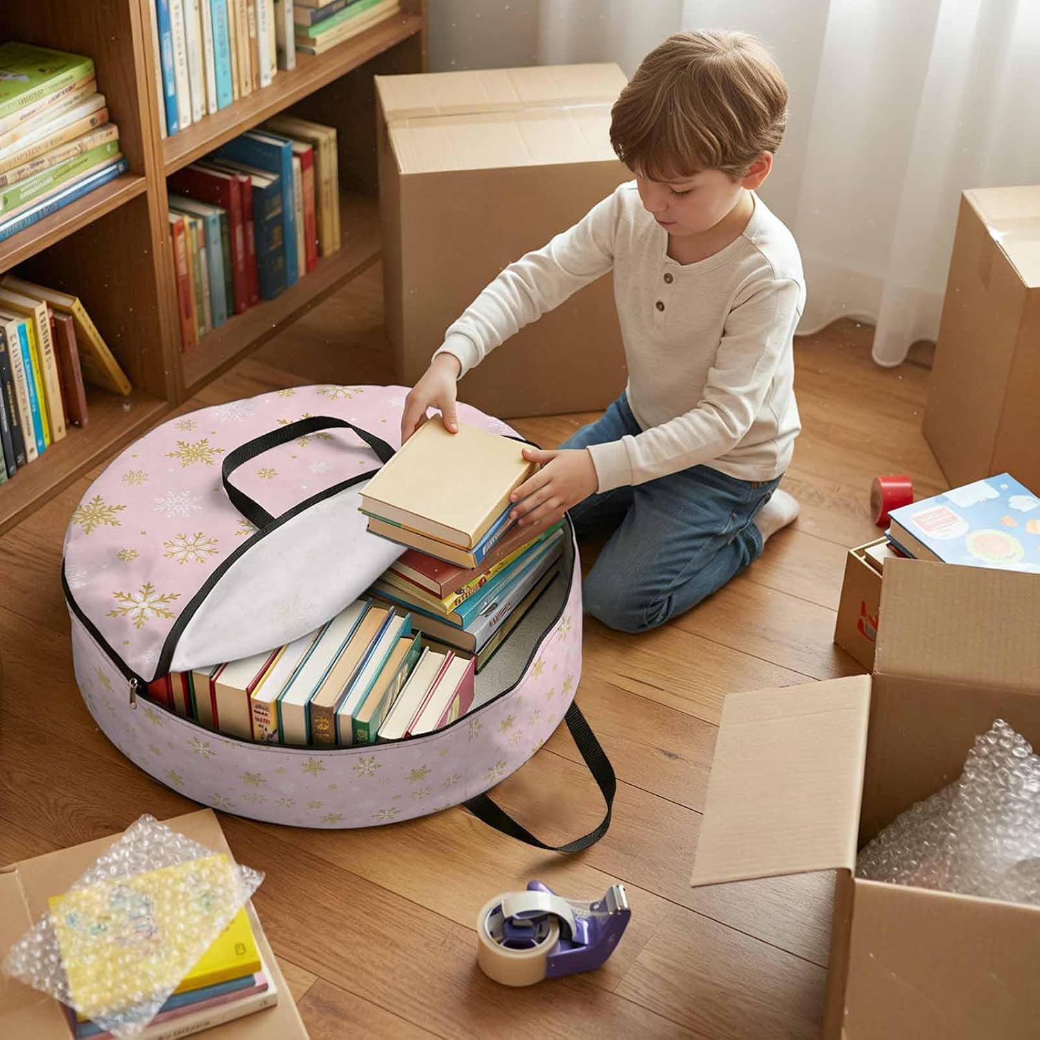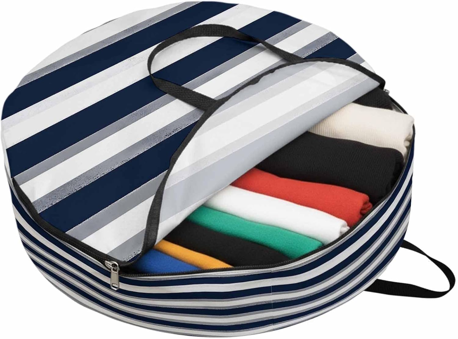 Reclaim Your Closet Space with the Round Storage Solution! Material: polyester Diameters: 24 inch, 30 inch, 36 inch Depth: 7 inches Package Includes: Round Storage Bag One Bag, Endless Possibilities: Whether you are swapping out your summer wardrobe, moving into a new dorm, or packing away holiday decorations, this bag has you covered. The circular design is uniquely suited for: Bedding: Comforters, quilts, sheet sets, and oversized pillows. Clothing: Winter coats, sweaters, and bulky ski gear. Home Decor: Holiday wreaths, garlands, and floral arrangements. Outdoor Gear: Camping blankets, sleeping bags, and beach towels. Dual Zippers: The high quality double zipper design allows the closet organizer to open wide from both sides, making it effortless to load and unload even the bulkiest comforters or wreaths. Reinforced Handles: Sturdy, reinforced handles are securely stitched to provide extra strength and a comfortable grip when carrying heavy loads or pulling the bag from under a bed. Clear Label Pocket: A transparent built-in label holder allows you to quickly identify the contents of each bag without ever having to unzip it, keeping your storage perfectly organized.