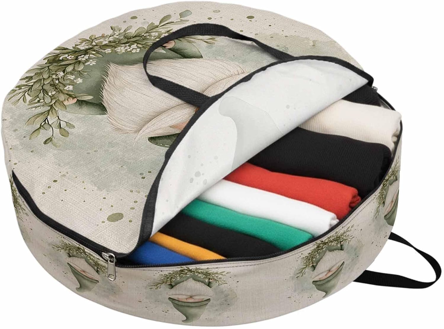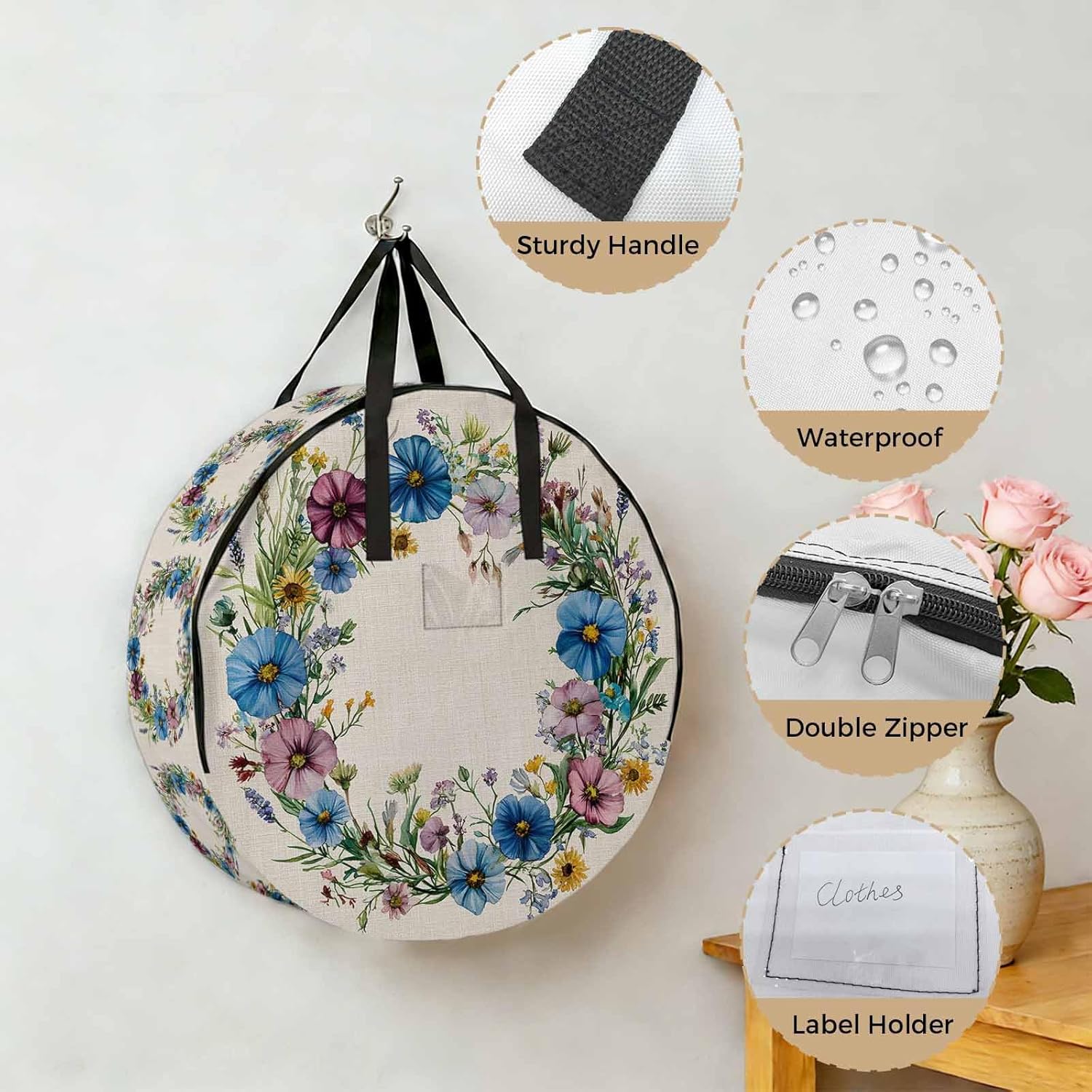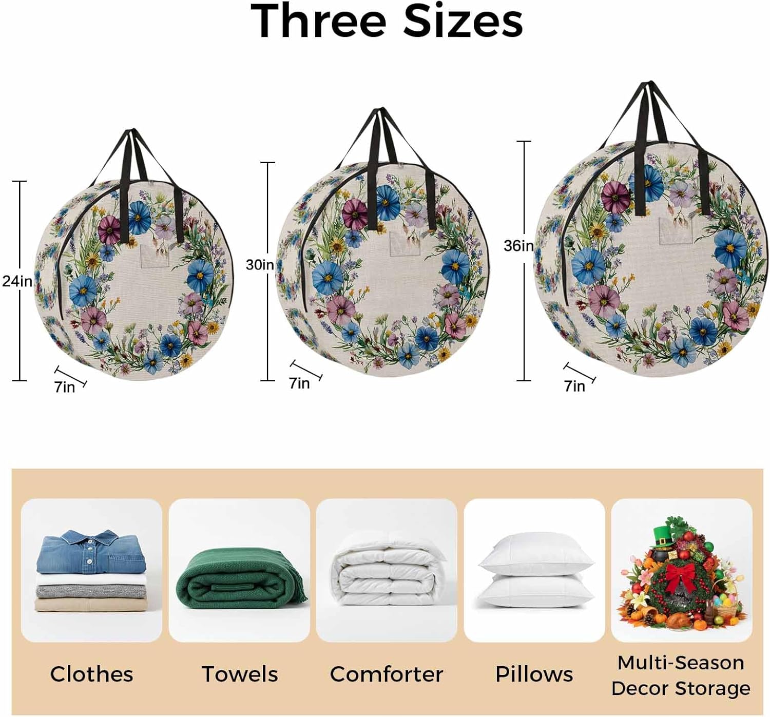 Reclaim Your Closet Space with the Round Storage Solution! Material: polyester Diameters: 24 inch, 30 inch, 36 inch Depth: 7 inches Package Includes: Round Storage Bag One Bag, Endless Possibilities: Whether you are swapping out your summer wardrobe, moving into a new dorm, or packing away holiday decorations, this bag has you covered. The circular design is uniquely suited for: Bedding: Comforters, quilts, sheet sets, and oversized pillows. Clothing: Winter coats, sweaters, and bulky ski gear. Home Decor: Holiday wreaths, garlands, and floral arrangements. Outdoor Gear: Camping blankets, sleeping bags, and beach towels. Dual Zippers: The high quality double zipper design allows the closet organizer to open wide from both sides, making it effortless to load and unload even the bulkiest comforters or wreaths. Reinforced Handles: Sturdy, reinforced handles are securely stitched to provide extra strength and a comfortable grip when carrying heavy loads or pulling the bag from under a bed. Clear Label Pocket: A transparent built-in label holder allows you to quickly identify the contents of each bag without ever having to unzip it, keeping your storage perfectly organized.