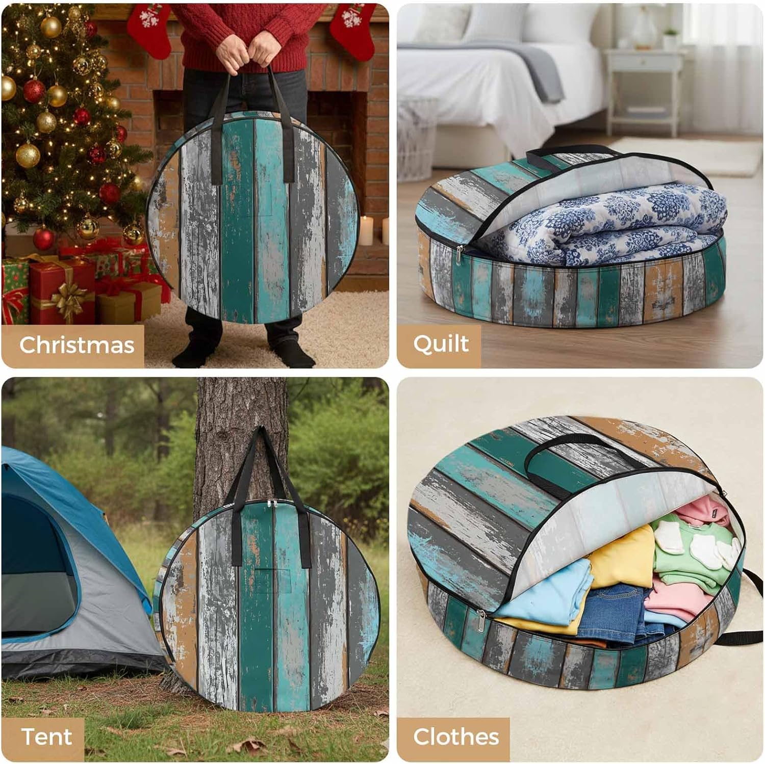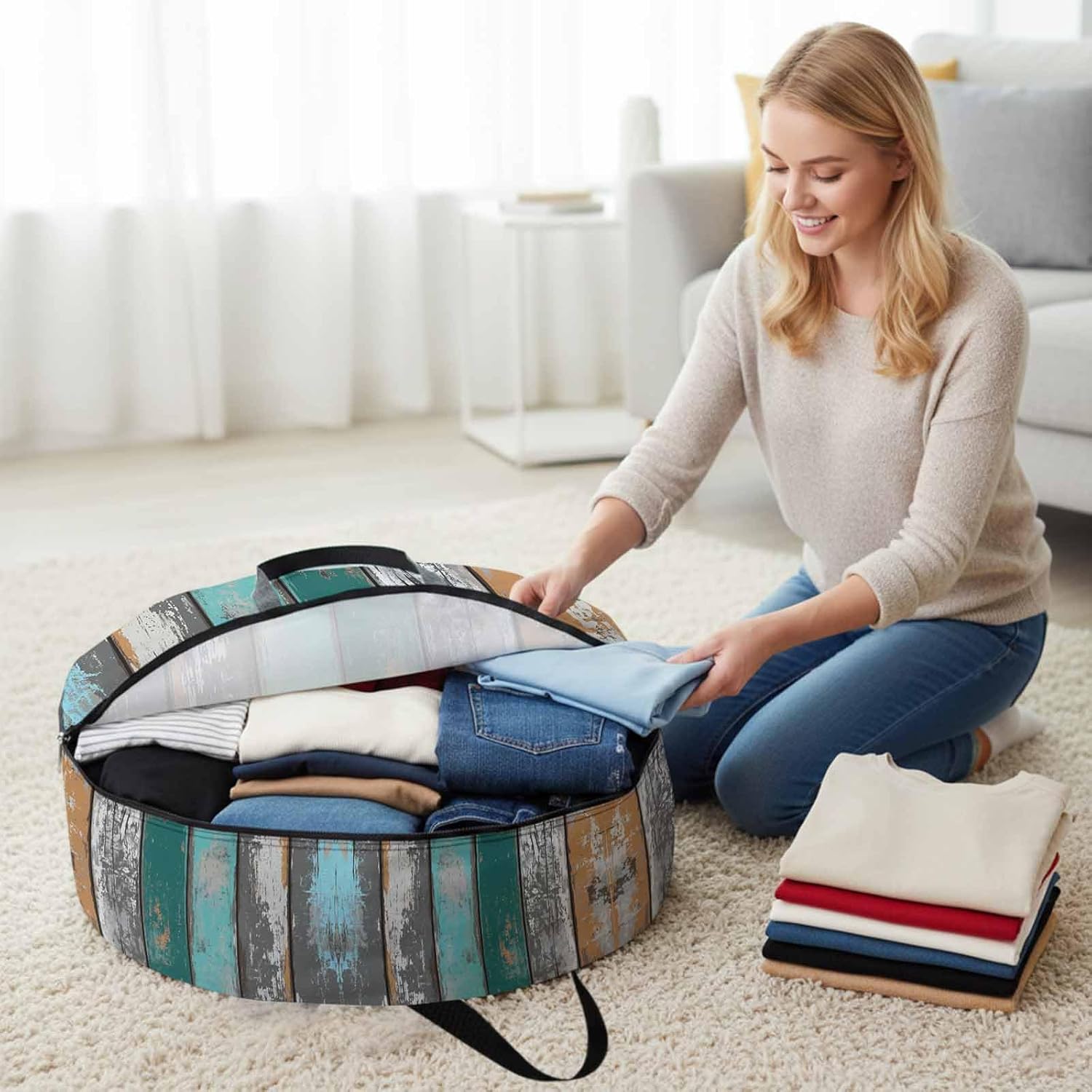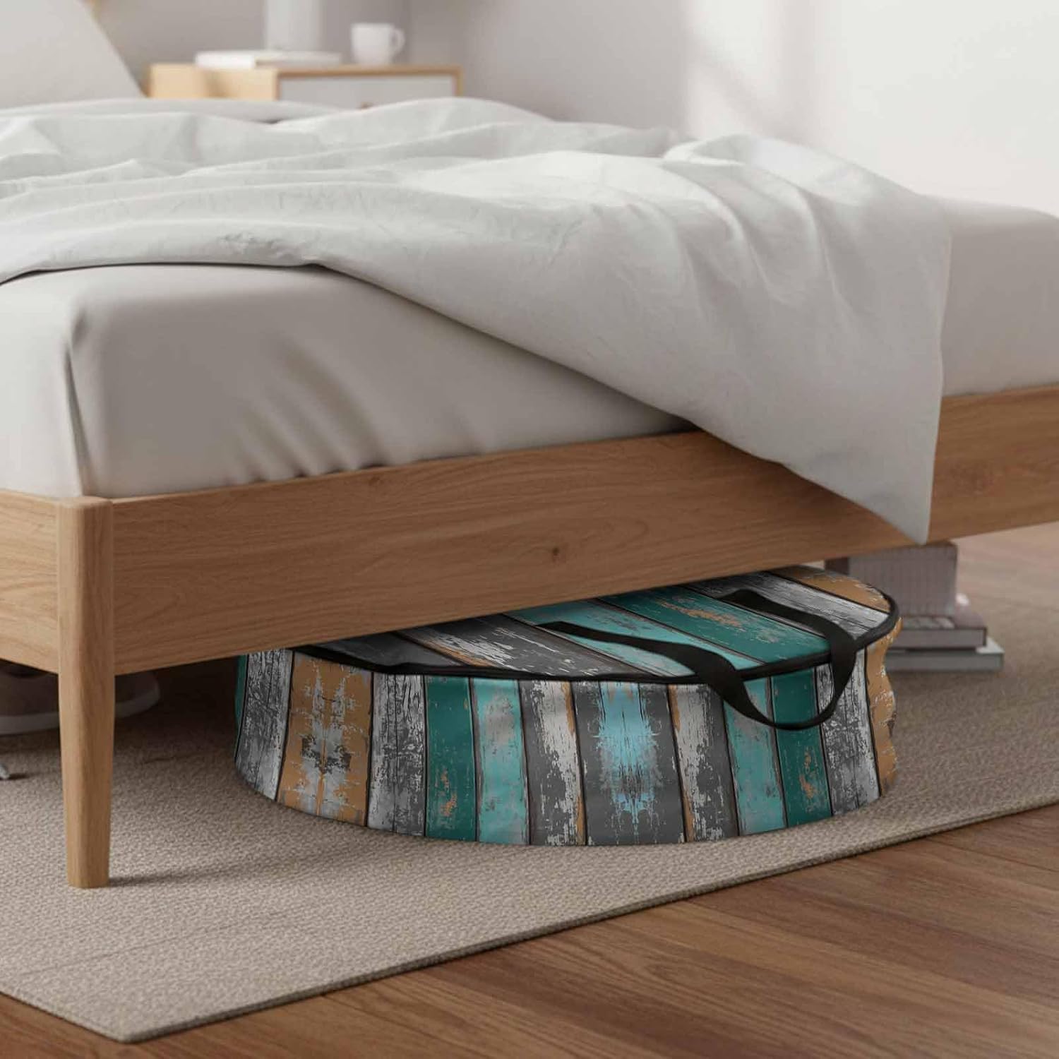 Reclaim Your Closet Space with the Round Storage Solution! Material: polyester Diameters: 24 inch, 30 inch, 36 inch Depth: 7 inches Package Includes: Round Storage Bag One Bag, Endless Possibilities: Whether you are swapping out your summer wardrobe, moving into a new dorm, or packing away holiday decorations, this bag has you covered. The circular design is uniquely suited for: Bedding: Comforters, quilts, sheet sets, and oversized pillows. Clothing: Winter coats, sweaters, and bulky ski gear. Home Decor: Holiday wreaths, garlands, and floral arrangements. Outdoor Gear: Camping blankets, sleeping bags, and beach towels. Dual Zippers: The high quality double zipper design allows the closet organizer to open wide from both sides, making it effortless to load and unload even the bulkiest comforters or wreaths. Reinforced Handles: Sturdy, reinforced handles are securely stitched to provide extra strength and a comfortable grip when carrying heavy loads or pulling the bag from under a bed. Clear Label Pocket: A transparent built-in label holder allows you to quickly identify the contents of each bag without ever having to unzip it, keeping your storage perfectly organized.