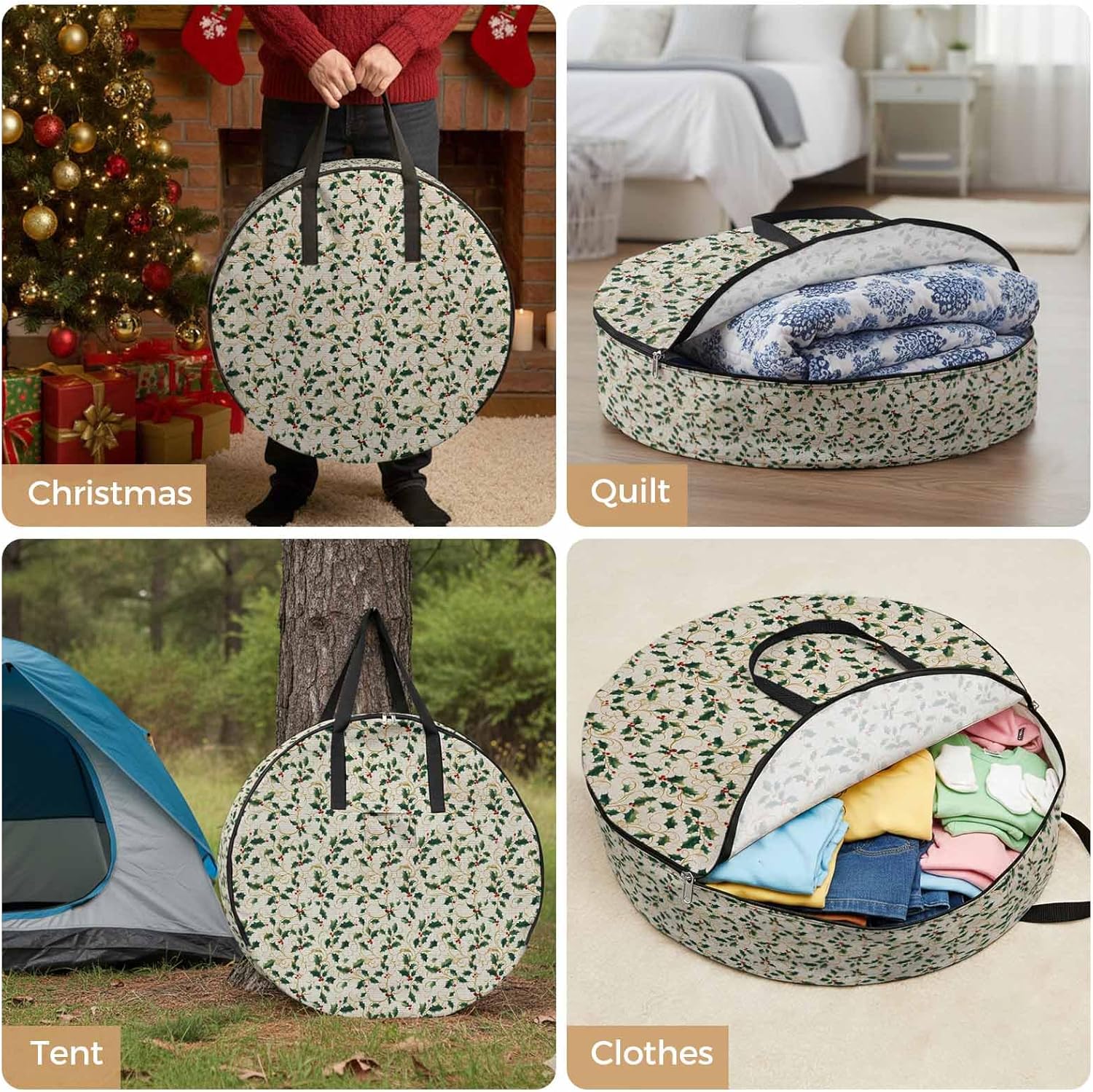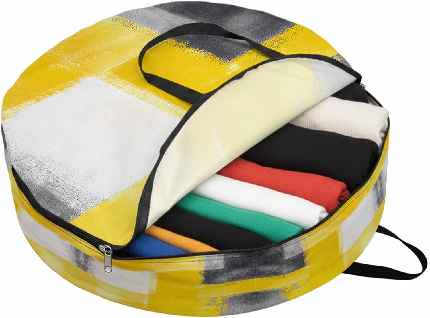 Reclaim Your Closet Space with the Round Storage Solution! Material: polyester Diameters: 24 inch, 30 inch, 36 inch Depth: 7 inches Package Includes: Round Storage Bag One Bag, Endless Possibilities: Whether you are swapping out your summer wardrobe, moving into a new dorm, or packing away holiday decorations, this bag has you covered. The circular design is uniquely suited for: Bedding: Comforters, quilts, sheet sets, and oversized pillows. Clothing: Winter coats, sweaters, and bulky ski gear. Home Decor: Holiday wreaths, garlands, and floral arrangements. Outdoor Gear: Camping blankets, sleeping bags, and beach towels. Dual Zippers: The high quality double zipper design allows the closet organizer to open wide from both sides, making it effortless to load and unload even the bulkiest comforters or wreaths. Reinforced Handles: Sturdy, reinforced handles are securely stitched to provide extra strength and a comfortable grip when carrying heavy loads or pulling the bag from under a bed. Clear Label Pocket: A transparent built-in label holder allows you to quickly identify the contents of each bag without ever having to unzip it, keeping your storage perfectly organized.