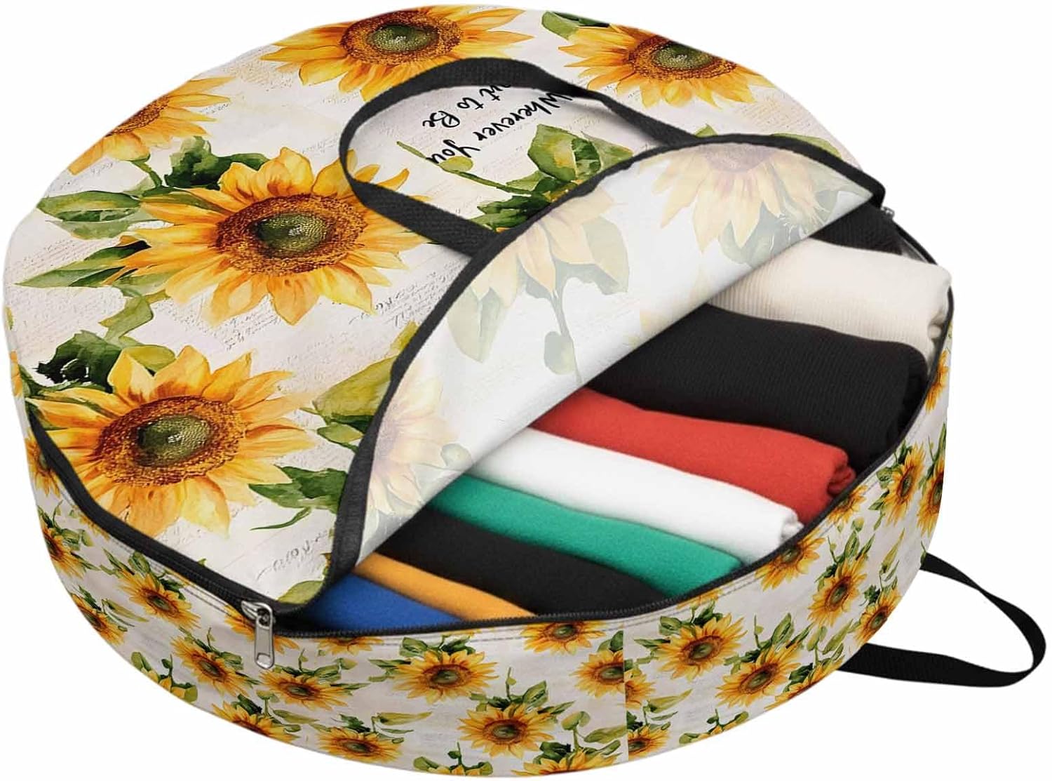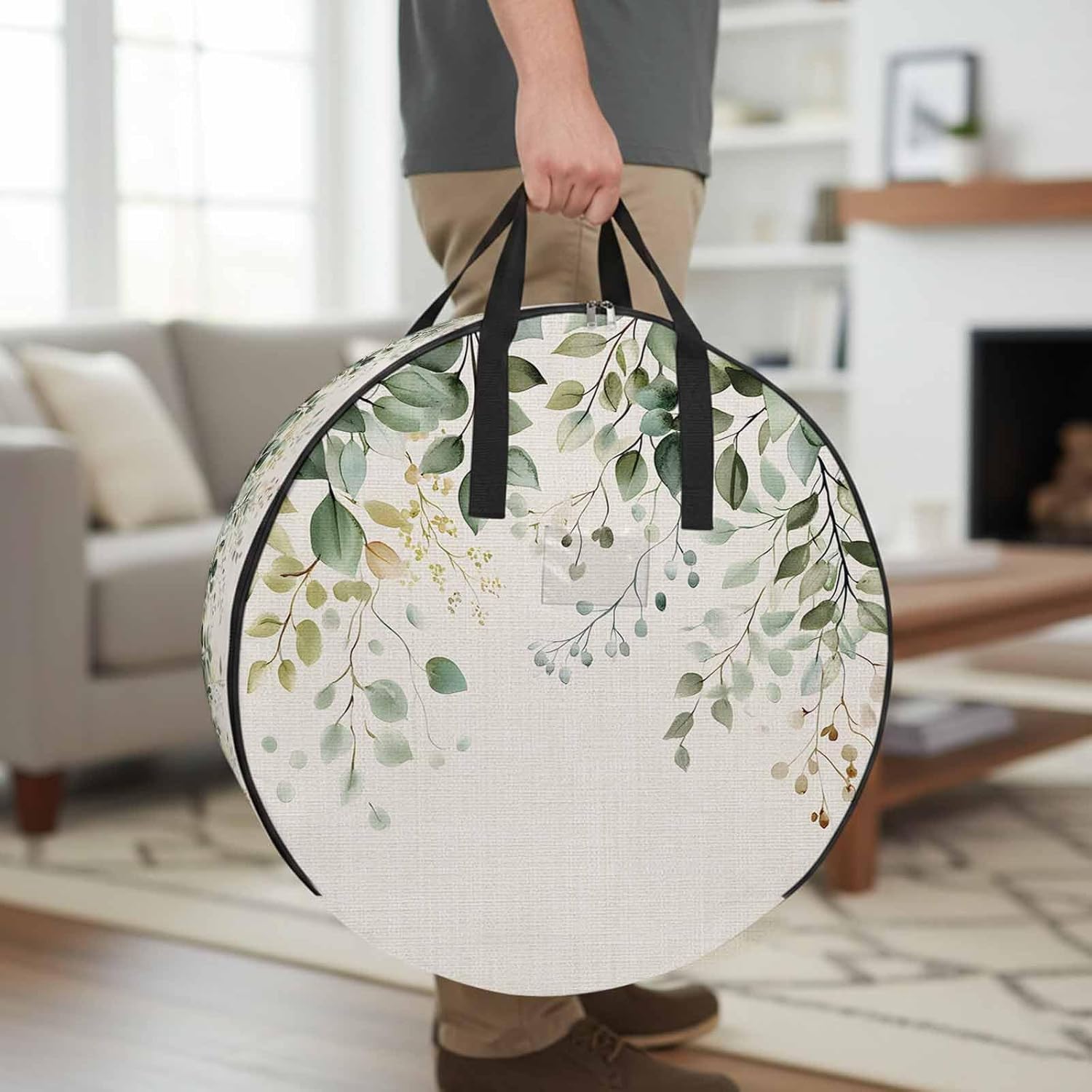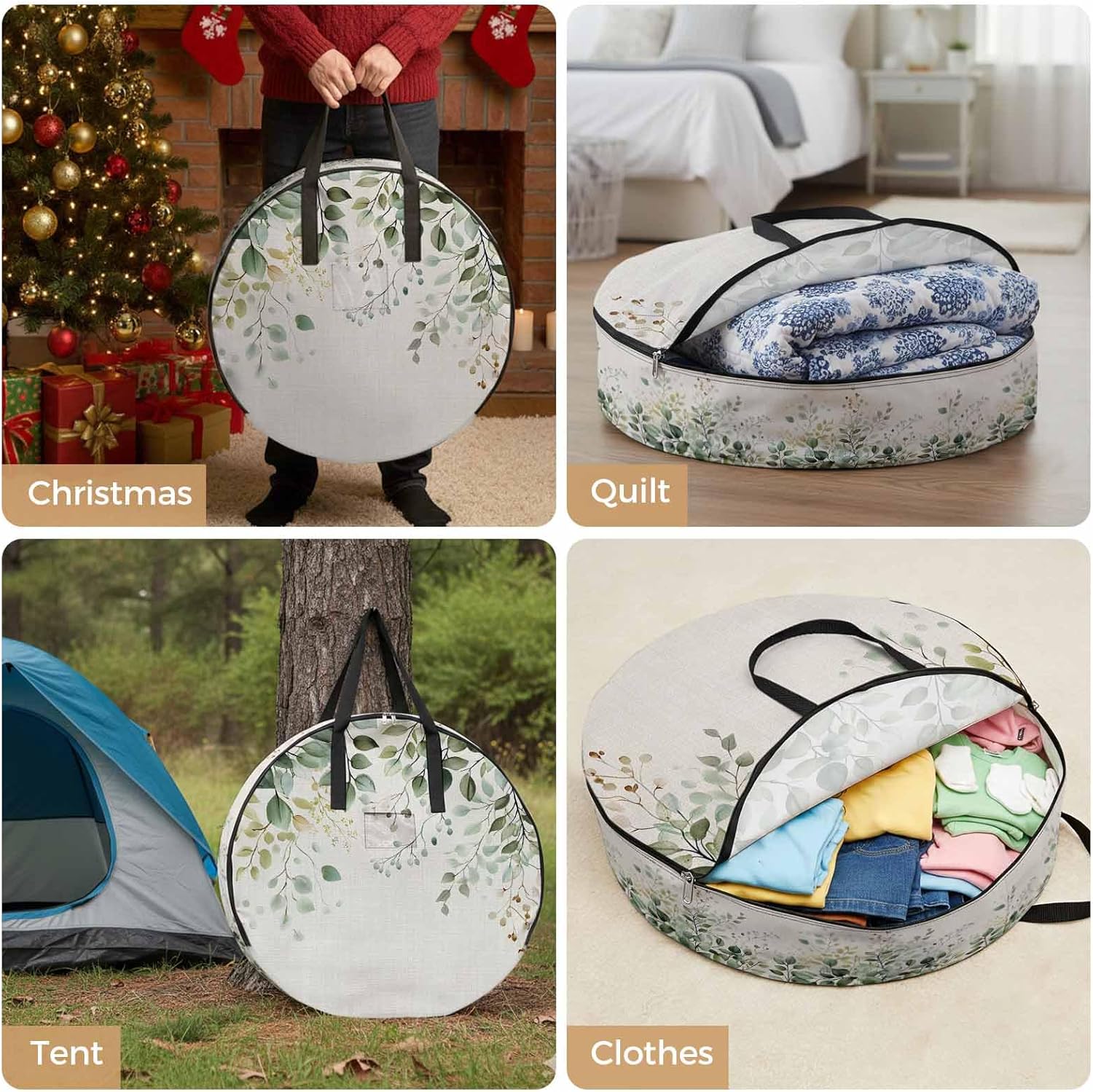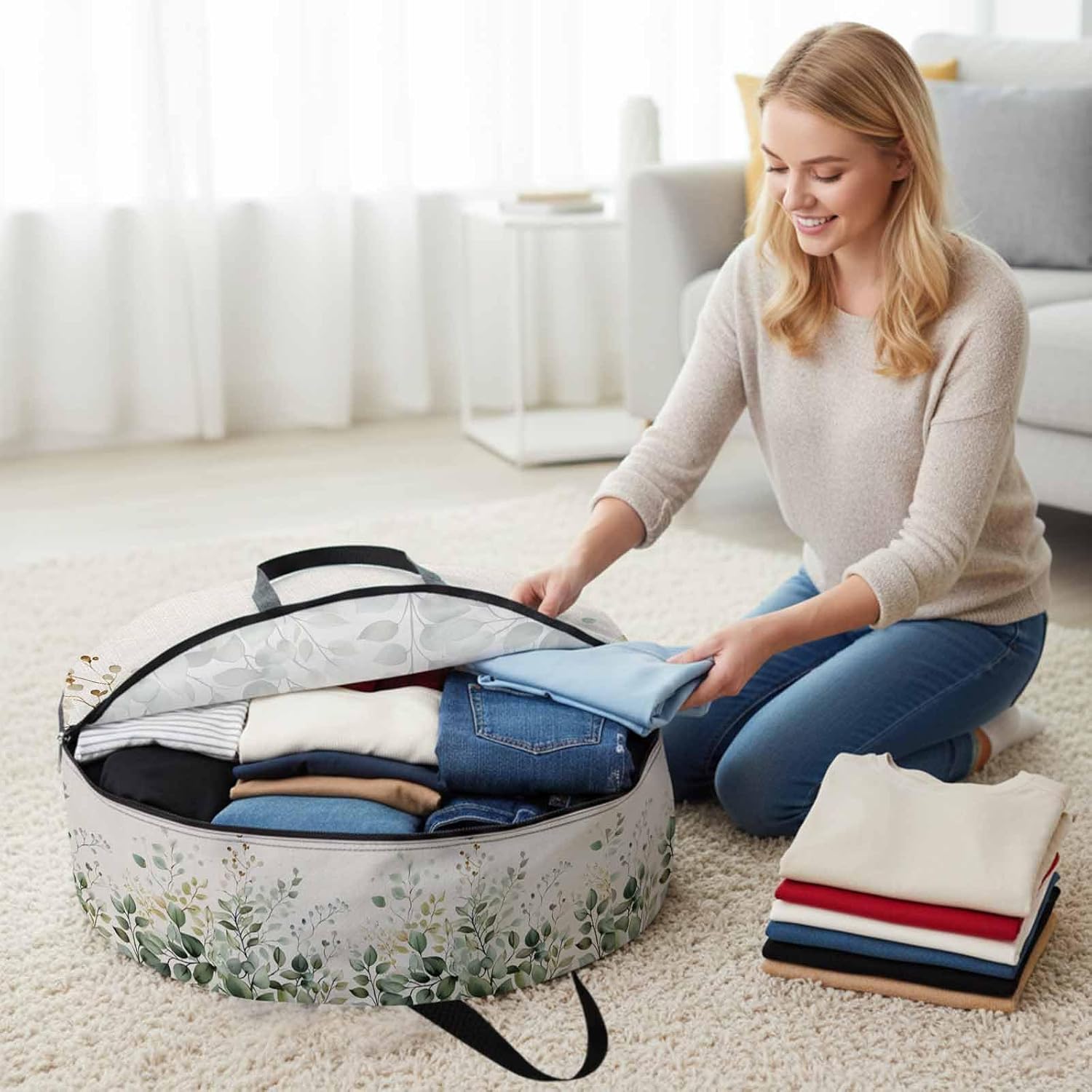 Reclaim Your Closet Space with the Round Storage Solution! Material: polyester Diameters: 24 inch, 30 inch, 36 inch Depth: 7 inches Package Includes: Round Storage Bag One Bag, Endless Possibilities: Whether you are swapping out your summer wardrobe, moving into a new dorm, or packing away holiday decorations, this bag has you covered. The circular design is uniquely suited for: Bedding: Comforters, quilts, sheet sets, and oversized pillows. Clothing: Winter coats, sweaters, and bulky ski gear. Home Decor: Holiday wreaths, garlands, and floral arrangements. Outdoor Gear: Camping blankets, sleeping bags, and beach towels. Dual Zippers: The high quality double zipper design allows the closet organizer to open wide from both sides, making it effortless to load and unload even the bulkiest comforters or wreaths. Reinforced Handles: Sturdy, reinforced handles are securely stitched to provide extra strength and a comfortable grip when carrying heavy loads or pulling the bag from under a bed. Clear Label Pocket: A transparent built-in label holder allows you to quickly identify the contents of each bag without ever having to unzip it, keeping your storage perfectly organized.