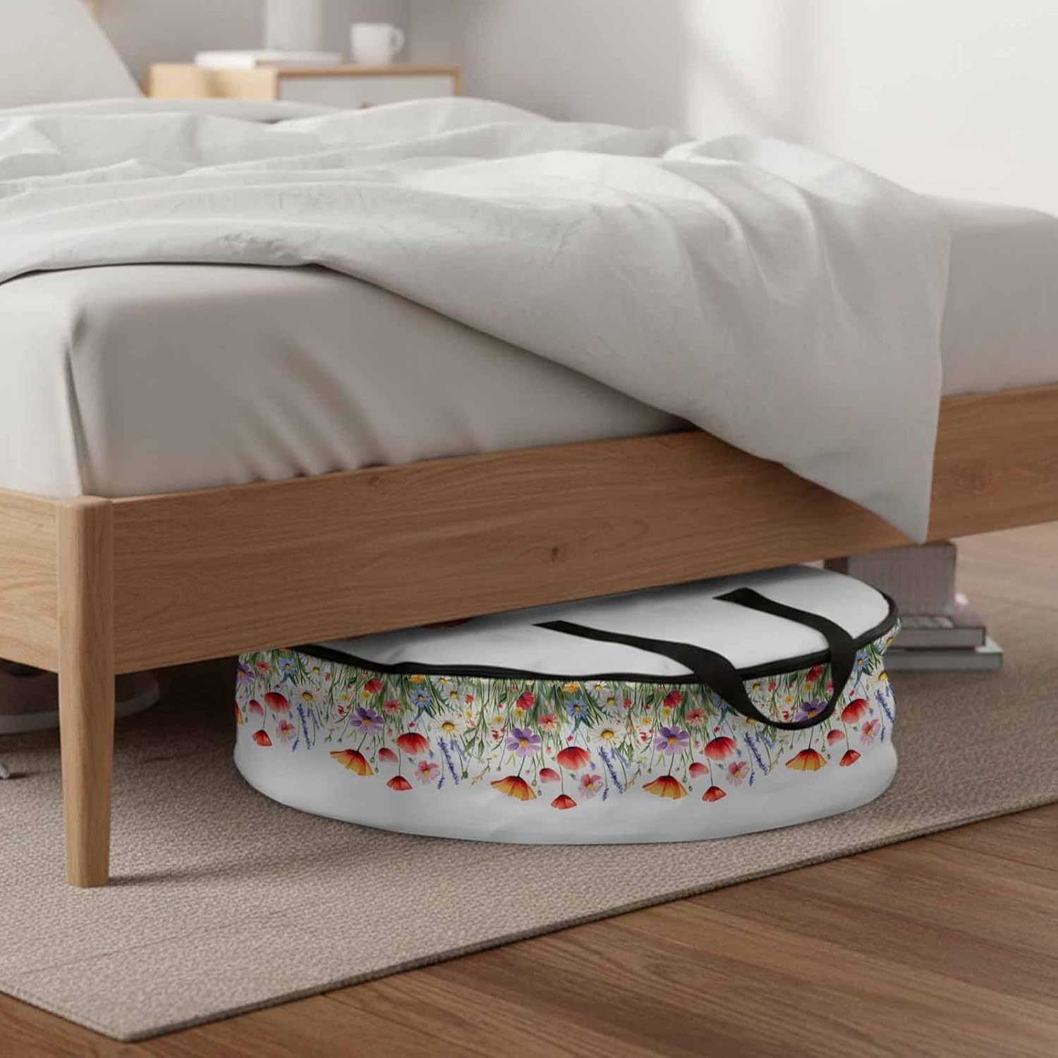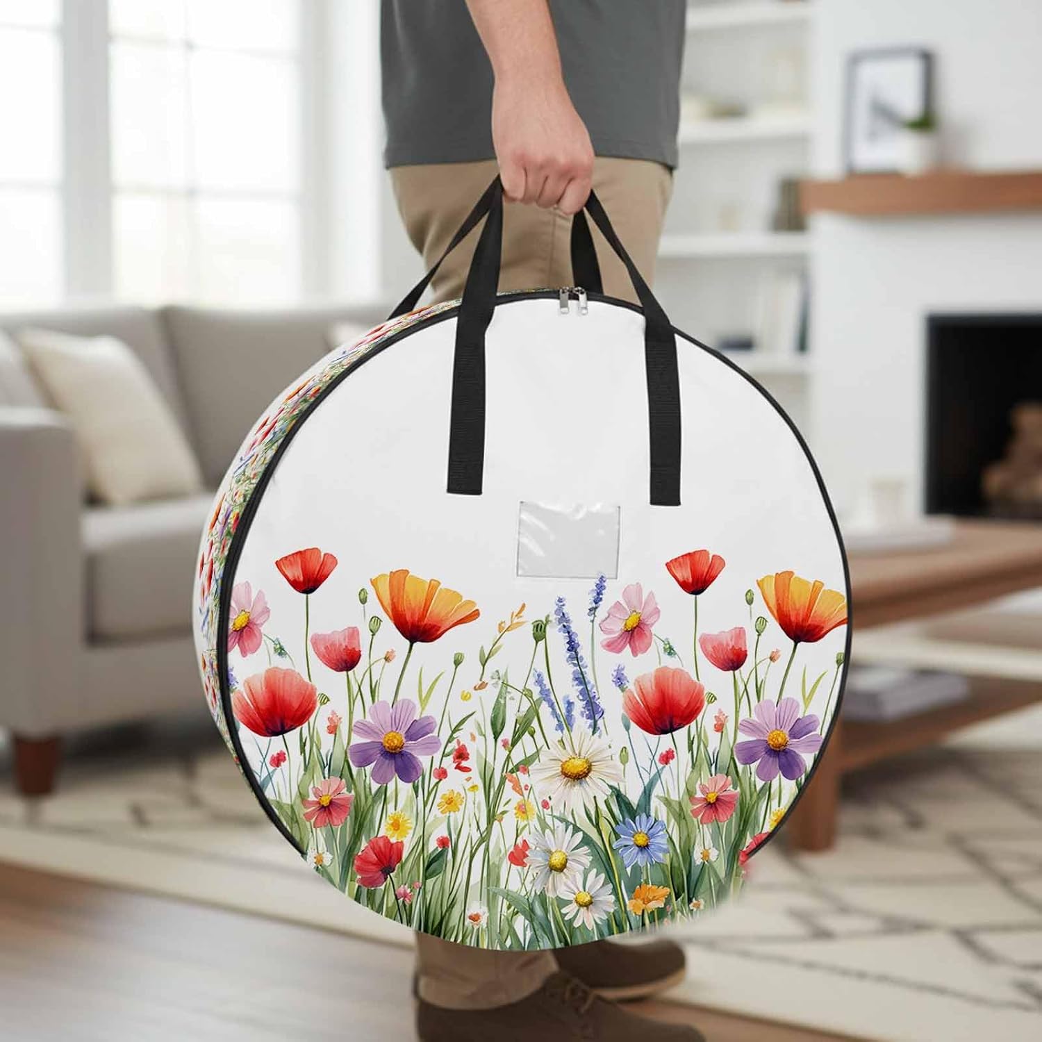 Reclaim Your Closet Space with the Round Storage Solution! Material: polyester Diameters: 24 inch, 30 inch, 36 inch Depth: 7 inches Package Includes: Round Storage Bag One Bag, Endless Possibilities: Whether you are swapping out your summer wardrobe, moving into a new dorm, or packing away holiday decorations, this bag has you covered. The circular design is uniquely suited for: Bedding: Comforters, quilts, sheet sets, and oversized pillows. Clothing: Winter coats, sweaters, and bulky ski gear. Home Decor: Holiday wreaths, garlands, and floral arrangements. Outdoor Gear: Camping blankets, sleeping bags, and beach towels. Dual Zippers: The high quality double zipper design allows the closet organizer to open wide from both sides, making it effortless to load and unload even the bulkiest comforters or wreaths. Reinforced Handles: Sturdy, reinforced handles are securely stitched to provide extra strength and a comfortable grip when carrying heavy loads or pulling the bag from under a bed. Clear Label Pocket: A transparent built-in label holder allows you to quickly identify the contents of each bag without ever having to unzip it, keeping your storage perfectly organized.