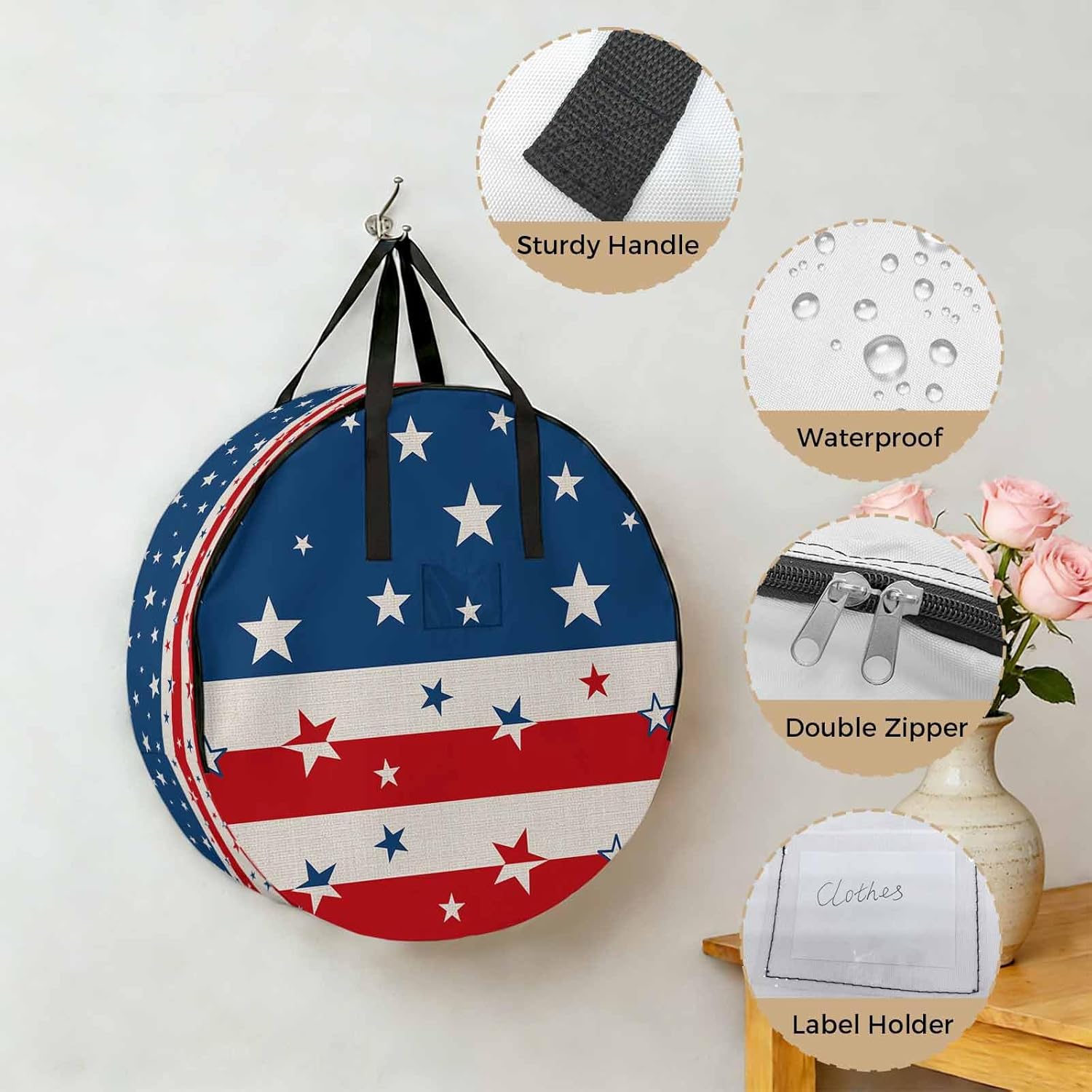 Reclaim Your Closet Space with the Round Storage Solution! Material: polyester Diameters: 24 inch, 30 inch, 36 inch Depth: 7 inches Package Includes: Round Storage Bag One Bag, Endless Possibilities: Whether you are swapping out your summer wardrobe, moving into a new dorm, or packing away holiday decorations, this bag has you covered. The circular design is uniquely suited for: Bedding: Comforters, quilts, sheet sets, and oversized pillows. Clothing: Winter coats, sweaters, and bulky ski gear. Home Decor: Holiday wreaths, garlands, and floral arrangements. Outdoor Gear: Camping blankets, sleeping bags, and beach towels. Dual Zippers: The high quality double zipper design allows the closet organizer to open wide from both sides, making it effortless to load and unload even the bulkiest comforters or wreaths. Reinforced Handles: Sturdy, reinforced handles are securely stitched to provide extra strength and a comfortable grip when carrying heavy loads or pulling the bag from under a bed. Clear Label Pocket: A transparent built-in label holder allows you to quickly identify the contents of each bag without ever having to unzip it, keeping your storage perfectly organized.