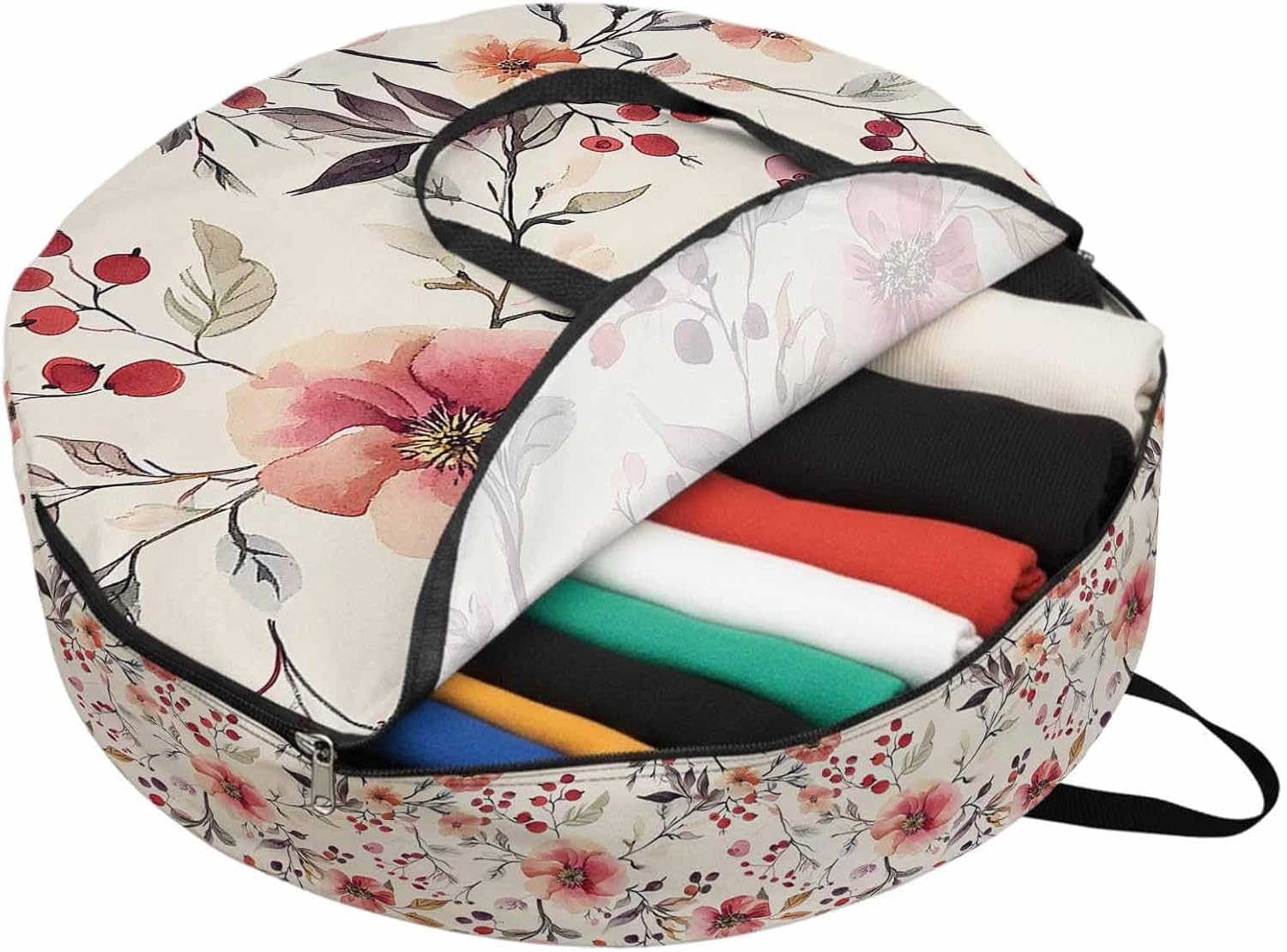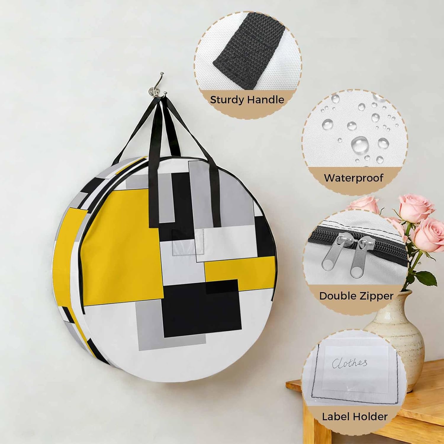 Reclaim Your Closet Space with the Round Storage Solution! Material: polyester Diameters: 24 inch, 30 inch, 36 inch Depth: 7 inches Package Includes: Round Storage Bag One Bag, Endless Possibilities: Whether you are swapping out your summer wardrobe, moving into a new dorm, or packing away holiday decorations, this bag has you covered. The circular design is uniquely suited for: Bedding: Comforters, quilts, sheet sets, and oversized pillows. Clothing: Winter coats, sweaters, and bulky ski gear. Home Decor: Holiday wreaths, garlands, and floral arrangements. Outdoor Gear: Camping blankets, sleeping bags, and beach towels. Dual Zippers: The high quality double zipper design allows the closet organizer to open wide from both sides, making it effortless to load and unload even the bulkiest comforters or wreaths. Reinforced Handles: Sturdy, reinforced handles are securely stitched to provide extra strength and a comfortable grip when carrying heavy loads or pulling the bag from under a bed. Clear Label Pocket: A transparent built-in label holder allows you to quickly identify the contents of each bag without ever having to unzip it, keeping your storage perfectly organized.
