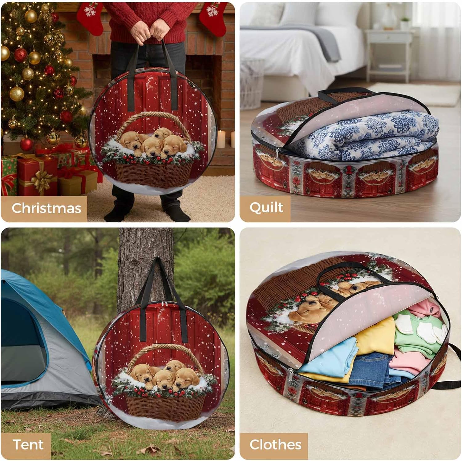 Reclaim Your Closet Space with the Round Storage Solution! Material: polyester Diameters: 24 inch, 30 inch, 36 inch Depth: 7 inches Package Includes: Round Storage Bag One Bag, Endless Possibilities: Whether you are swapping out your summer wardrobe, moving into a new dorm, or packing away holiday decorations, this bag has you covered. The circular design is uniquely suited for: Bedding: Comforters, quilts, sheet sets, and oversized pillows. Clothing: Winter coats, sweaters, and bulky ski gear. Home Decor: Holiday wreaths, garlands, and floral arrangements. Outdoor Gear: Camping blankets, sleeping bags, and beach towels. Dual Zippers: The high quality double zipper design allows the closet organizer to open wide from both sides, making it effortless to load and unload even the bulkiest comforters or wreaths. Reinforced Handles: Sturdy, reinforced handles are securely stitched to provide extra strength and a comfortable grip when carrying heavy loads or pulling the bag from under a bed. Clear Label Pocket: A transparent built-in label holder allows you to quickly identify the contents of each bag without ever having to unzip it, keeping your storage perfectly organized.