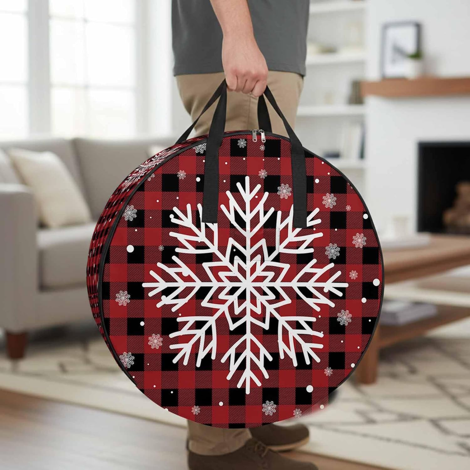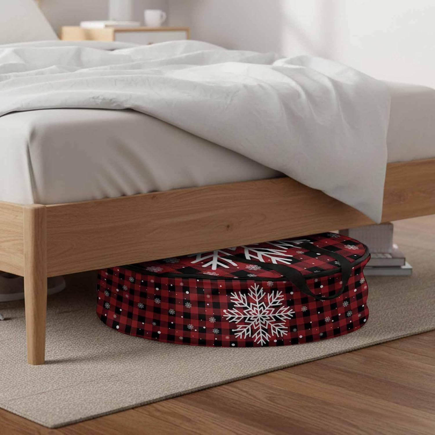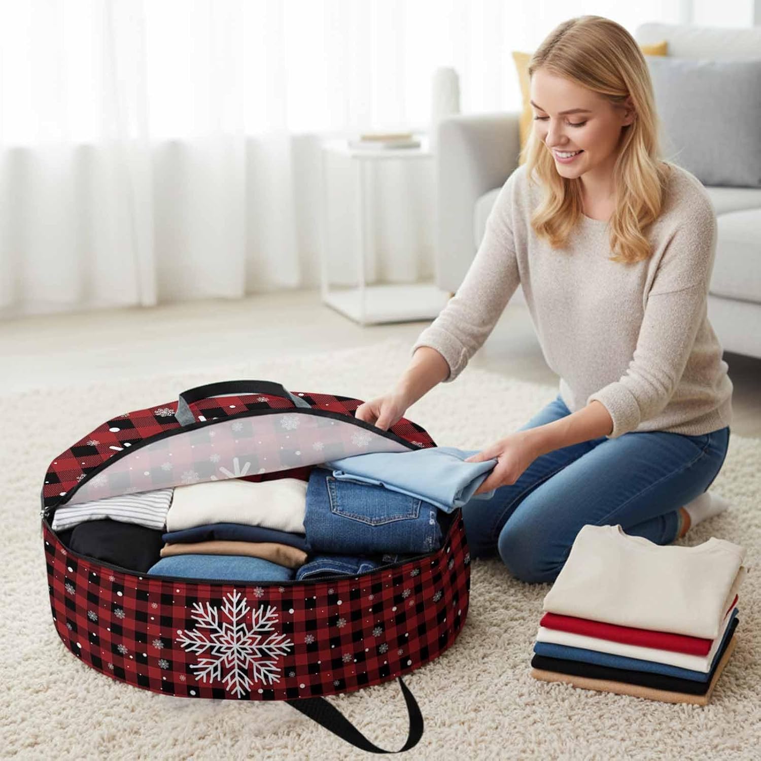 Reclaim Your Closet Space with the Round Storage Solution! Material: polyester Diameters: 24 inch, 30 inch, 36 inch Depth: 7 inches Package Includes: Round Storage Bag One Bag, Endless Possibilities: Whether you are swapping out your summer wardrobe, moving into a new dorm, or packing away holiday decorations, this bag has you covered. The circular design is uniquely suited for: Bedding: Comforters, quilts, sheet sets, and oversized pillows. Clothing: Winter coats, sweaters, and bulky ski gear. Home Decor: Holiday wreaths, garlands, and floral arrangements. Outdoor Gear: Camping blankets, sleeping bags, and beach towels. Dual Zippers: The high quality double zipper design allows the closet organizer to open wide from both sides, making it effortless to load and unload even the bulkiest comforters or wreaths. Reinforced Handles: Sturdy, reinforced handles are securely stitched to provide extra strength and a comfortable grip when carrying heavy loads or pulling the bag from under a bed. Clear Label Pocket: A transparent built-in label holder allows you to quickly identify the contents of each bag without ever having to unzip it, keeping your storage perfectly organized.
