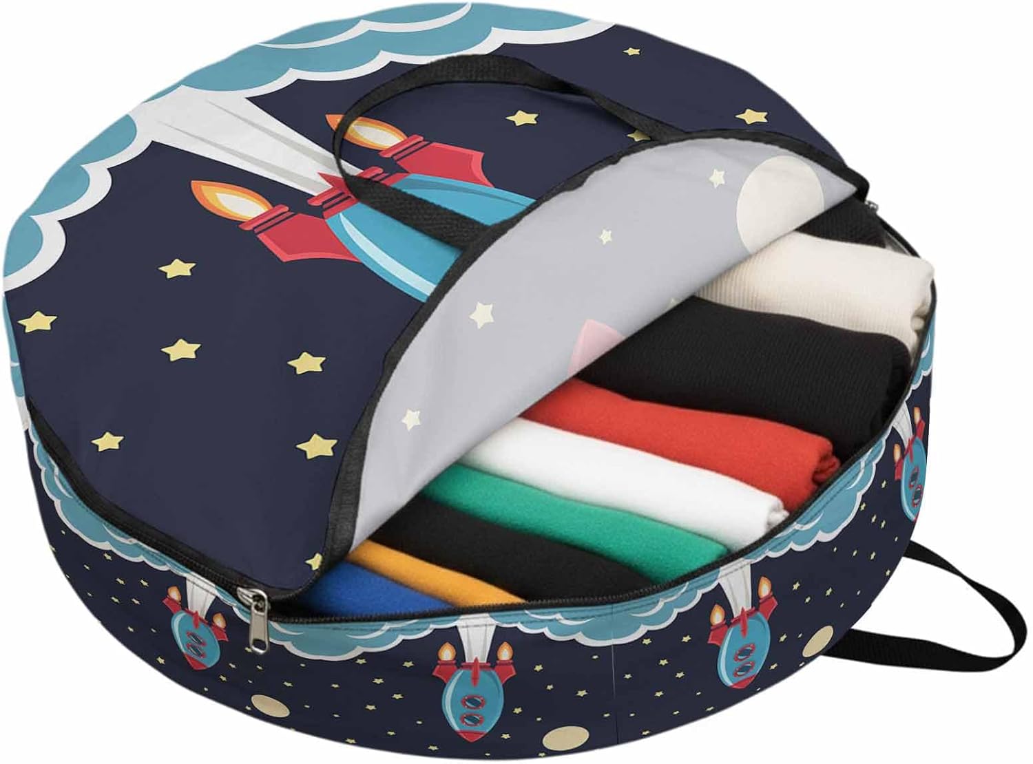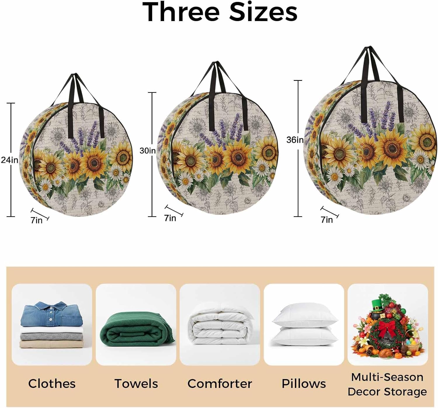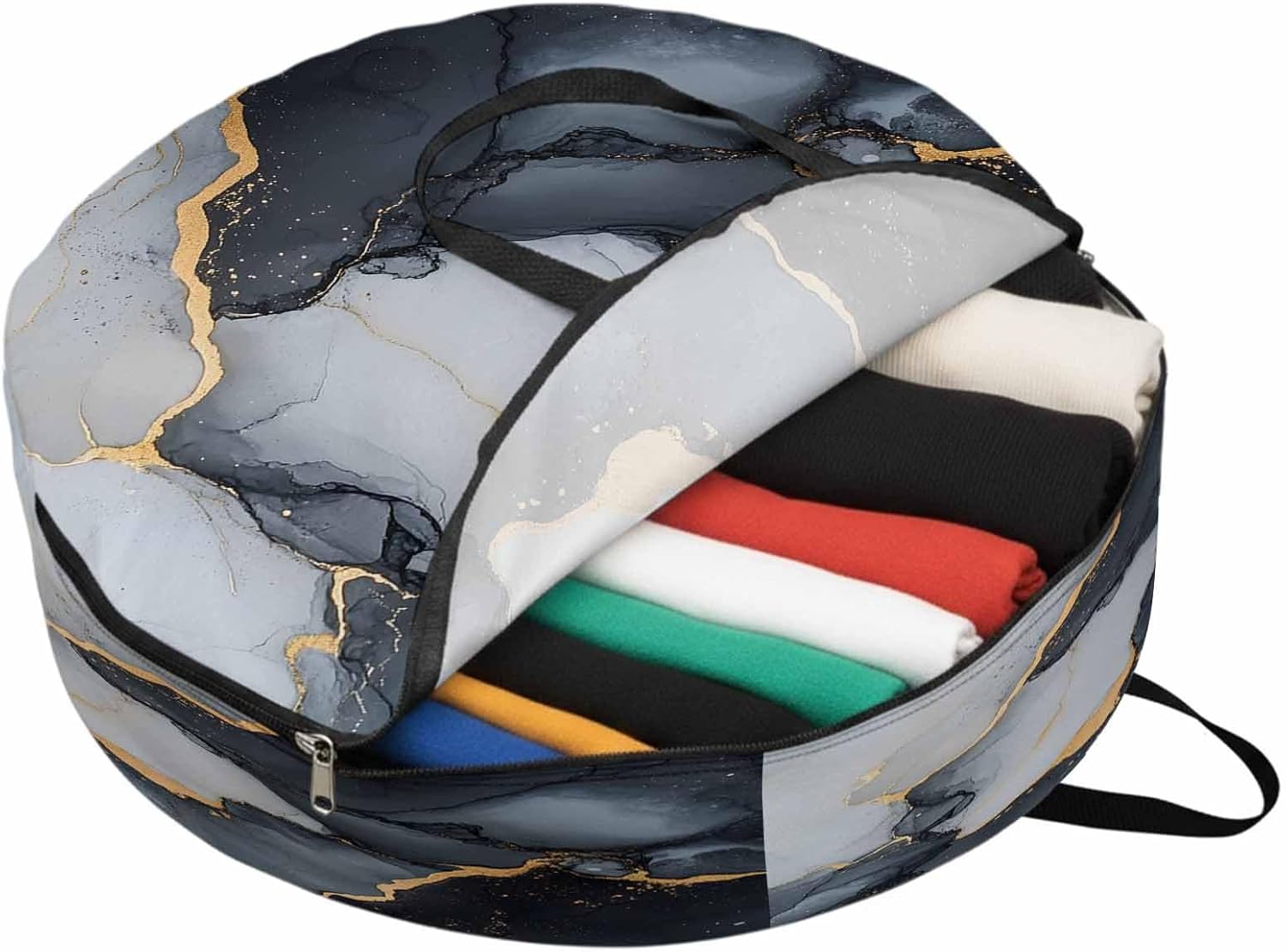 Reclaim Your Closet Space with the Round Storage Solution! Material: polyester Diameters: 24 inch, 30 inch, 36 inch Depth: 7 inches Package Includes: Round Storage Bag One Bag, Endless Possibilities: Whether you are swapping out your summer wardrobe, moving into a new dorm, or packing away holiday decorations, this bag has you covered. The circular design is uniquely suited for: Bedding: Comforters, quilts, sheet sets, and oversized pillows. Clothing: Winter coats, sweaters, and bulky ski gear. Home Decor: Holiday wreaths, garlands, and floral arrangements. Outdoor Gear: Camping blankets, sleeping bags, and beach towels. Dual Zippers: The high quality double zipper design allows the closet organizer to open wide from both sides, making it effortless to load and unload even the bulkiest comforters or wreaths. Reinforced Handles: Sturdy, reinforced handles are securely stitched to provide extra strength and a comfortable grip when carrying heavy loads or pulling the bag from under a bed. Clear Label Pocket: A transparent built-in label holder allows you to quickly identify the contents of each bag without ever having to unzip it, keeping your storage perfectly organized.
