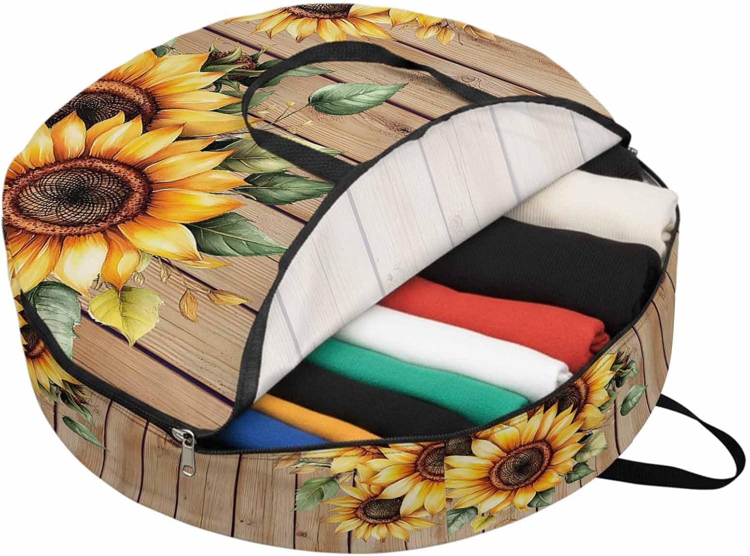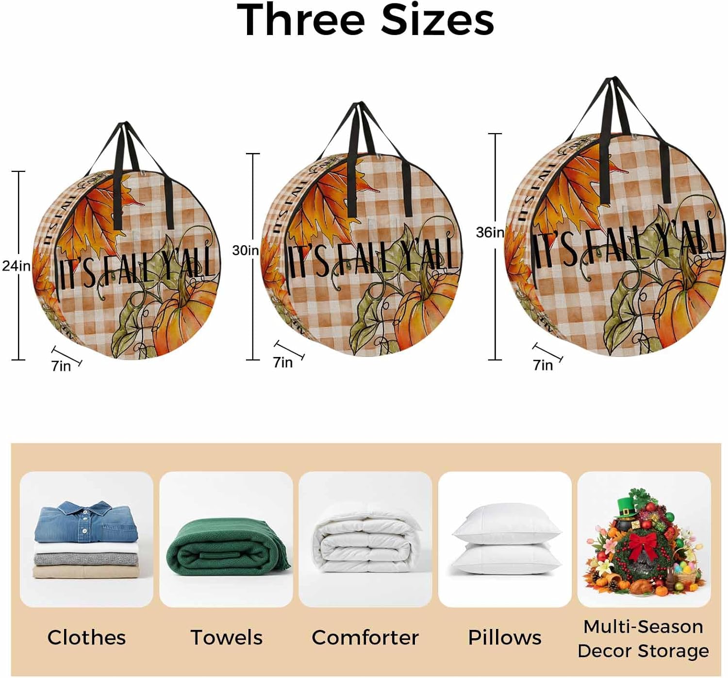Reclaim Your Closet Space with the Round Storage Solution! Material: polyester Diameters: 24 inch, 30 inch, 36 inch Depth: 7 inches Package Includes: Round Storage Bag One Bag, Endless Possibilities: Whether you are swapping out your summer wardrobe, moving into a new dorm, or packing away holiday decorations, this bag has you covered. The circular design is uniquely suited for: Bedding: Comforters, quilts, sheet sets, and oversized pillows. Clothing: Winter coats, sweaters, and bulky ski gear. Home Decor: Holiday wreaths, garlands, and floral arrangements. Outdoor Gear: Camping blankets, sleeping bags, and beach towels. Dual Zippers: The high quality double zipper design allows the closet organizer to open wide from both sides, making it effortless to load and unload even the bulkiest comforters or wreaths. Reinforced Handles: Sturdy, reinforced handles are securely stitched to provide extra strength and a comfortable grip when carrying heavy loads or pulling the bag from under a bed. Clear Label Pocket: A transparent built-in label holder allows you to quickly identify the contents of each bag without ever having to unzip it, keeping your storage perfectly organized.