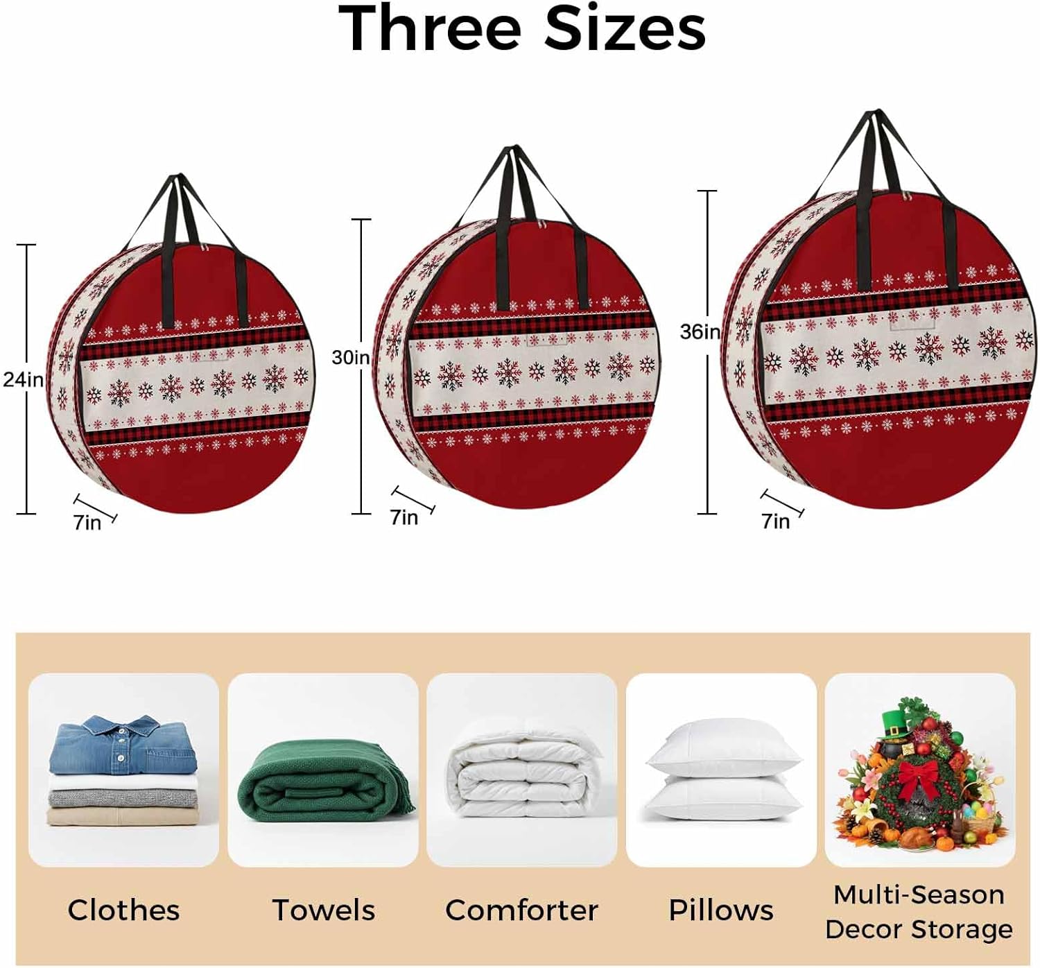 Reclaim Your Closet Space with the Round Storage Solution! Material: polyester Diameters: 24 inch, 30 inch, 36 inch Depth: 7 inches Package Includes: Round Storage Bag One Bag, Endless Possibilities: Whether you are swapping out your summer wardrobe, moving into a new dorm, or packing away holiday decorations, this bag has you covered. The circular design is uniquely suited for: Bedding: Comforters, quilts, sheet sets, and oversized pillows. Clothing: Winter coats, sweaters, and bulky ski gear. Home Decor: Holiday wreaths, garlands, and floral arrangements. Outdoor Gear: Camping blankets, sleeping bags, and beach towels. Dual Zippers: The high quality double zipper design allows the closet organizer to open wide from both sides, making it effortless to load and unload even the bulkiest comforters or wreaths. Reinforced Handles: Sturdy, reinforced handles are securely stitched to provide extra strength and a comfortable grip when carrying heavy loads or pulling the bag from under a bed. Clear Label Pocket: A transparent built-in label holder allows you to quickly identify the contents of each bag without ever having to unzip it, keeping your storage perfectly organized.