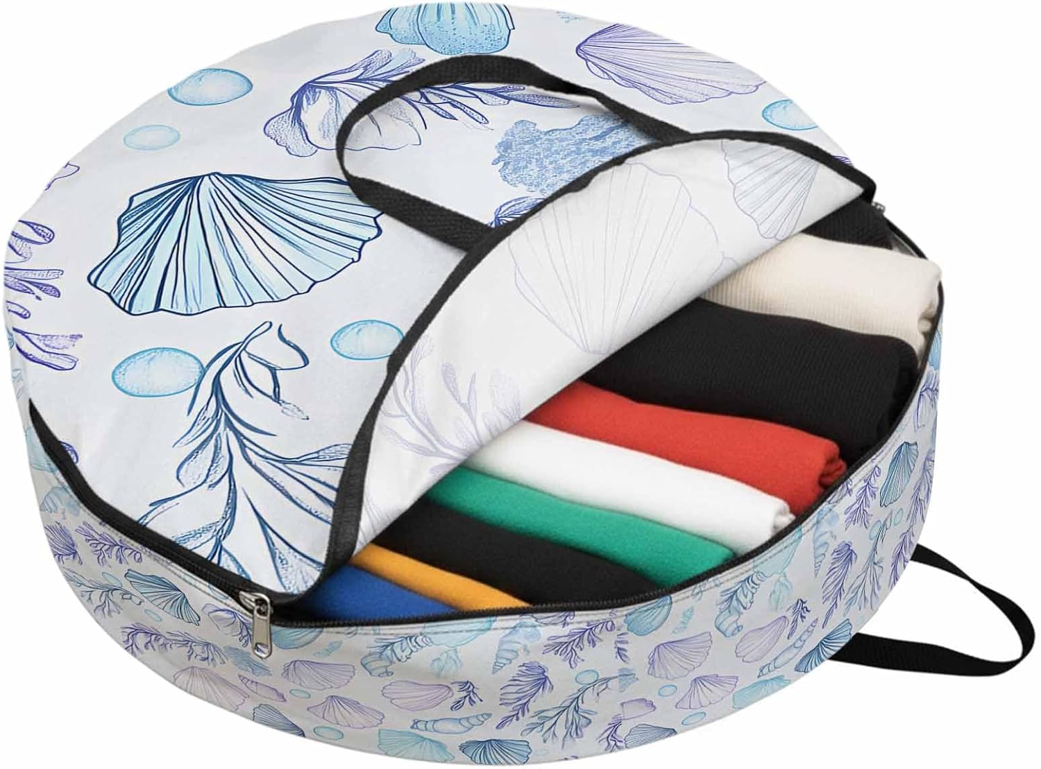 Reclaim Your Closet Space with the Round Storage Solution! Material: polyester Diameters: 24 inch, 30 inch, 36 inch Depth: 7 inches Package Includes: Round Storage Bag One Bag, Endless Possibilities: Whether you are swapping out your summer wardrobe, moving into a new dorm, or packing away holiday decorations, this bag has you covered. The circular design is uniquely suited for: Bedding: Comforters, quilts, sheet sets, and oversized pillows. Clothing: Winter coats, sweaters, and bulky ski gear. Home Decor: Holiday wreaths, garlands, and floral arrangements. Outdoor Gear: Camping blankets, sleeping bags, and beach towels. Dual Zippers: The high quality double zipper design allows the closet organizer to open wide from both sides, making it effortless to load and unload even the bulkiest comforters or wreaths. Reinforced Handles: Sturdy, reinforced handles are securely stitched to provide extra strength and a comfortable grip when carrying heavy loads or pulling the bag from under a bed. Clear Label Pocket: A transparent built-in label holder allows you to quickly identify the contents of each bag without ever having to unzip it, keeping your storage perfectly organized.