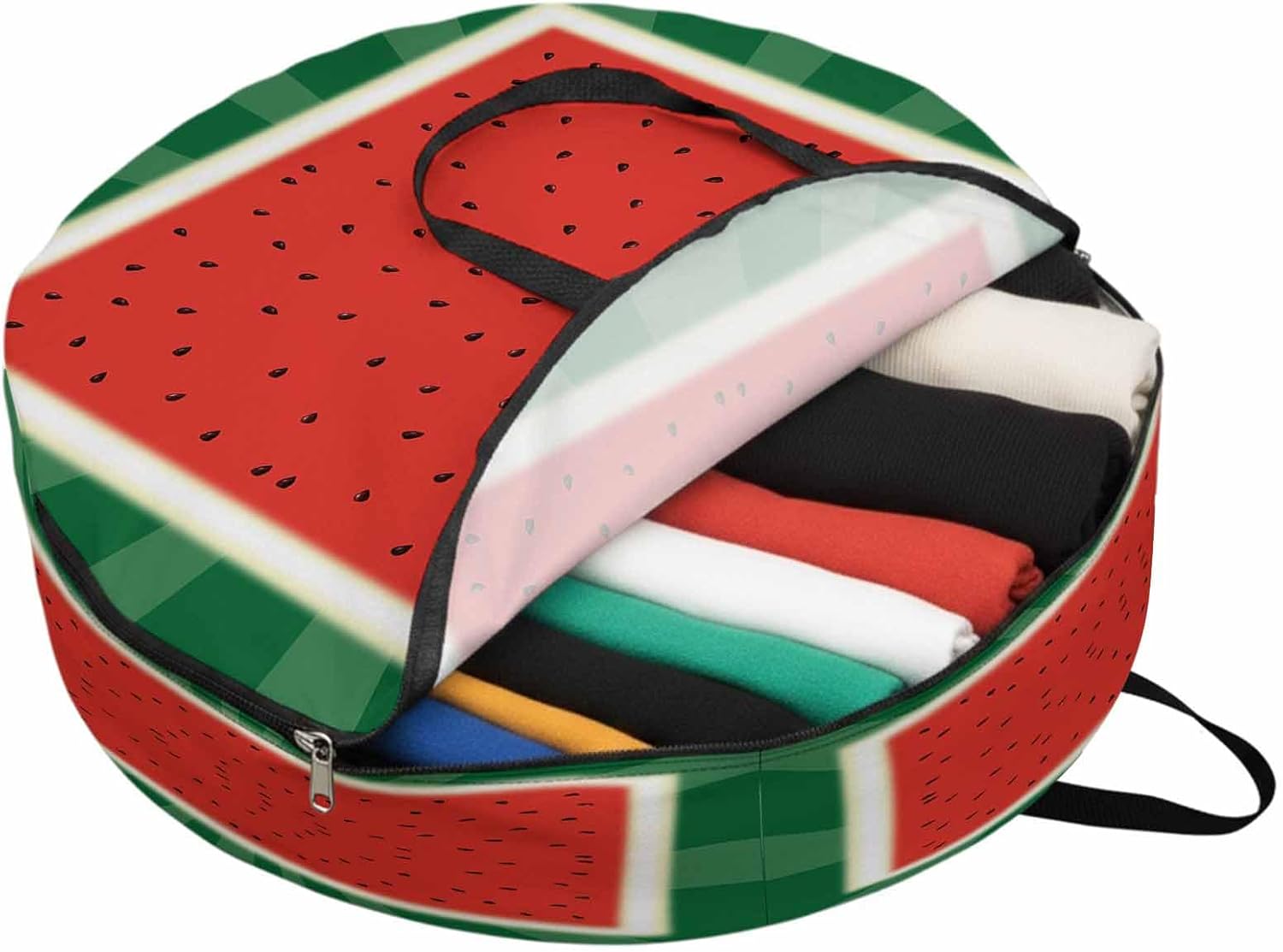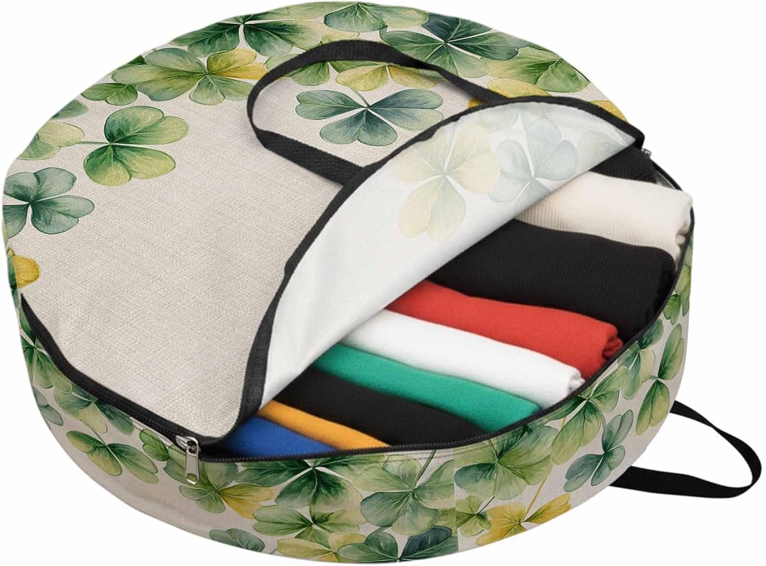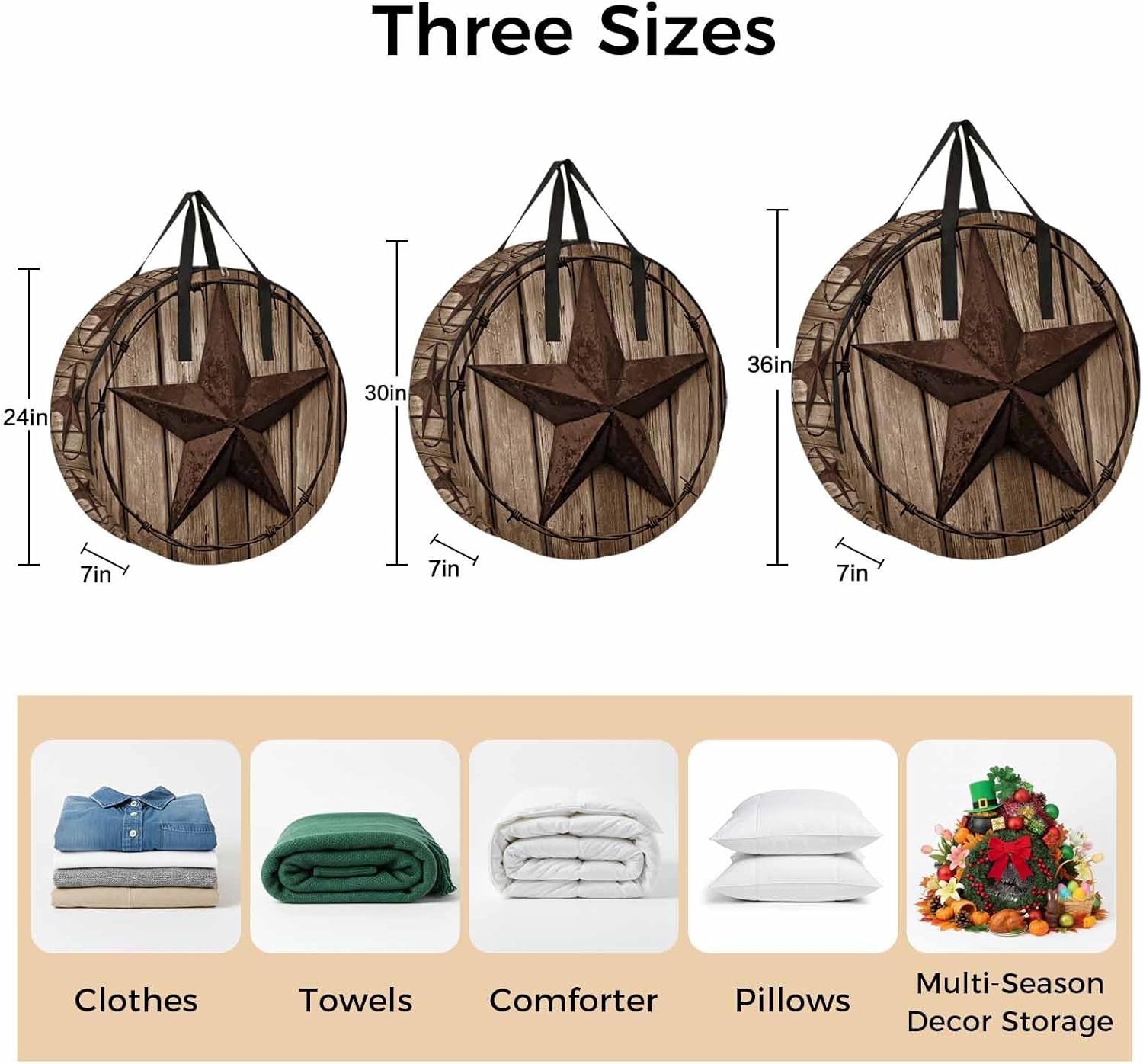 Reclaim Your Closet Space with the Round Storage Solution! Material: polyester Diameters: 24 inch, 30 inch, 36 inch Depth: 7 inches Package Includes: Round Storage Bag One Bag, Endless Possibilities: Whether you are swapping out your summer wardrobe, moving into a new dorm, or packing away holiday decorations, this bag has you covered. The circular design is uniquely suited for: Bedding: Comforters, quilts, sheet sets, and oversized pillows. Clothing: Winter coats, sweaters, and bulky ski gear. Home Decor: Holiday wreaths, garlands, and floral arrangements. Outdoor Gear: Camping blankets, sleeping bags, and beach towels. Dual Zippers: The high quality double zipper design allows the closet organizer to open wide from both sides, making it effortless to load and unload even the bulkiest comforters or wreaths. Reinforced Handles: Sturdy, reinforced handles are securely stitched to provide extra strength and a comfortable grip when carrying heavy loads or pulling the bag from under a bed. Clear Label Pocket: A transparent built-in label holder allows you to quickly identify the contents of each bag without ever having to unzip it, keeping your storage perfectly organized.