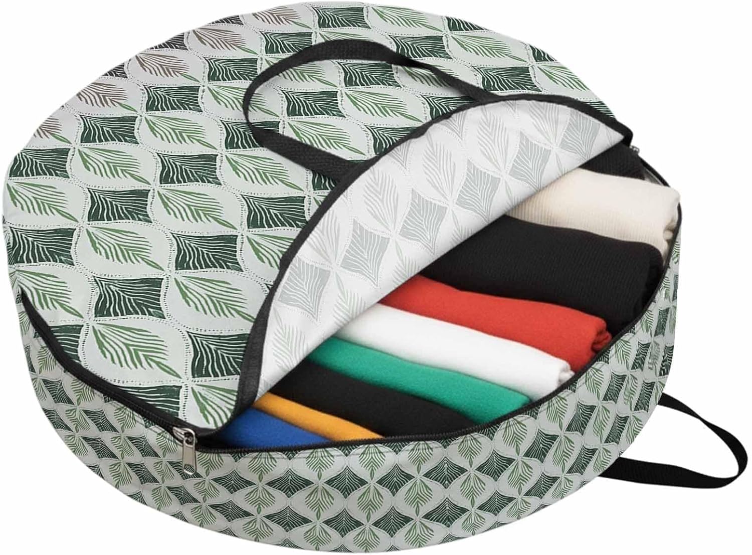Reclaim Your Closet Space with the Round Storage Solution! Material: polyester Diameters: 24 inch, 30 inch, 36 inch Depth: 7 inches Package Includes: Round Storage Bag One Bag, Endless Possibilities: Whether you are swapping out your summer wardrobe, moving into a new dorm, or packing away holiday decorations, this bag has you covered. The circular design is uniquely suited for: Bedding: Comforters, quilts, sheet sets, and oversized pillows. Clothing: Winter coats, sweaters, and bulky ski gear. Home Decor: Holiday wreaths, garlands, and floral arrangements. Outdoor Gear: Camping blankets, sleeping bags, and beach towels. Dual Zippers: The high quality double zipper design allows the closet organizer to open wide from both sides, making it effortless to load and unload even the bulkiest comforters or wreaths. Reinforced Handles: Sturdy, reinforced handles are securely stitched to provide extra strength and a comfortable grip when carrying heavy loads or pulling the bag from under a bed. Clear Label Pocket: A transparent built-in label holder allows you to quickly identify the contents of each bag without ever having to unzip it, keeping your storage perfectly organized.