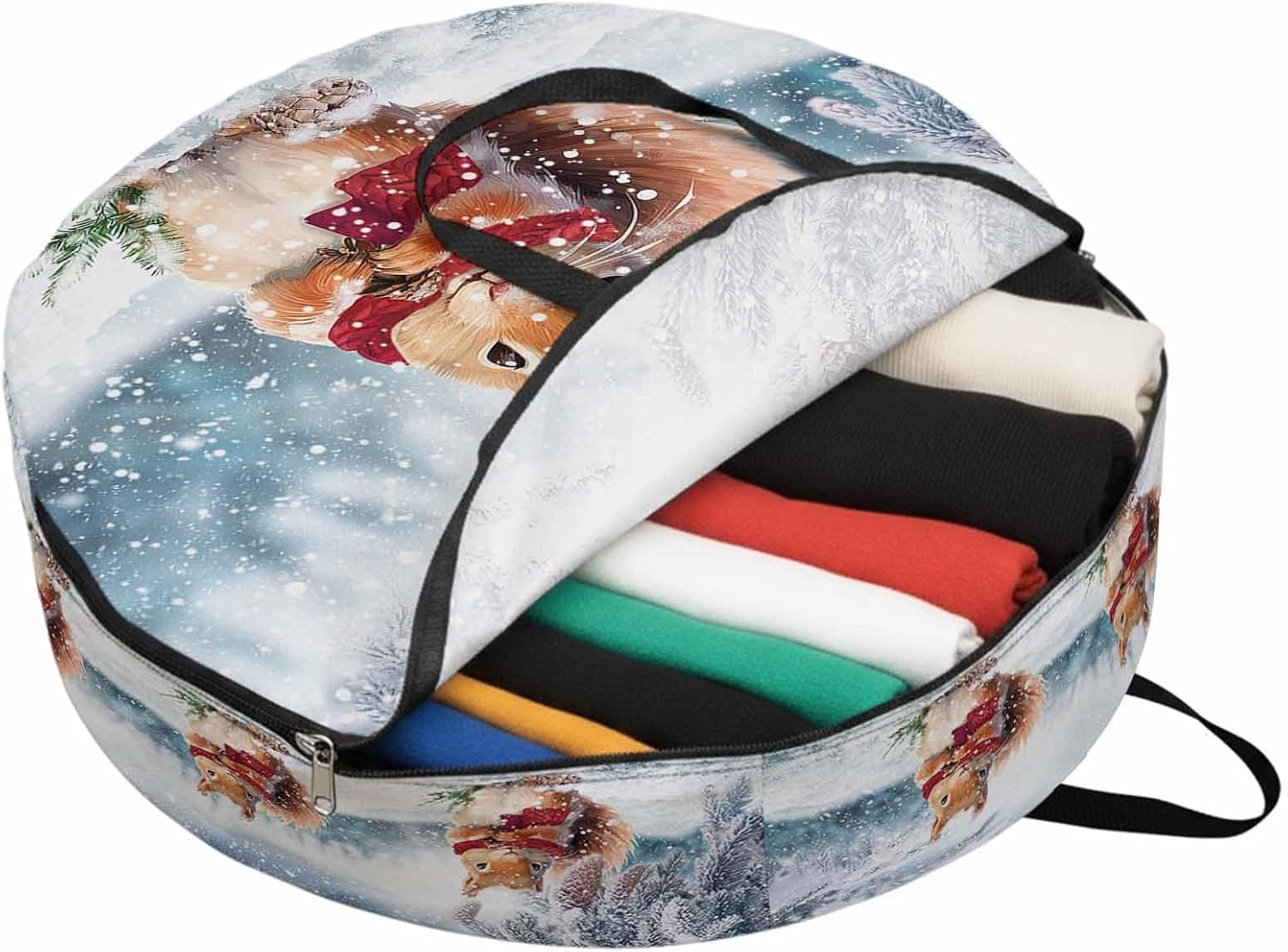 Reclaim Your Closet Space with the Round Storage Solution! Material: polyester Diameters: 24 inch, 30 inch, 36 inch Depth: 7 inches Package Includes: Round Storage Bag One Bag, Endless Possibilities: Whether you are swapping out your summer wardrobe, moving into a new dorm, or packing away holiday decorations, this bag has you covered. The circular design is uniquely suited for: Bedding: Comforters, quilts, sheet sets, and oversized pillows. Clothing: Winter coats, sweaters, and bulky ski gear. Home Decor: Holiday wreaths, garlands, and floral arrangements. Outdoor Gear: Camping blankets, sleeping bags, and beach towels. Dual Zippers: The high quality double zipper design allows the closet organizer to open wide from both sides, making it effortless to load and unload even the bulkiest comforters or wreaths. Reinforced Handles: Sturdy, reinforced handles are securely stitched to provide extra strength and a comfortable grip when carrying heavy loads or pulling the bag from under a bed. Clear Label Pocket: A transparent built-in label holder allows you to quickly identify the contents of each bag without ever having to unzip it, keeping your storage perfectly organized.