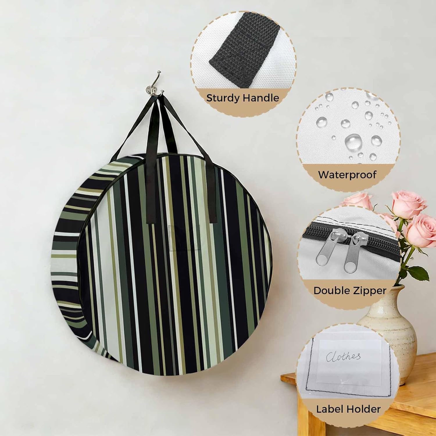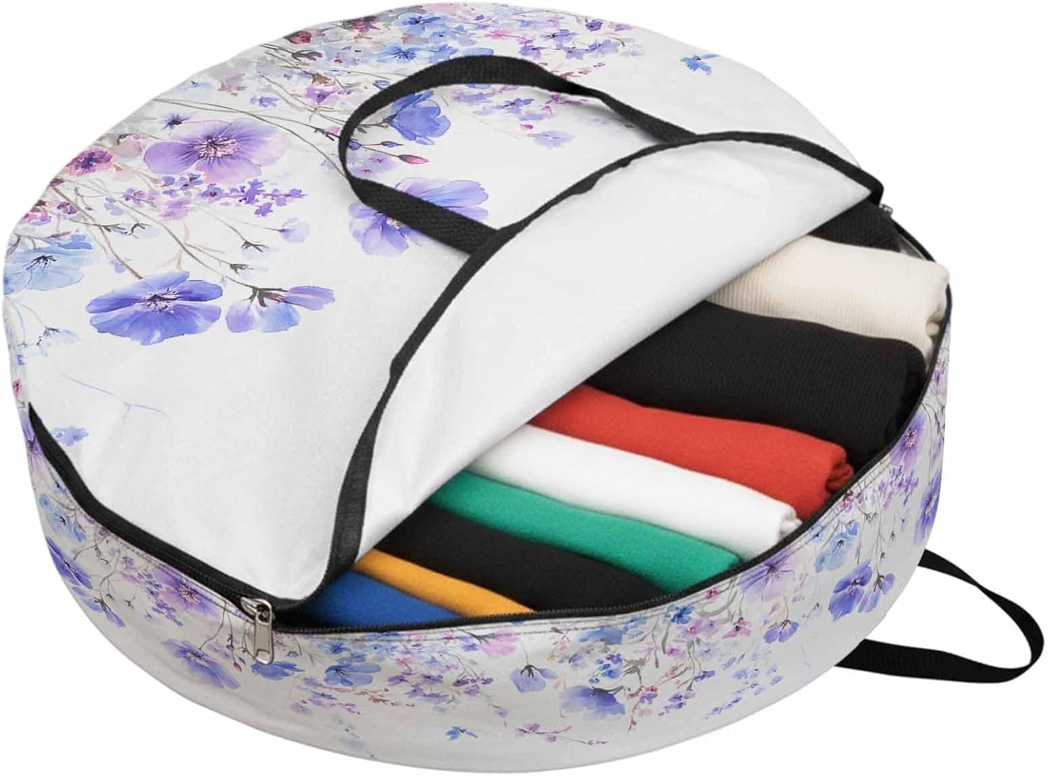 Reclaim Your Closet Space with the Round Storage Solution! Material: polyester Diameters: 24 inch, 30 inch, 36 inch Depth: 7 inches Package Includes: Round Storage Bag One Bag, Endless Possibilities: Whether you are swapping out your summer wardrobe, moving into a new dorm, or packing away holiday decorations, this bag has you covered. The circular design is uniquely suited for: Bedding: Comforters, quilts, sheet sets, and oversized pillows. Clothing: Winter coats, sweaters, and bulky ski gear. Home Decor: Holiday wreaths, garlands, and floral arrangements. Outdoor Gear: Camping blankets, sleeping bags, and beach towels. Dual Zippers: The high quality double zipper design allows the closet organizer to open wide from both sides, making it effortless to load and unload even the bulkiest comforters or wreaths. Reinforced Handles: Sturdy, reinforced handles are securely stitched to provide extra strength and a comfortable grip when carrying heavy loads or pulling the bag from under a bed. Clear Label Pocket: A transparent built-in label holder allows you to quickly identify the contents of each bag without ever having to unzip it, keeping your storage perfectly organized.
