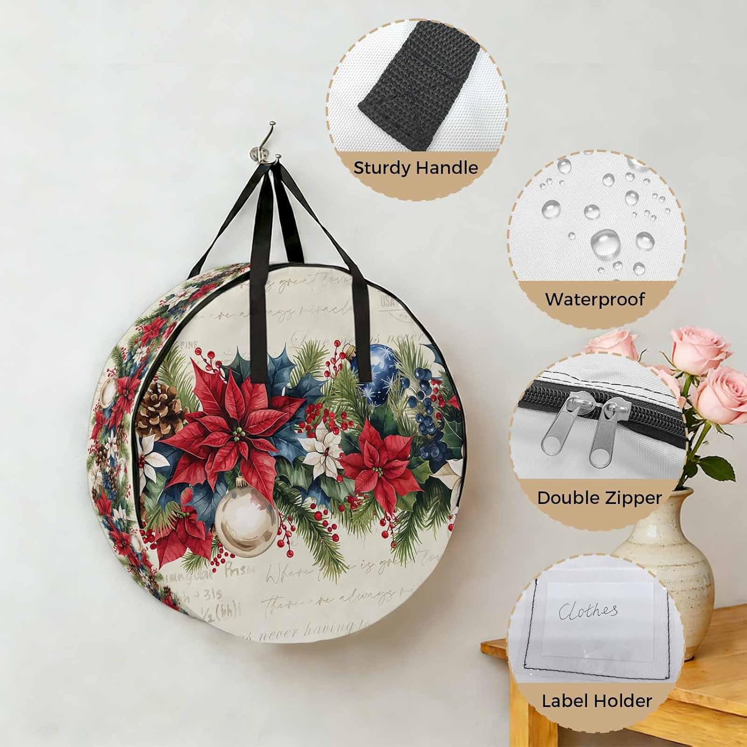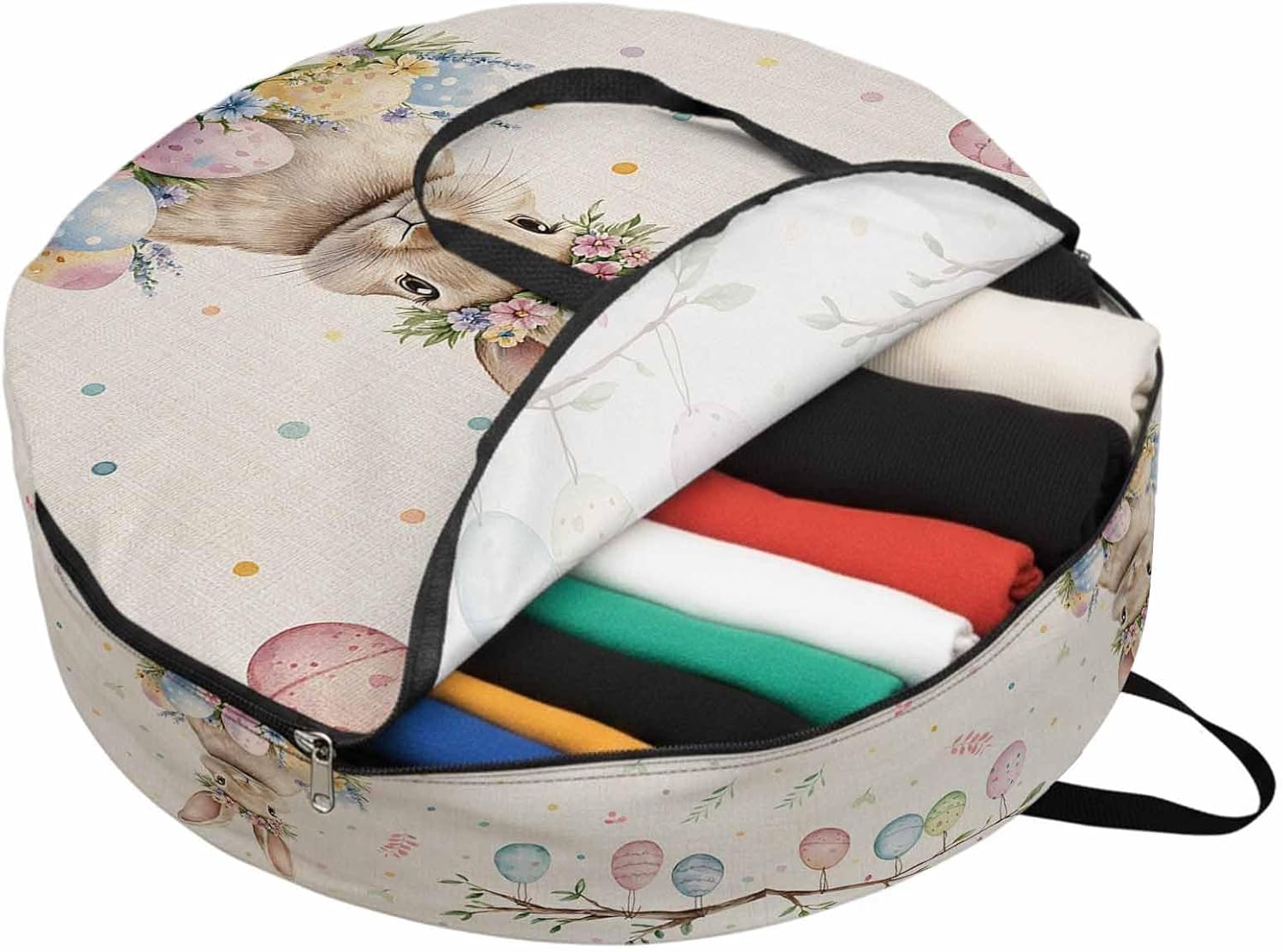 Reclaim Your Closet Space with the Round Storage Solution! Material: polyester Diameters: 24 inch, 30 inch, 36 inch Depth: 7 inches Package Includes: Round Storage Bag One Bag, Endless Possibilities: Whether you are swapping out your summer wardrobe, moving into a new dorm, or packing away holiday decorations, this bag has you covered. The circular design is uniquely suited for: Bedding: Comforters, quilts, sheet sets, and oversized pillows. Clothing: Winter coats, sweaters, and bulky ski gear. Home Decor: Holiday wreaths, garlands, and floral arrangements. Outdoor Gear: Camping blankets, sleeping bags, and beach towels. Dual Zippers: The high quality double zipper design allows the closet organizer to open wide from both sides, making it effortless to load and unload even the bulkiest comforters or wreaths. Reinforced Handles: Sturdy, reinforced handles are securely stitched to provide extra strength and a comfortable grip when carrying heavy loads or pulling the bag from under a bed. Clear Label Pocket: A transparent built-in label holder allows you to quickly identify the contents of each bag without ever having to unzip it, keeping your storage perfectly organized.