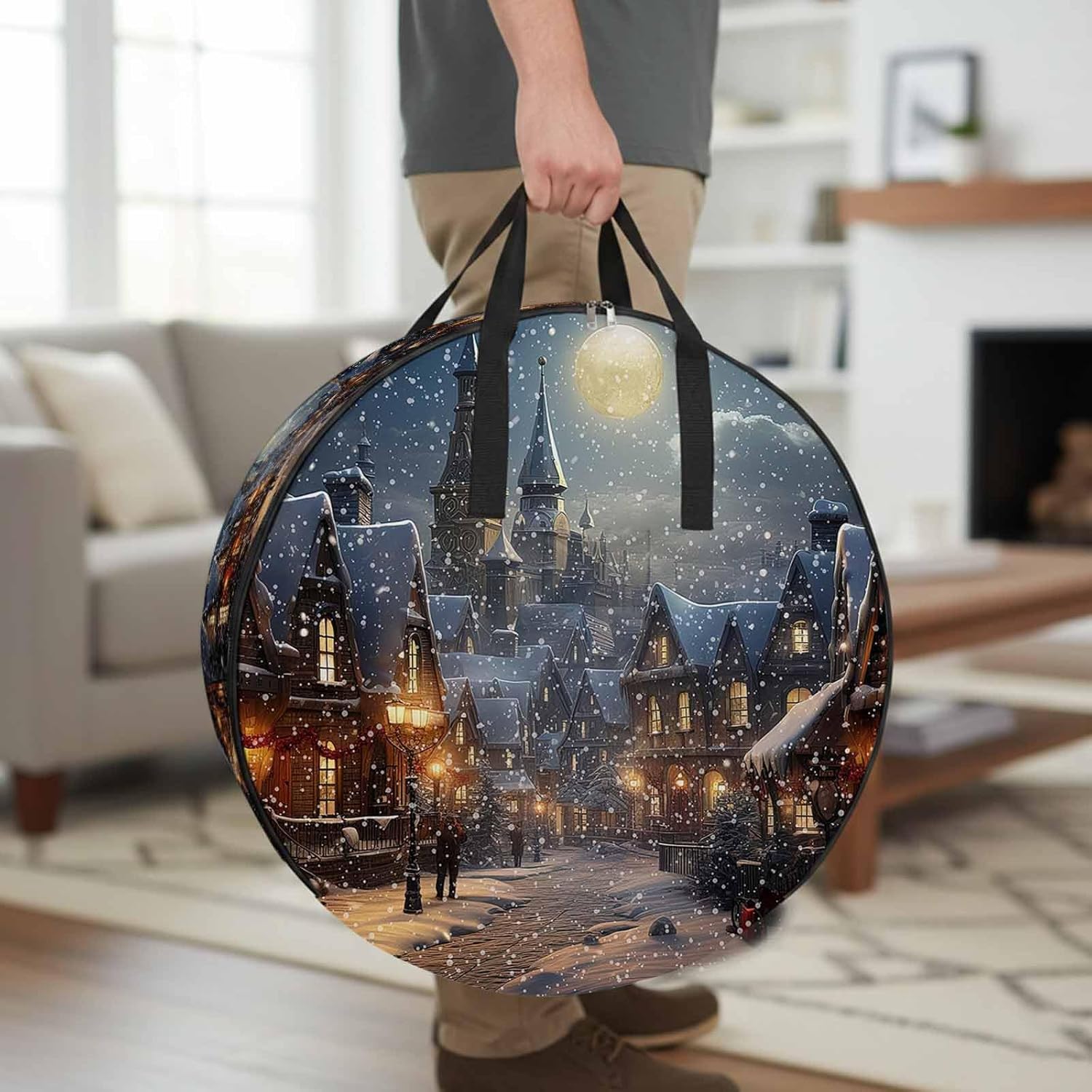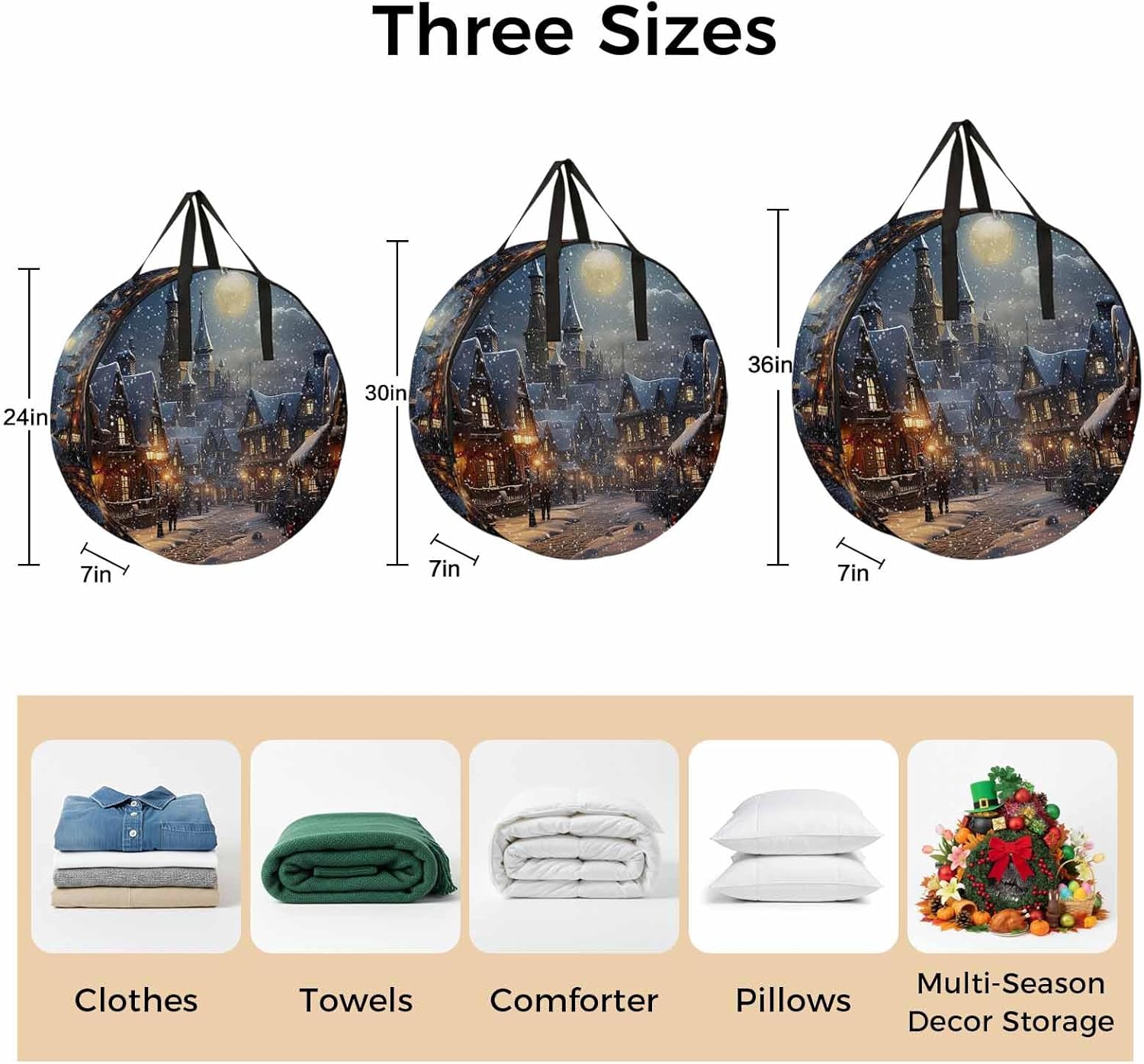 Reclaim Your Closet Space with the Round Storage Solution! Material: polyester Diameters: 24 inch, 30 inch, 36 inch Depth: 7 inches Package Includes: Round Storage Bag One Bag, Endless Possibilities: Whether you are swapping out your summer wardrobe, moving into a new dorm, or packing away holiday decorations, this bag has you covered. The circular design is uniquely suited for: Bedding: Comforters, quilts, sheet sets, and oversized pillows. Clothing: Winter coats, sweaters, and bulky ski gear. Home Decor: Holiday wreaths, garlands, and floral arrangements. Outdoor Gear: Camping blankets, sleeping bags, and beach towels. Dual Zippers: The high quality double zipper design allows the closet organizer to open wide from both sides, making it effortless to load and unload even the bulkiest comforters or wreaths. Reinforced Handles: Sturdy, reinforced handles are securely stitched to provide extra strength and a comfortable grip when carrying heavy loads or pulling the bag from under a bed. Clear Label Pocket: A transparent built-in label holder allows you to quickly identify the contents of each bag without ever having to unzip it, keeping your storage perfectly organized.