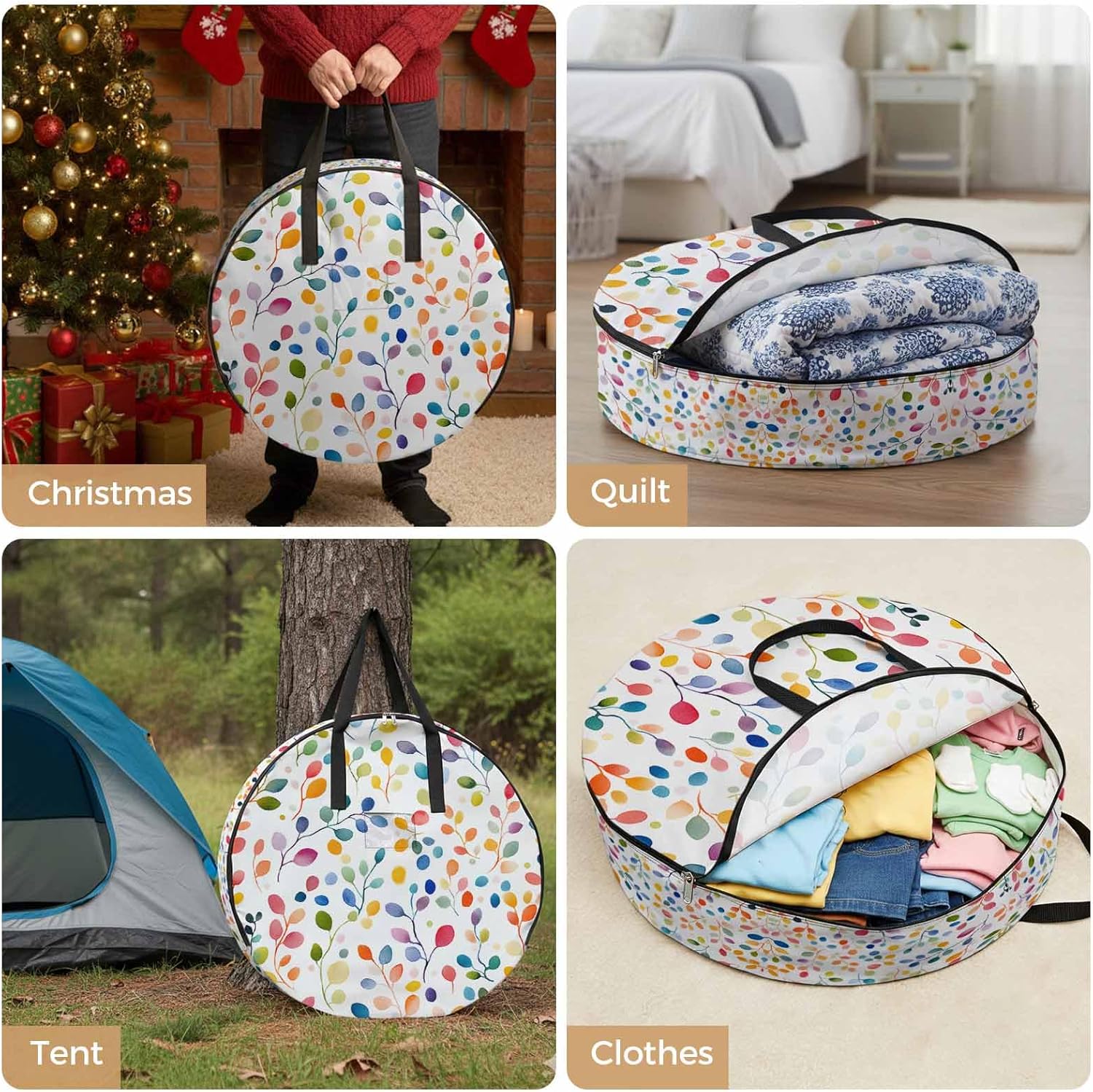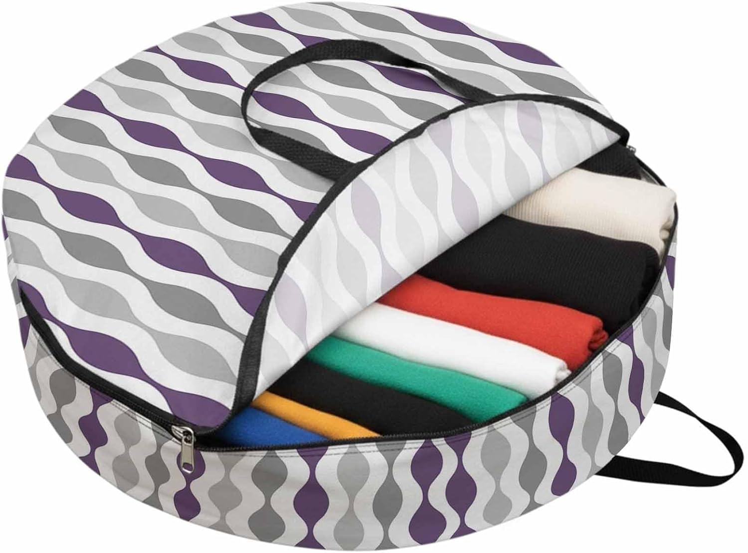 Reclaim Your Closet Space with the Round Storage Solution! Material: polyester Diameters: 24 inch, 30 inch, 36 inch Depth: 7 inches Package Includes: Round Storage Bag One Bag, Endless Possibilities: Whether you are swapping out your summer wardrobe, moving into a new dorm, or packing away holiday decorations, this bag has you covered. The circular design is uniquely suited for: Bedding: Comforters, quilts, sheet sets, and oversized pillows. Clothing: Winter coats, sweaters, and bulky ski gear. Home Decor: Holiday wreaths, garlands, and floral arrangements. Outdoor Gear: Camping blankets, sleeping bags, and beach towels. Dual Zippers: The high quality double zipper design allows the closet organizer to open wide from both sides, making it effortless to load and unload even the bulkiest comforters or wreaths. Reinforced Handles: Sturdy, reinforced handles are securely stitched to provide extra strength and a comfortable grip when carrying heavy loads or pulling the bag from under a bed. Clear Label Pocket: A transparent built-in label holder allows you to quickly identify the contents of each bag without ever having to unzip it, keeping your storage perfectly organized.