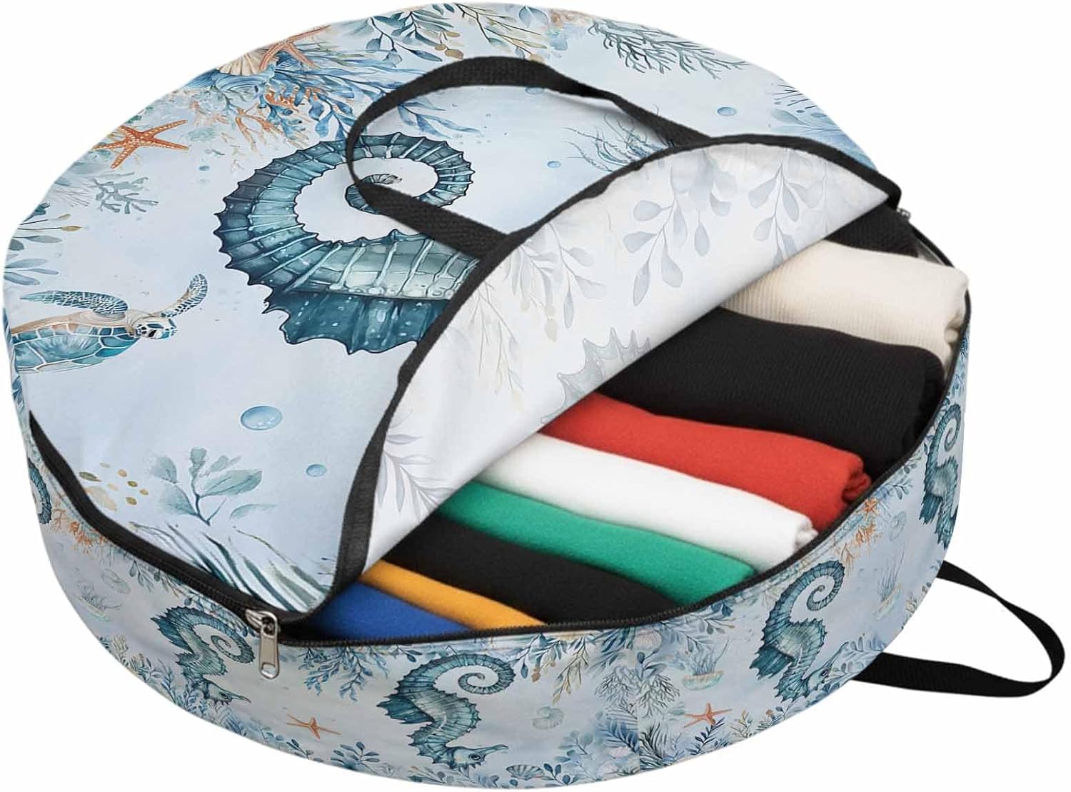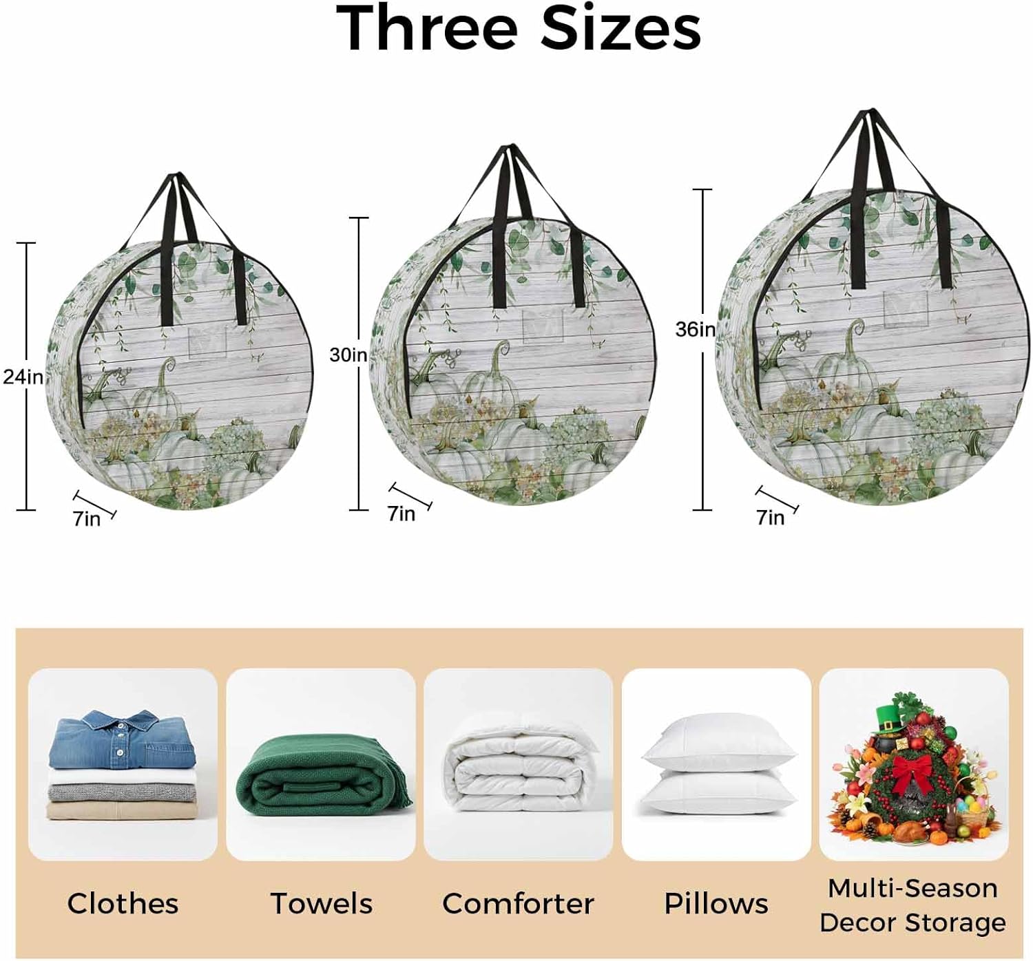 Reclaim Your Closet Space with the Round Storage Solution! Material: polyester Diameters: 24 inch, 30 inch, 36 inch Depth: 7 inches Package Includes: Round Storage Bag One Bag, Endless Possibilities: Whether you are swapping out your summer wardrobe, moving into a new dorm, or packing away holiday decorations, this bag has you covered. The circular design is uniquely suited for: Bedding: Comforters, quilts, sheet sets, and oversized pillows. Clothing: Winter coats, sweaters, and bulky ski gear. Home Decor: Holiday wreaths, garlands, and floral arrangements. Outdoor Gear: Camping blankets, sleeping bags, and beach towels. Dual Zippers: The high quality double zipper design allows the closet organizer to open wide from both sides, making it effortless to load and unload even the bulkiest comforters or wreaths. Reinforced Handles: Sturdy, reinforced handles are securely stitched to provide extra strength and a comfortable grip when carrying heavy loads or pulling the bag from under a bed. Clear Label Pocket: A transparent built-in label holder allows you to quickly identify the contents of each bag without ever having to unzip it, keeping your storage perfectly organized.