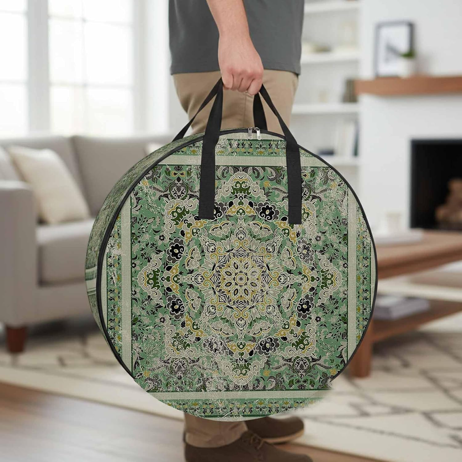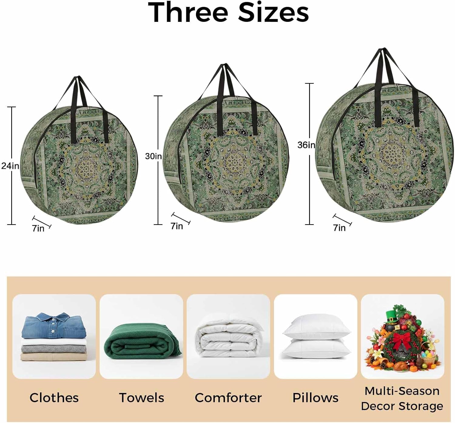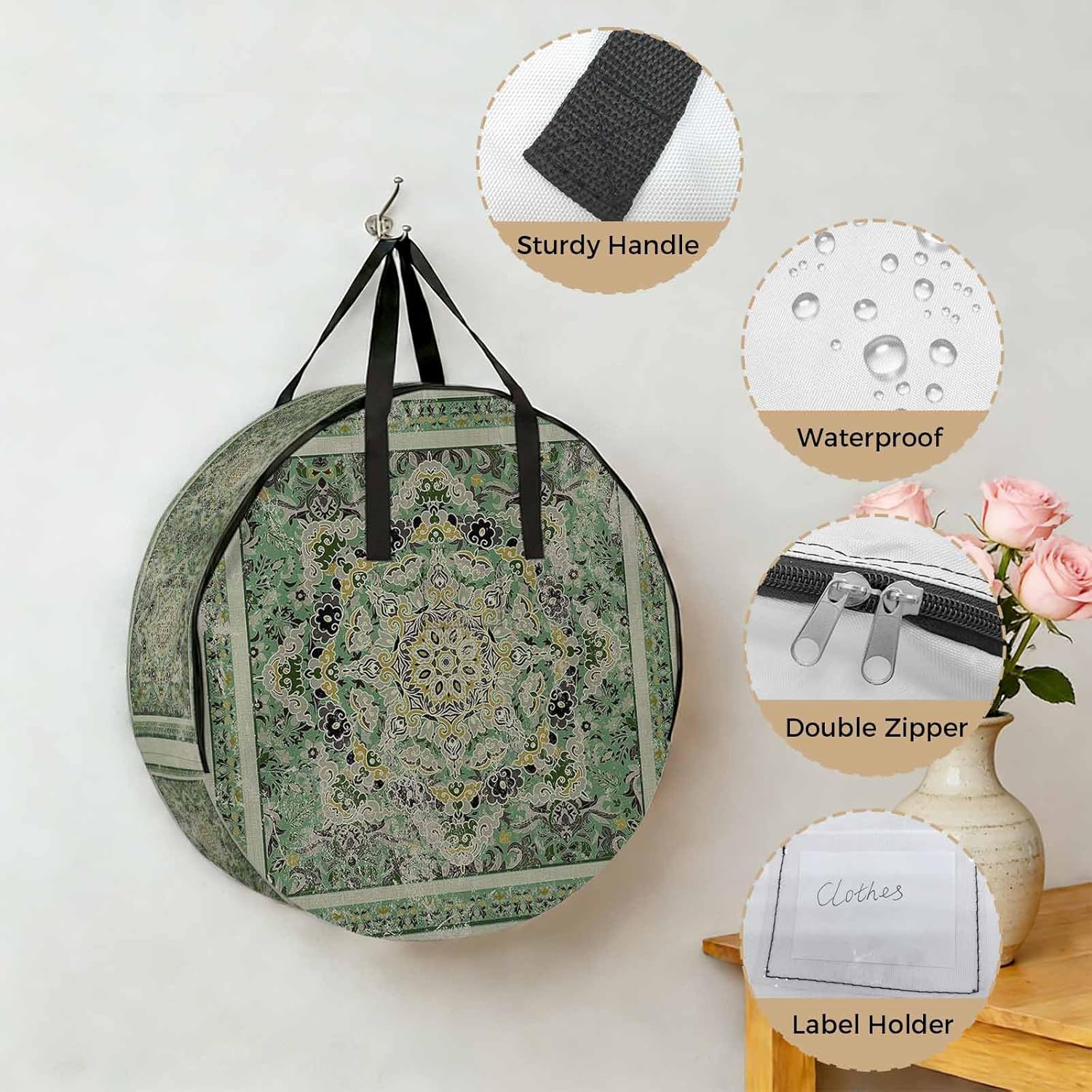 Reclaim Your Closet Space with the Round Storage Solution! Material: polyester Diameters: 24 inch, 30 inch, 36 inch Depth: 7 inches Package Includes: Round Storage Bag One Bag, Endless Possibilities: Whether you are swapping out your summer wardrobe, moving into a new dorm, or packing away holiday decorations, this bag has you covered. The circular design is uniquely suited for: Bedding: Comforters, quilts, sheet sets, and oversized pillows. Clothing: Winter coats, sweaters, and bulky ski gear. Home Decor: Holiday wreaths, garlands, and floral arrangements. Outdoor Gear: Camping blankets, sleeping bags, and beach towels. Dual Zippers: The high quality double zipper design allows the closet organizer to open wide from both sides, making it effortless to load and unload even the bulkiest comforters or wreaths. Reinforced Handles: Sturdy, reinforced handles are securely stitched to provide extra strength and a comfortable grip when carrying heavy loads or pulling the bag from under a bed. Clear Label Pocket: A transparent built-in label holder allows you to quickly identify the contents of each bag without ever having to unzip it, keeping your storage perfectly organized.