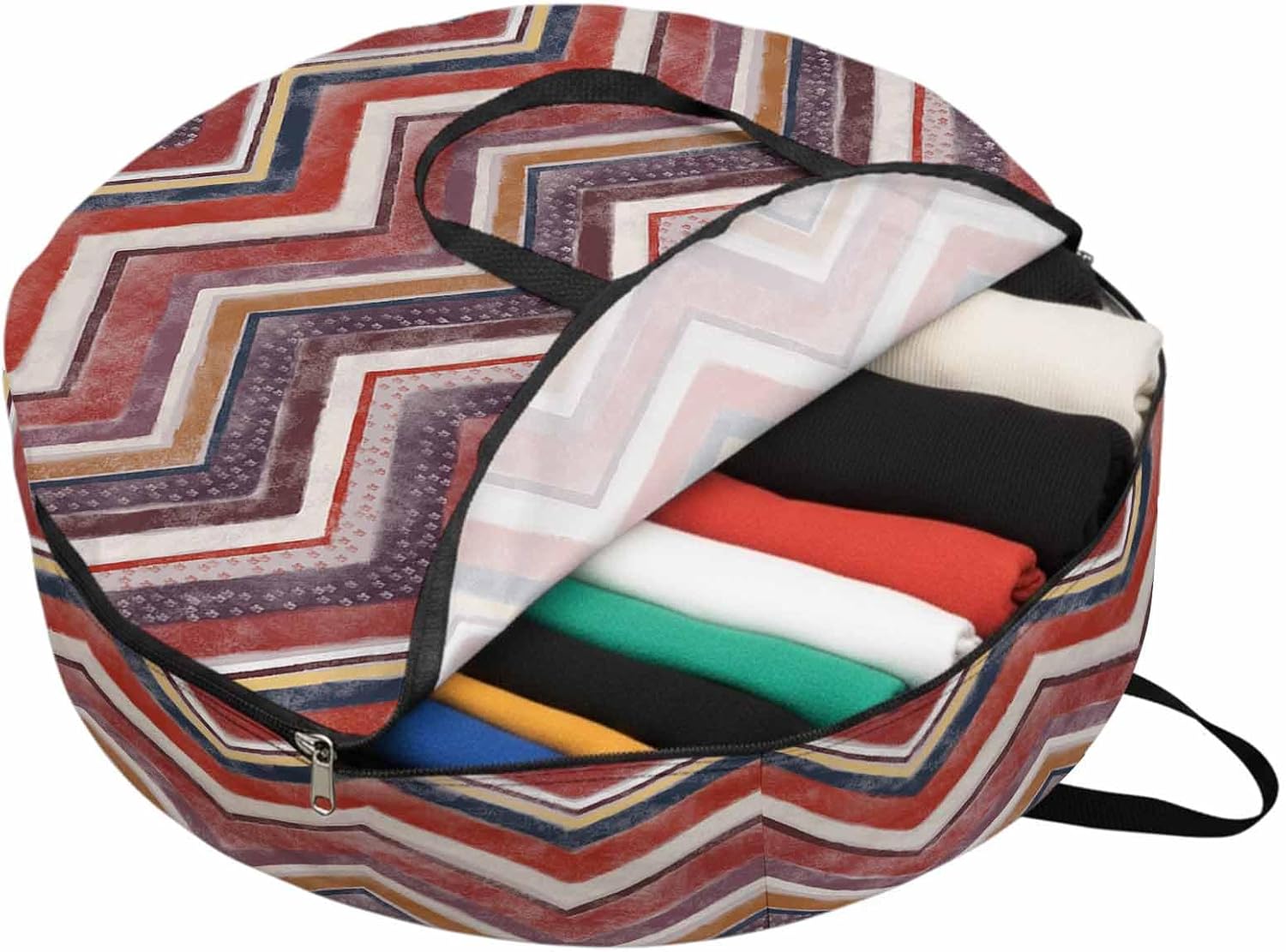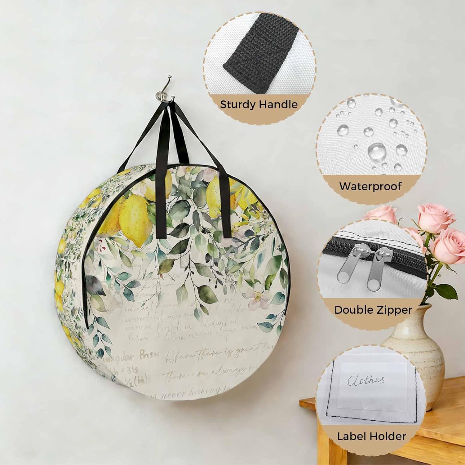 Reclaim Your Closet Space with the Round Storage Solution! Material: polyester Diameters: 24 inch, 30 inch, 36 inch Depth: 7 inches Package Includes: Round Storage Bag One Bag, Endless Possibilities: Whether you are swapping out your summer wardrobe, moving into a new dorm, or packing away holiday decorations, this bag has you covered. The circular design is uniquely suited for: Bedding: Comforters, quilts, sheet sets, and oversized pillows. Clothing: Winter coats, sweaters, and bulky ski gear. Home Decor: Holiday wreaths, garlands, and floral arrangements. Outdoor Gear: Camping blankets, sleeping bags, and beach towels. Dual Zippers: The high quality double zipper design allows the closet organizer to open wide from both sides, making it effortless to load and unload even the bulkiest comforters or wreaths. Reinforced Handles: Sturdy, reinforced handles are securely stitched to provide extra strength and a comfortable grip when carrying heavy loads or pulling the bag from under a bed. Clear Label Pocket: A transparent built-in label holder allows you to quickly identify the contents of each bag without ever having to unzip it, keeping your storage perfectly organized.