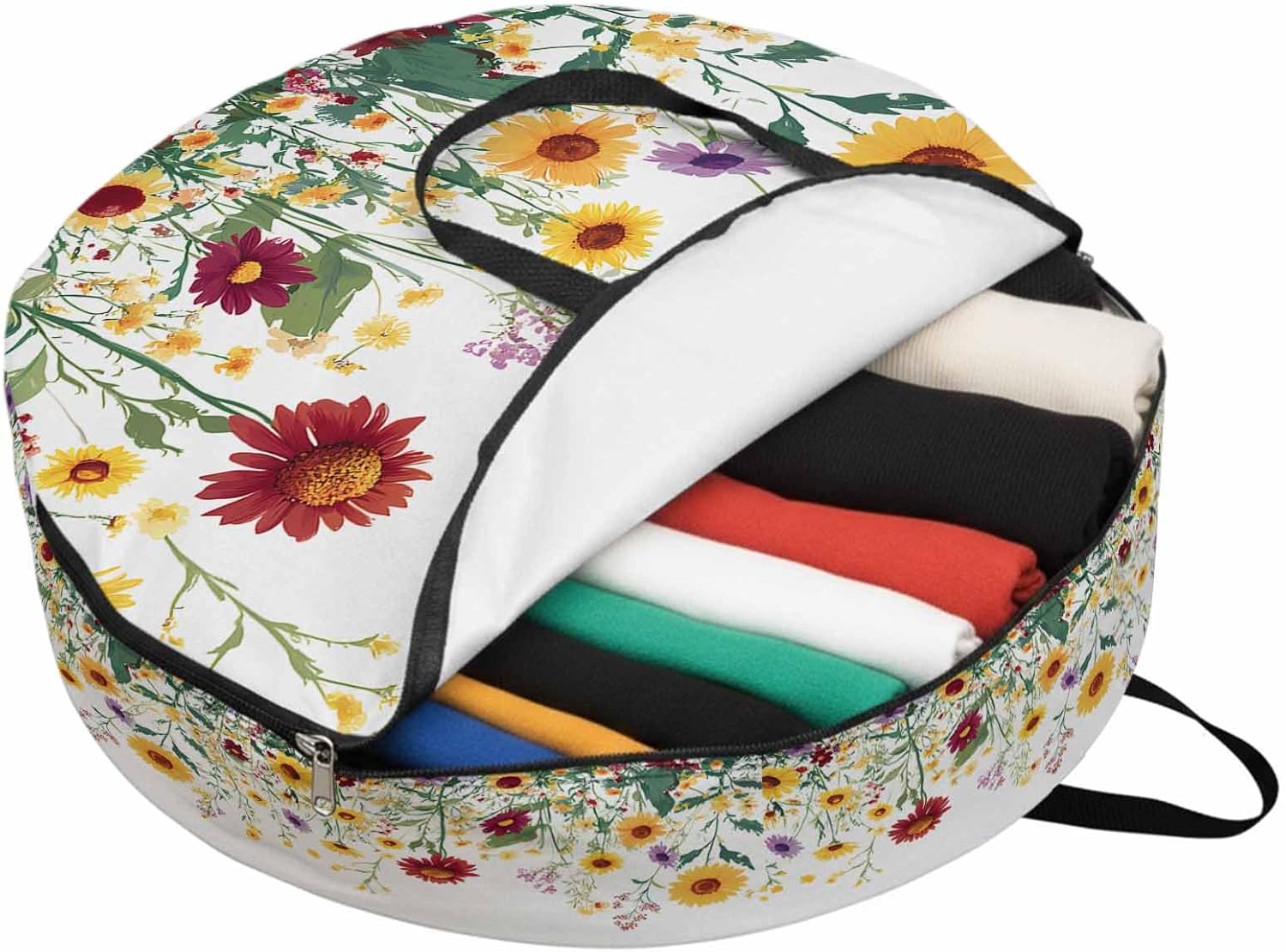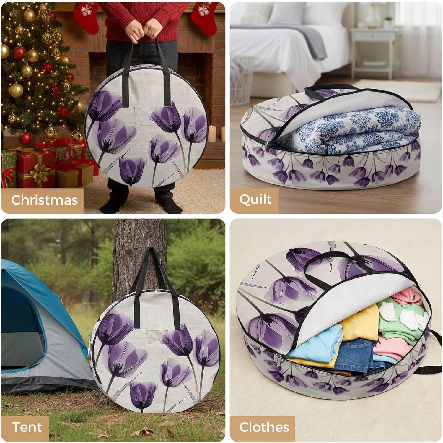 Reclaim Your Closet Space with the Round Storage Solution! Material: polyester Diameters: 24 inch, 30 inch, 36 inch Depth: 7 inches Package Includes: Round Storage Bag One Bag, Endless Possibilities: Whether you are swapping out your summer wardrobe, moving into a new dorm, or packing away holiday decorations, this bag has you covered. The circular design is uniquely suited for: Bedding: Comforters, quilts, sheet sets, and oversized pillows. Clothing: Winter coats, sweaters, and bulky ski gear. Home Decor: Holiday wreaths, garlands, and floral arrangements. Outdoor Gear: Camping blankets, sleeping bags, and beach towels. Dual Zippers: The high quality double zipper design allows the closet organizer to open wide from both sides, making it effortless to load and unload even the bulkiest comforters or wreaths. Reinforced Handles: Sturdy, reinforced handles are securely stitched to provide extra strength and a comfortable grip when carrying heavy loads or pulling the bag from under a bed. Clear Label Pocket: A transparent built-in label holder allows you to quickly identify the contents of each bag without ever having to unzip it, keeping your storage perfectly organized.