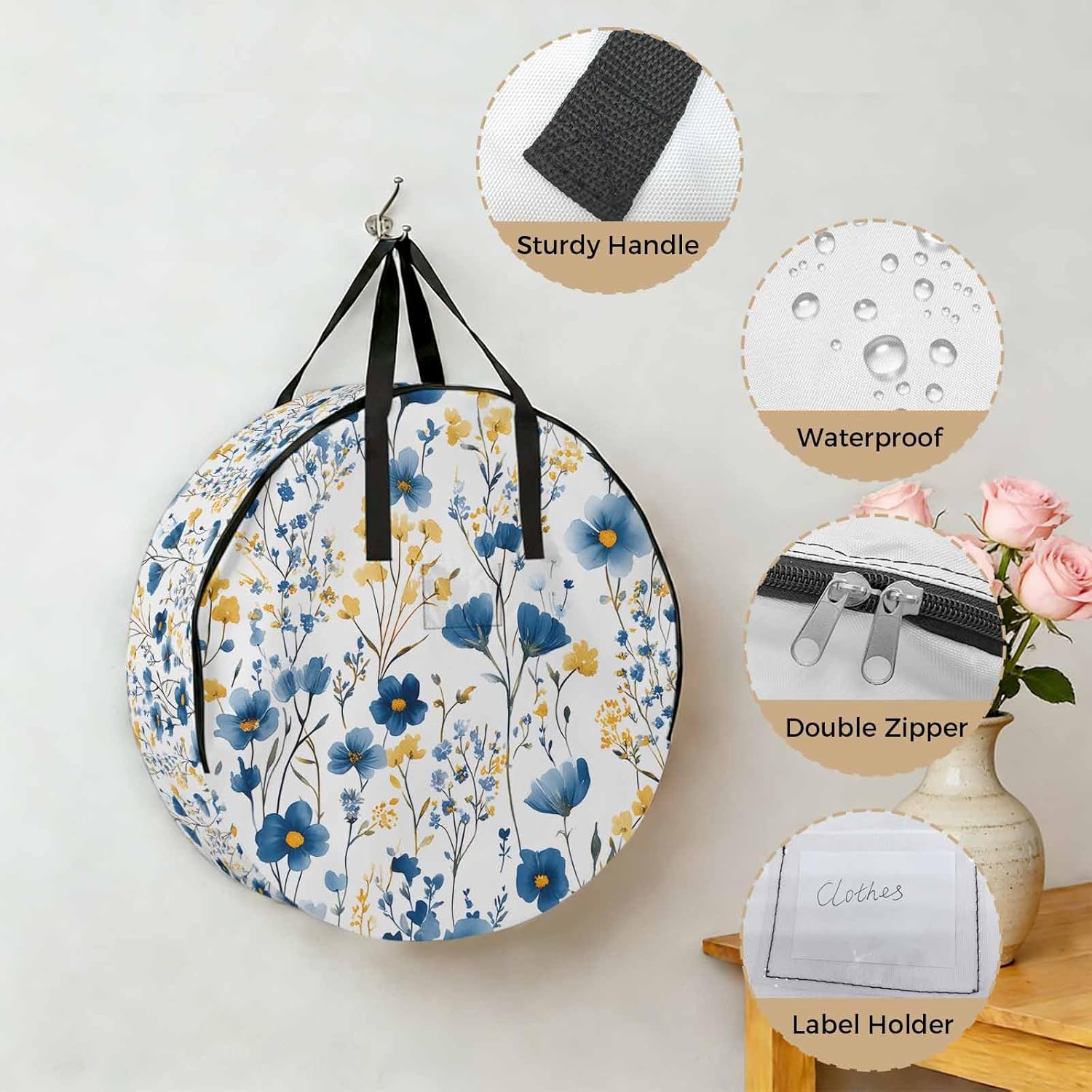 Reclaim Your Closet Space with the Round Storage Solution! Material: polyester Diameters: 24 inch, 30 inch, 36 inch Depth: 7 inches Package Includes: Round Storage Bag One Bag, Endless Possibilities: Whether you are swapping out your summer wardrobe, moving into a new dorm, or packing away holiday decorations, this bag has you covered. The circular design is uniquely suited for: Bedding: Comforters, quilts, sheet sets, and oversized pillows. Clothing: Winter coats, sweaters, and bulky ski gear. Home Decor: Holiday wreaths, garlands, and floral arrangements. Outdoor Gear: Camping blankets, sleeping bags, and beach towels. Dual Zippers: The high quality double zipper design allows the closet organizer to open wide from both sides, making it effortless to load and unload even the bulkiest comforters or wreaths. Reinforced Handles: Sturdy, reinforced handles are securely stitched to provide extra strength and a comfortable grip when carrying heavy loads or pulling the bag from under a bed. Clear Label Pocket: A transparent built-in label holder allows you to quickly identify the contents of each bag without ever having to unzip it, keeping your storage perfectly organized.