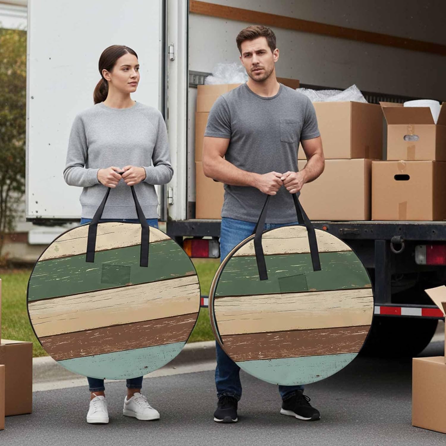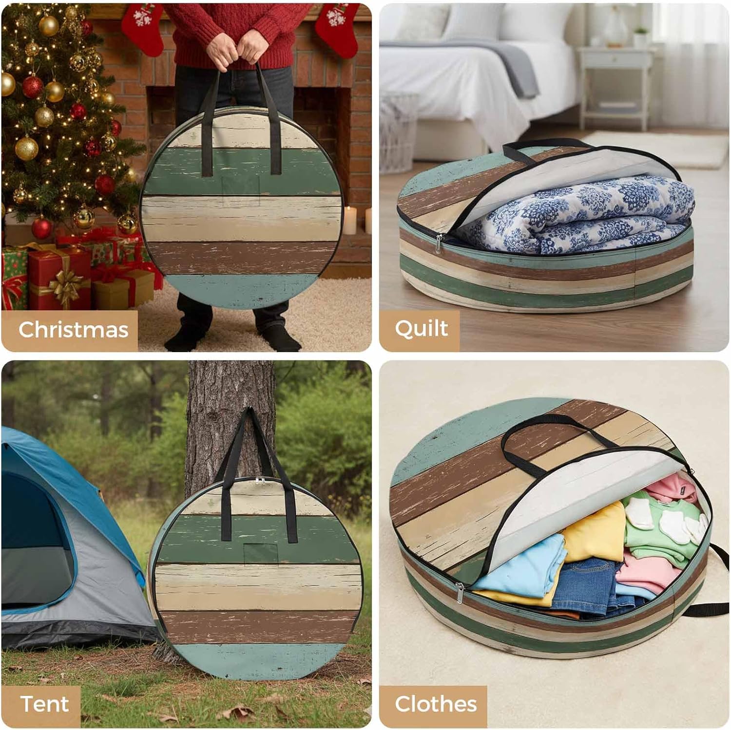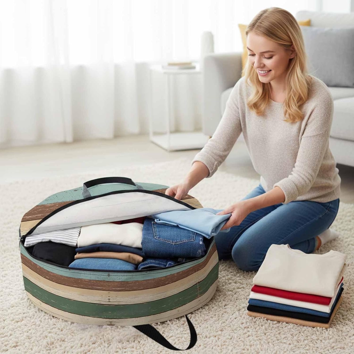 Reclaim Your Closet Space with the Round Storage Solution! Material: polyester Diameters: 24 inch, 30 inch, 36 inch Depth: 7 inches Package Includes: Round Storage Bag One Bag, Endless Possibilities: Whether you are swapping out your summer wardrobe, moving into a new dorm, or packing away holiday decorations, this bag has you covered. The circular design is uniquely suited for: Bedding: Comforters, quilts, sheet sets, and oversized pillows. Clothing: Winter coats, sweaters, and bulky ski gear. Home Decor: Holiday wreaths, garlands, and floral arrangements. Outdoor Gear: Camping blankets, sleeping bags, and beach towels. Dual Zippers: The high quality double zipper design allows the closet organizer to open wide from both sides, making it effortless to load and unload even the bulkiest comforters or wreaths. Reinforced Handles: Sturdy, reinforced handles are securely stitched to provide extra strength and a comfortable grip when carrying heavy loads or pulling the bag from under a bed. Clear Label Pocket: A transparent built-in label holder allows you to quickly identify the contents of each bag without ever having to unzip it, keeping your storage perfectly organized.