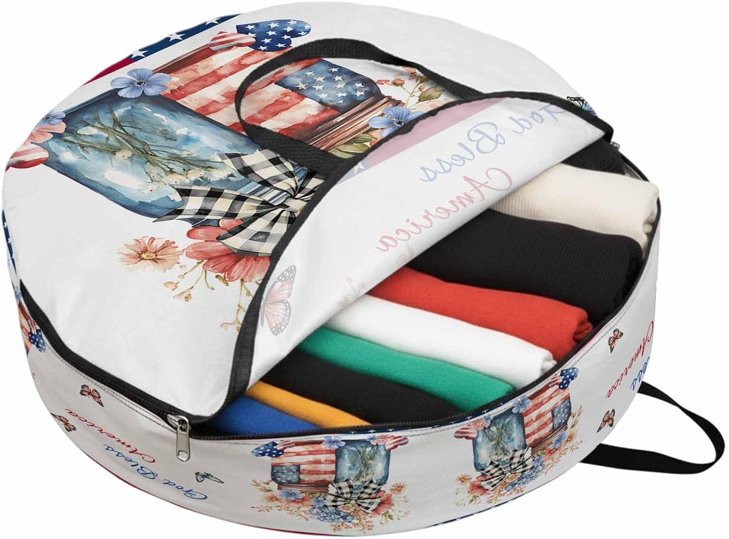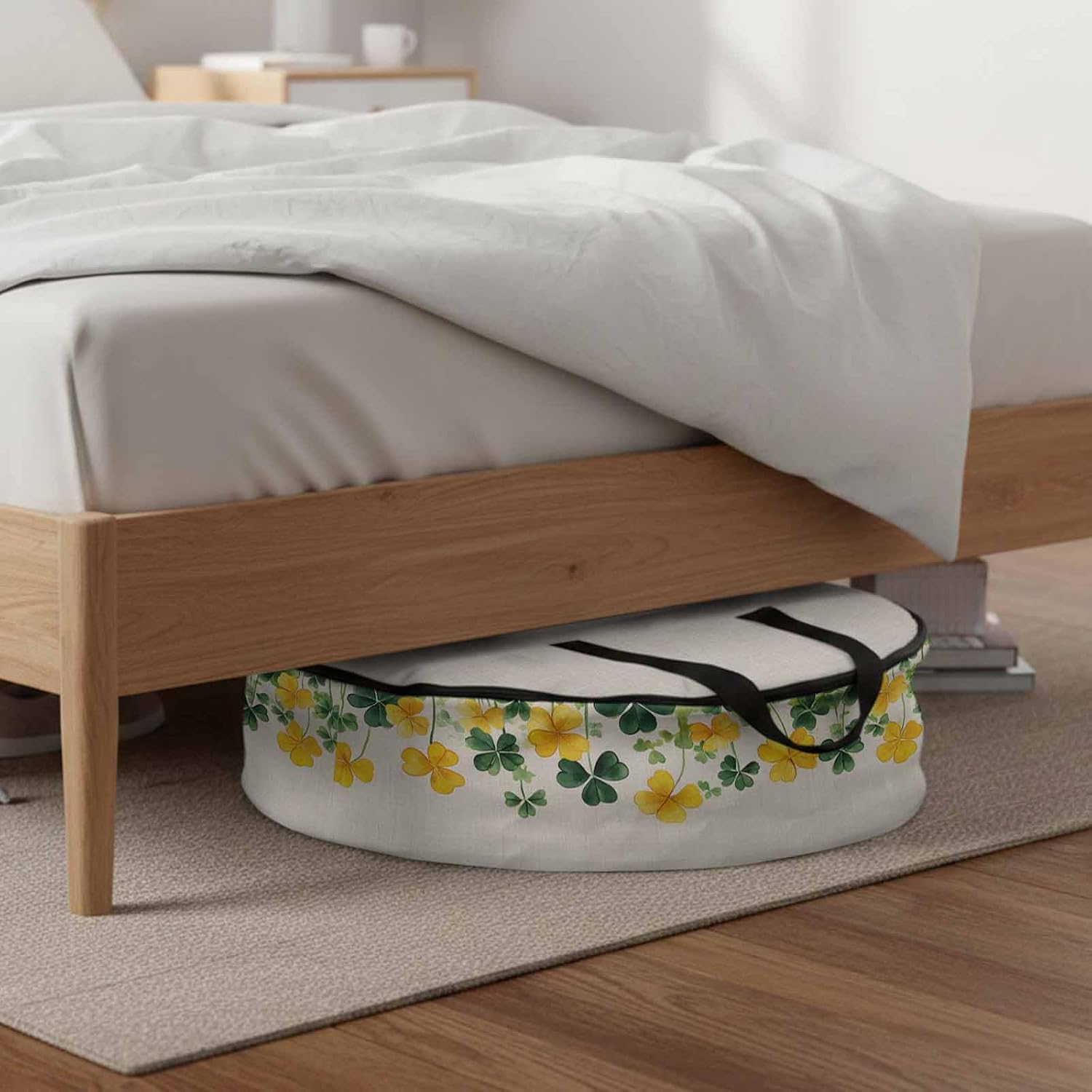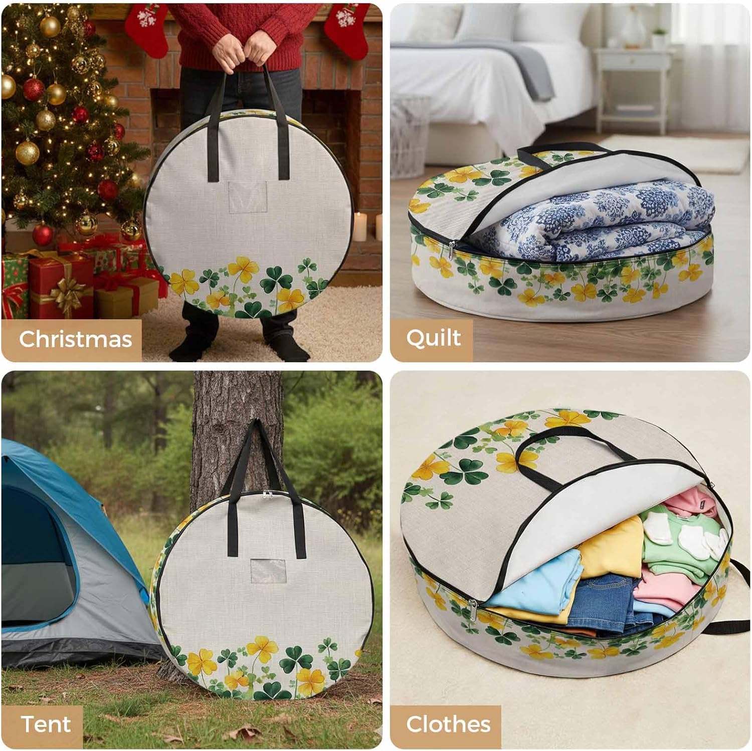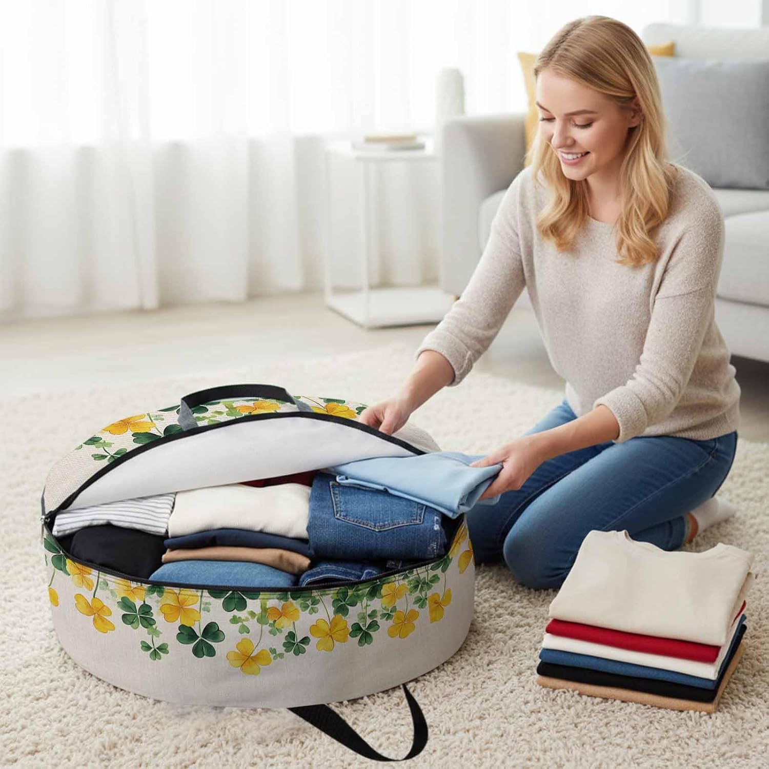 Reclaim Your Closet Space with the Round Storage Solution! Material: polyester Diameters: 24 inch, 30 inch, 36 inch Depth: 7 inches Package Includes: Round Storage Bag One Bag, Endless Possibilities: Whether you are swapping out your summer wardrobe, moving into a new dorm, or packing away holiday decorations, this bag has you covered. The circular design is uniquely suited for: Bedding: Comforters, quilts, sheet sets, and oversized pillows. Clothing: Winter coats, sweaters, and bulky ski gear. Home Decor: Holiday wreaths, garlands, and floral arrangements. Outdoor Gear: Camping blankets, sleeping bags, and beach towels. Dual Zippers: The high quality double zipper design allows the closet organizer to open wide from both sides, making it effortless to load and unload even the bulkiest comforters or wreaths. Reinforced Handles: Sturdy, reinforced handles are securely stitched to provide extra strength and a comfortable grip when carrying heavy loads or pulling the bag from under a bed. Clear Label Pocket: A transparent built-in label holder allows you to quickly identify the contents of each bag without ever having to unzip it, keeping your storage perfectly organized.