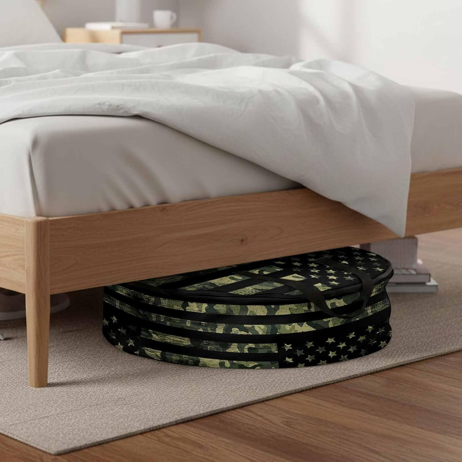 Reclaim Your Closet Space with the Round Storage Solution! Material: polyester Diameters: 24 inch, 30 inch, 36 inch Depth: 7 inches Package Includes: Round Storage Bag One Bag, Endless Possibilities: Whether you are swapping out your summer wardrobe, moving into a new dorm, or packing away holiday decorations, this bag has you covered. The circular design is uniquely suited for: Bedding: Comforters, quilts, sheet sets, and oversized pillows. Clothing: Winter coats, sweaters, and bulky ski gear. Home Decor: Holiday wreaths, garlands, and floral arrangements. Outdoor Gear: Camping blankets, sleeping bags, and beach towels. Dual Zippers: The high quality double zipper design allows the closet organizer to open wide from both sides, making it effortless to load and unload even the bulkiest comforters or wreaths. Reinforced Handles: Sturdy, reinforced handles are securely stitched to provide extra strength and a comfortable grip when carrying heavy loads or pulling the bag from under a bed. Clear Label Pocket: A transparent built-in label holder allows you to quickly identify the contents of each bag without ever having to unzip it, keeping your storage perfectly organized.