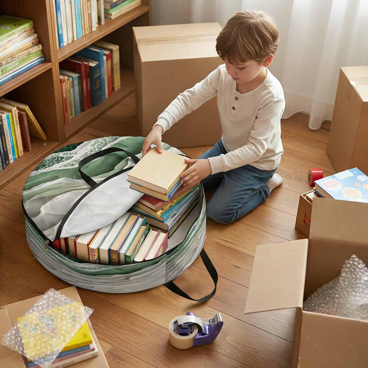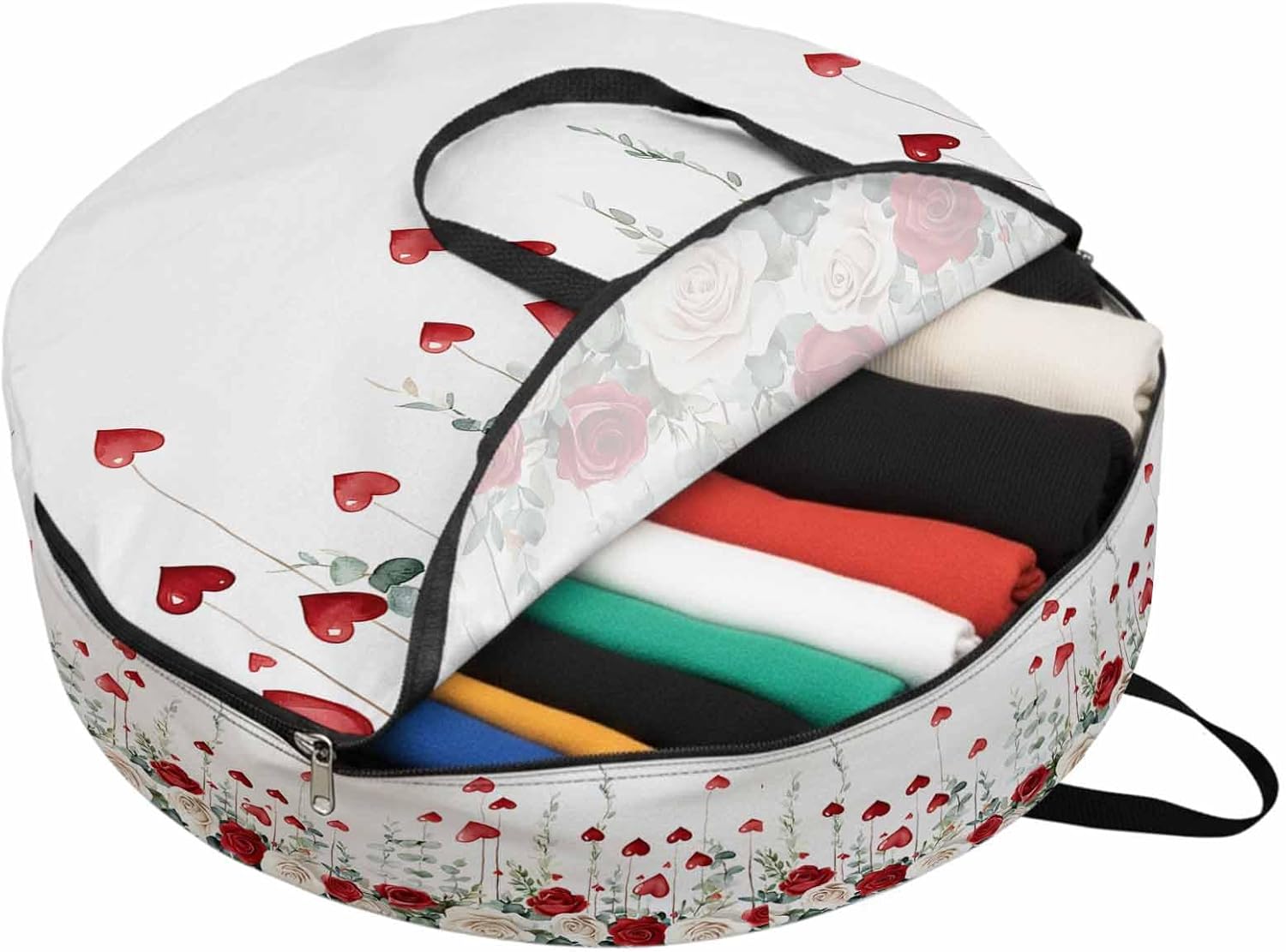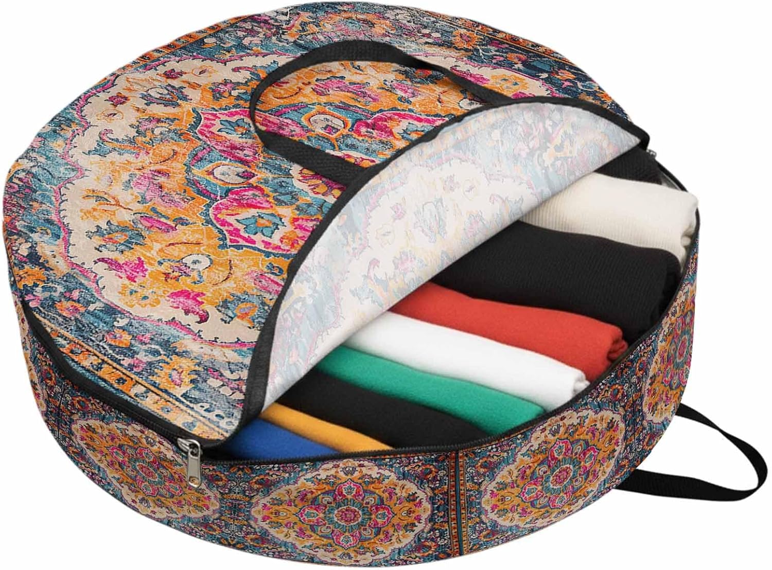Reclaim Your Closet Space with the Round Storage Solution! Material: polyester Diameters: 24 inch, 30 inch, 36 inch Depth: 7 inches Package Includes: Round Storage Bag One Bag, Endless Possibilities: Whether you are swapping out your summer wardrobe, moving into a new dorm, or packing away holiday decorations, this bag has you covered. The circular design is uniquely suited for: Bedding: Comforters, quilts, sheet sets, and oversized pillows. Clothing: Winter coats, sweaters, and bulky ski gear. Home Decor: Holiday wreaths, garlands, and floral arrangements. Outdoor Gear: Camping blankets, sleeping bags, and beach towels. Dual Zippers: The high quality double zipper design allows the closet organizer to open wide from both sides, making it effortless to load and unload even the bulkiest comforters or wreaths. Reinforced Handles: Sturdy, reinforced handles are securely stitched to provide extra strength and a comfortable grip when carrying heavy loads or pulling the bag from under a bed. Clear Label Pocket: A transparent built-in label holder allows you to quickly identify the contents of each bag without ever having to unzip it, keeping your storage perfectly organized.