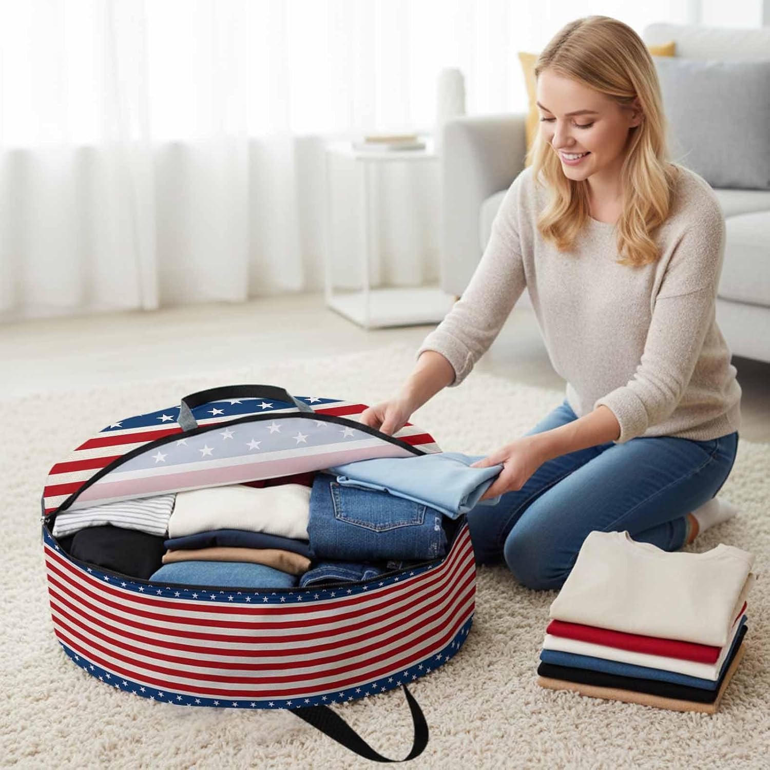 Reclaim Your Closet Space with the Round Storage Solution! Material: polyester Diameters: 24 inch, 30 inch, 36 inch Depth: 7 inches Package Includes: Round Storage Bag One Bag, Endless Possibilities: Whether you are swapping out your summer wardrobe, moving into a new dorm, or packing away holiday decorations, this bag has you covered. The circular design is uniquely suited for: Bedding: Comforters, quilts, sheet sets, and oversized pillows. Clothing: Winter coats, sweaters, and bulky ski gear. Home Decor: Holiday wreaths, garlands, and floral arrangements. Outdoor Gear: Camping blankets, sleeping bags, and beach towels. Dual Zippers: The high quality double zipper design allows the closet organizer to open wide from both sides, making it effortless to load and unload even the bulkiest comforters or wreaths. Reinforced Handles: Sturdy, reinforced handles are securely stitched to provide extra strength and a comfortable grip when carrying heavy loads or pulling the bag from under a bed. Clear Label Pocket: A transparent built-in label holder allows you to quickly identify the contents of each bag without ever having to unzip it, keeping your storage perfectly organized.