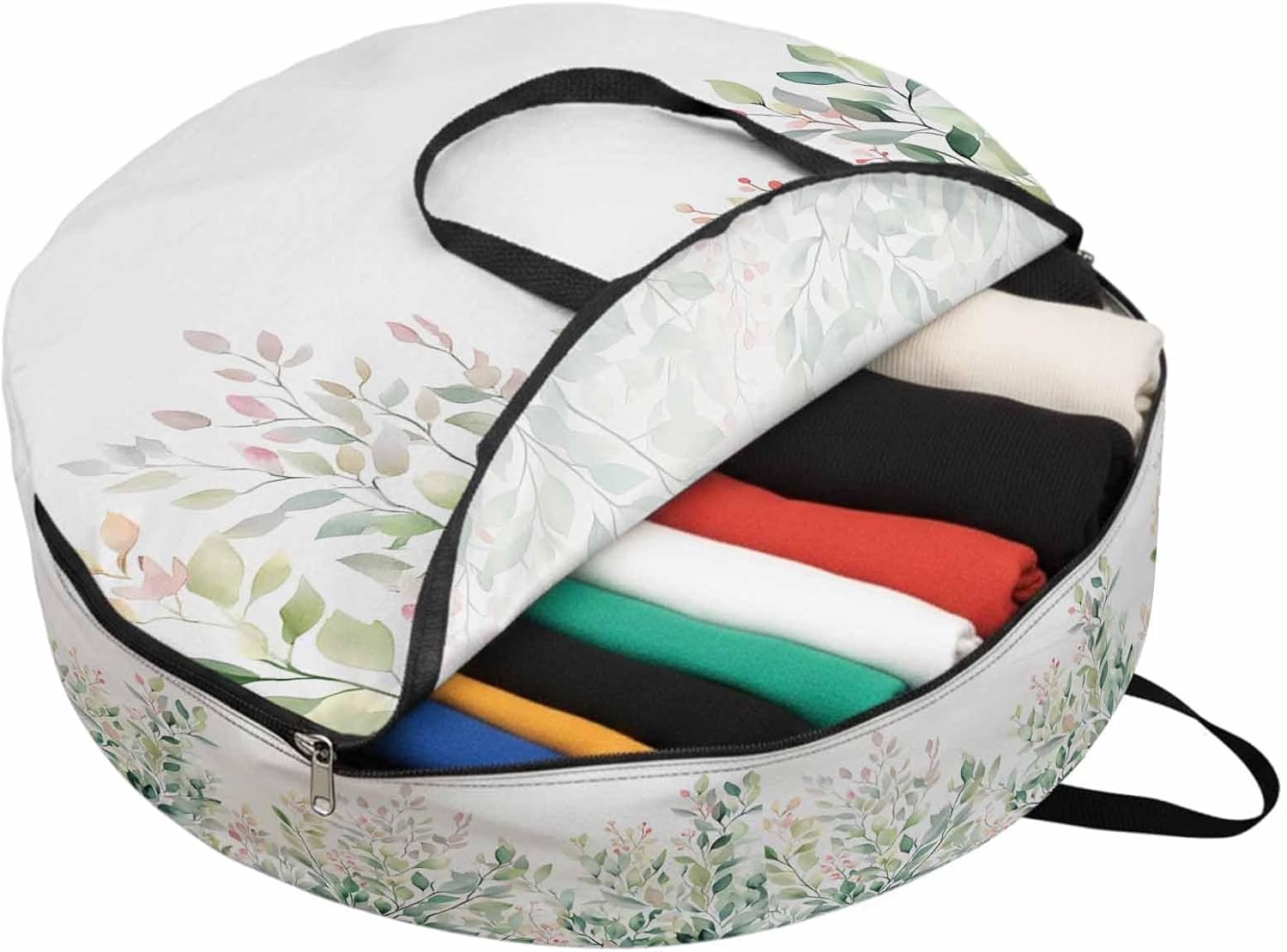 Reclaim Your Closet Space with the Round Storage Solution! Material: polyester Diameters: 24 inch, 30 inch, 36 inch Depth: 7 inches Package Includes: Round Storage Bag One Bag, Endless Possibilities: Whether you are swapping out your summer wardrobe, moving into a new dorm, or packing away holiday decorations, this bag has you covered. The circular design is uniquely suited for: Bedding: Comforters, quilts, sheet sets, and oversized pillows. Clothing: Winter coats, sweaters, and bulky ski gear. Home Decor: Holiday wreaths, garlands, and floral arrangements. Outdoor Gear: Camping blankets, sleeping bags, and beach towels. Dual Zippers: The high quality double zipper design allows the closet organizer to open wide from both sides, making it effortless to load and unload even the bulkiest comforters or wreaths. Reinforced Handles: Sturdy, reinforced handles are securely stitched to provide extra strength and a comfortable grip when carrying heavy loads or pulling the bag from under a bed. Clear Label Pocket: A transparent built-in label holder allows you to quickly identify the contents of each bag without ever having to unzip it, keeping your storage perfectly organized.
