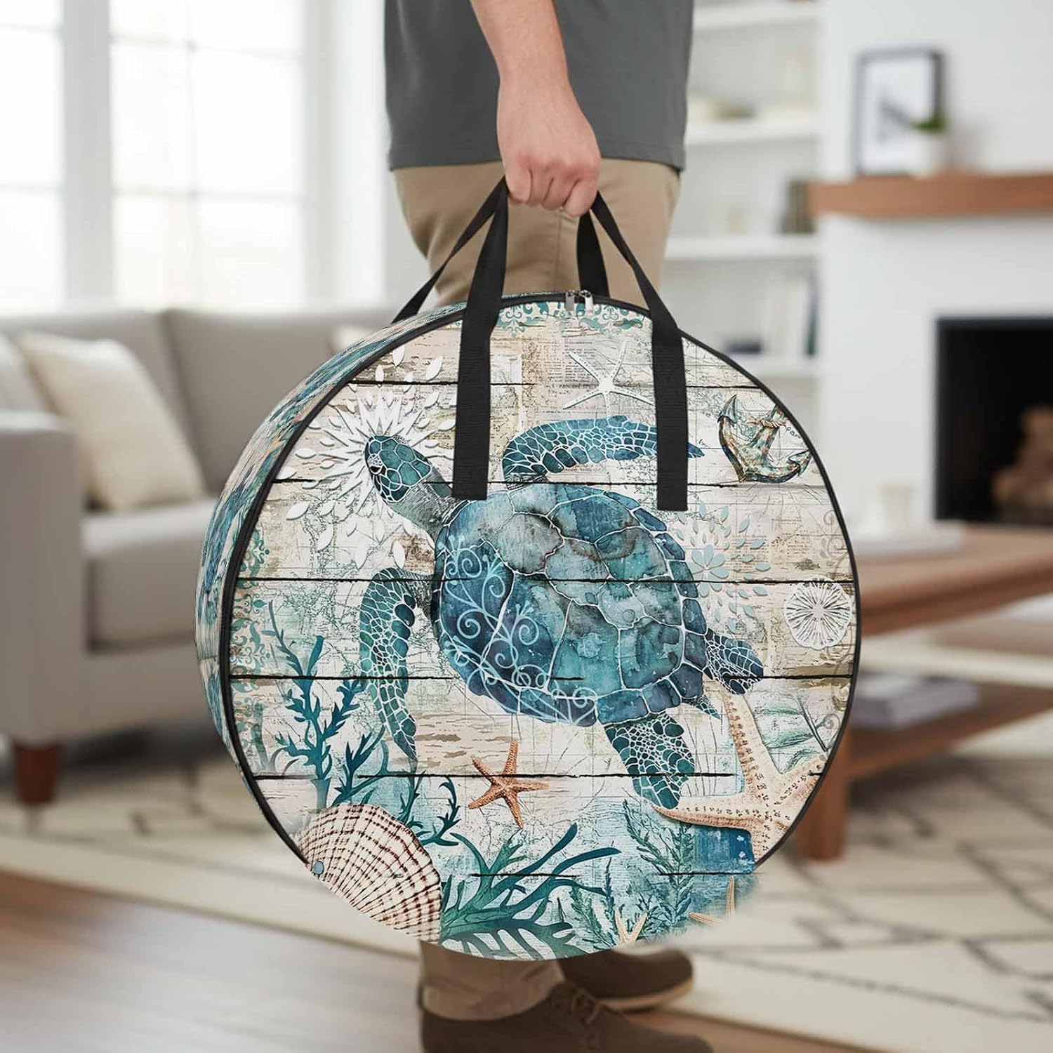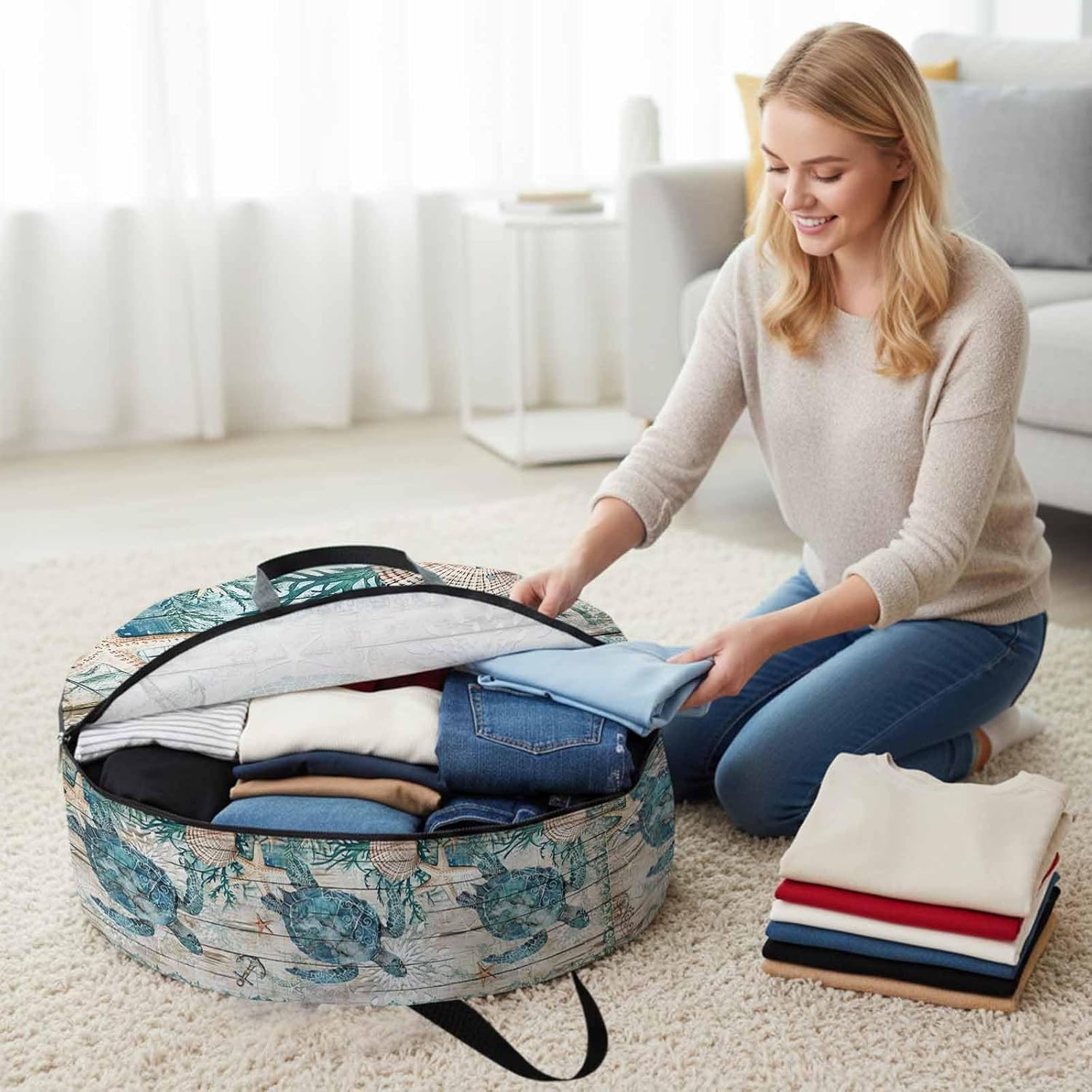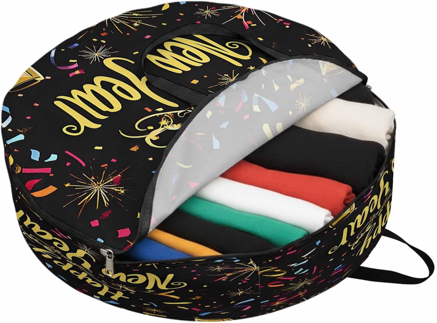 Reclaim Your Closet Space with the Round Storage Solution! Material: polyester Diameters: 24 inch, 30 inch, 36 inch Depth: 7 inches Package Includes: Round Storage Bag One Bag, Endless Possibilities: Whether you are swapping out your summer wardrobe, moving into a new dorm, or packing away holiday decorations, this bag has you covered. The circular design is uniquely suited for: Bedding: Comforters, quilts, sheet sets, and oversized pillows. Clothing: Winter coats, sweaters, and bulky ski gear. Home Decor: Holiday wreaths, garlands, and floral arrangements. Outdoor Gear: Camping blankets, sleeping bags, and beach towels. Dual Zippers: The high quality double zipper design allows the closet organizer to open wide from both sides, making it effortless to load and unload even the bulkiest comforters or wreaths. Reinforced Handles: Sturdy, reinforced handles are securely stitched to provide extra strength and a comfortable grip when carrying heavy loads or pulling the bag from under a bed. Clear Label Pocket: A transparent built-in label holder allows you to quickly identify the contents of each bag without ever having to unzip it, keeping your storage perfectly organized.