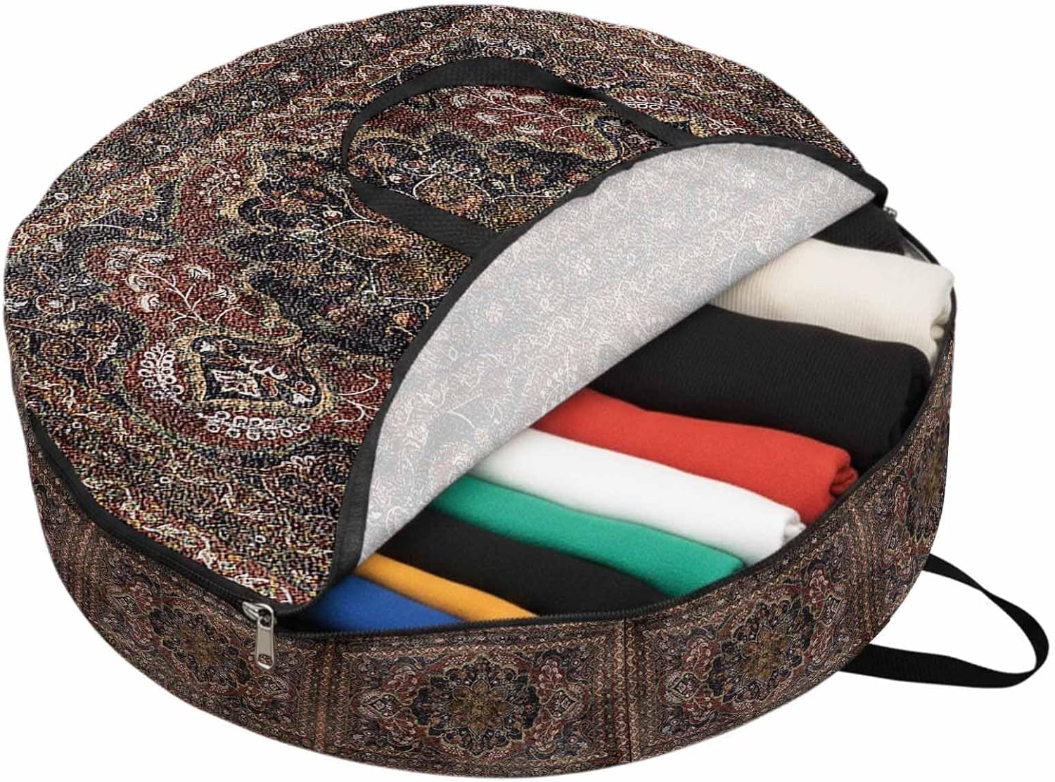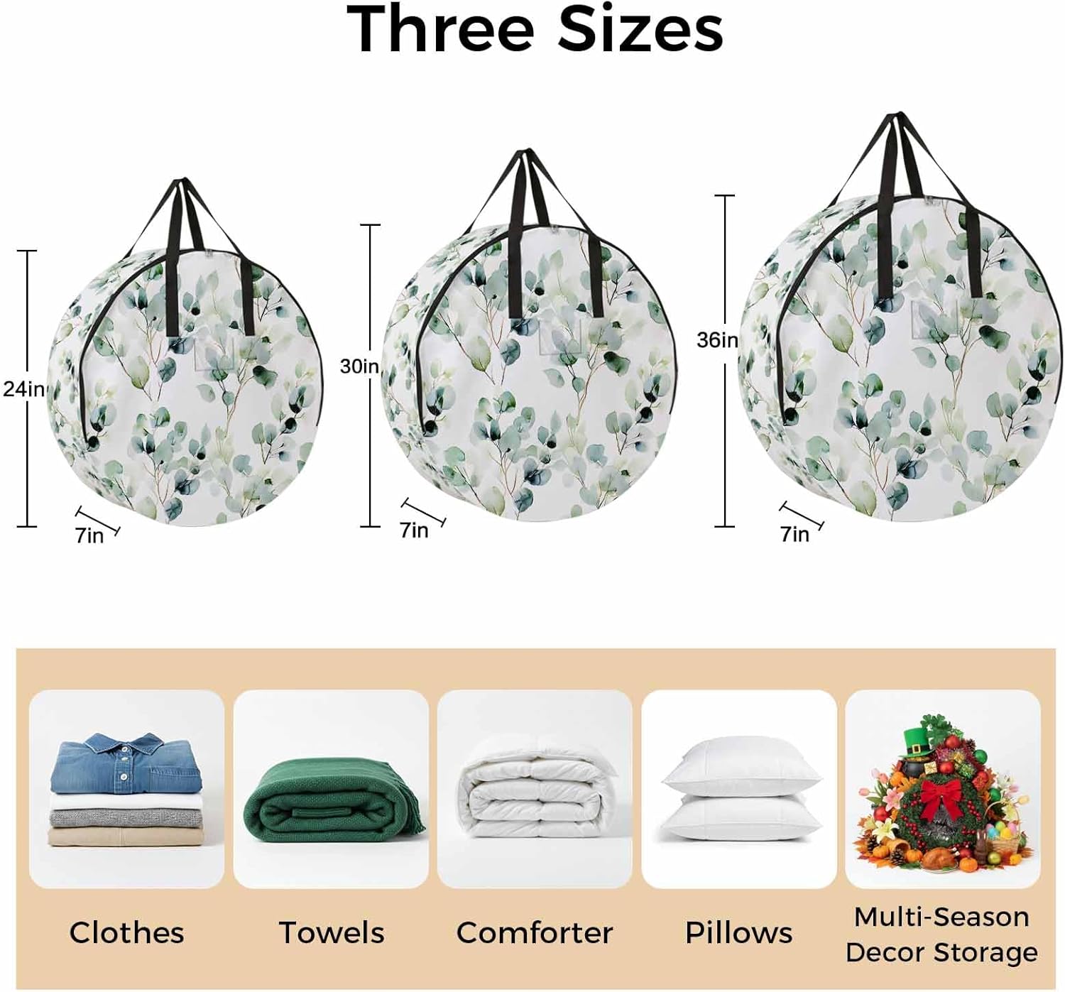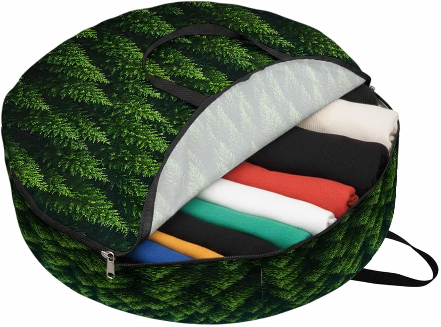 Reclaim Your Closet Space with the Round Storage Solution! Material: polyester Diameters: 24 inch, 30 inch, 36 inch Depth: 7 inches Package Includes: Round Storage Bag One Bag, Endless Possibilities: Whether you are swapping out your summer wardrobe, moving into a new dorm, or packing away holiday decorations, this bag has you covered. The circular design is uniquely suited for: Bedding: Comforters, quilts, sheet sets, and oversized pillows. Clothing: Winter coats, sweaters, and bulky ski gear. Home Decor: Holiday wreaths, garlands, and floral arrangements. Outdoor Gear: Camping blankets, sleeping bags, and beach towels. Dual Zippers: The high quality double zipper design allows the closet organizer to open wide from both sides, making it effortless to load and unload even the bulkiest comforters or wreaths. Reinforced Handles: Sturdy, reinforced handles are securely stitched to provide extra strength and a comfortable grip when carrying heavy loads or pulling the bag from under a bed. Clear Label Pocket: A transparent built-in label holder allows you to quickly identify the contents of each bag without ever having to unzip it, keeping your storage perfectly organized.