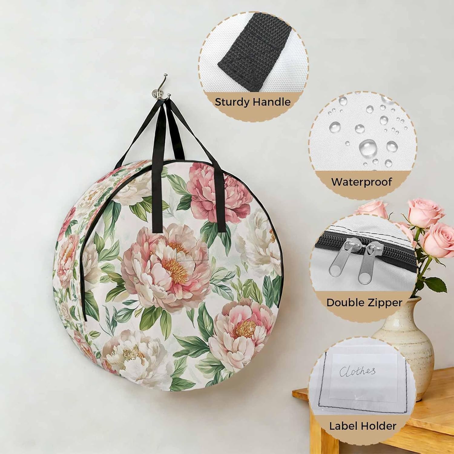 Reclaim Your Closet Space with the Round Storage Solution! Material: polyester Diameters: 24 inch, 30 inch, 36 inch Depth: 7 inches Package Includes: Round Storage Bag One Bag, Endless Possibilities: Whether you are swapping out your summer wardrobe, moving into a new dorm, or packing away holiday decorations, this bag has you covered. The circular design is uniquely suited for: Bedding: Comforters, quilts, sheet sets, and oversized pillows. Clothing: Winter coats, sweaters, and bulky ski gear. Home Decor: Holiday wreaths, garlands, and floral arrangements. Outdoor Gear: Camping blankets, sleeping bags, and beach towels. Dual Zippers: The high quality double zipper design allows the closet organizer to open wide from both sides, making it effortless to load and unload even the bulkiest comforters or wreaths. Reinforced Handles: Sturdy, reinforced handles are securely stitched to provide extra strength and a comfortable grip when carrying heavy loads or pulling the bag from under a bed. Clear Label Pocket: A transparent built-in label holder allows you to quickly identify the contents of each bag without ever having to unzip it, keeping your storage perfectly organized.