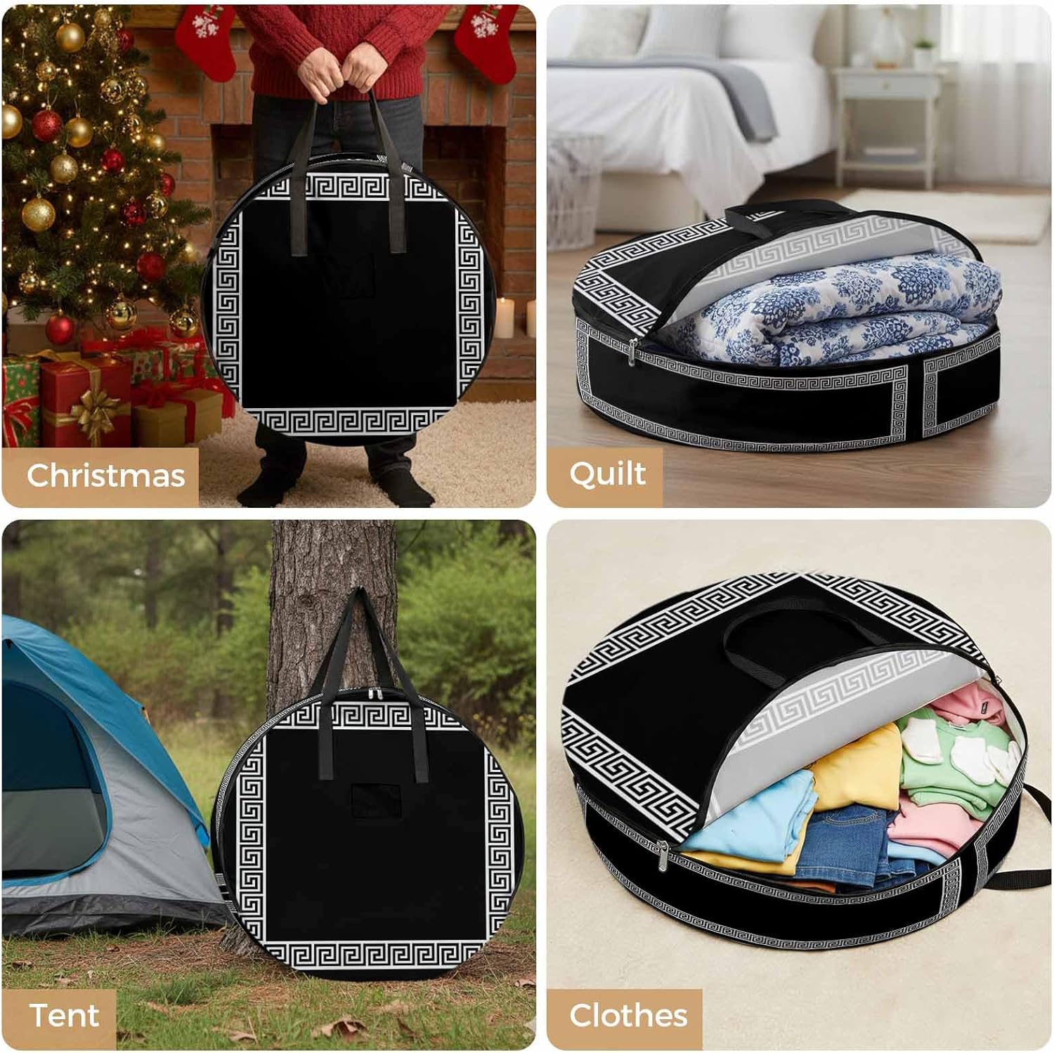 Reclaim Your Closet Space with the Round Storage Solution! Material: polyester Diameters: 24 inch, 30 inch, 36 inch Depth: 7 inches Package Includes: Round Storage Bag One Bag, Endless Possibilities: Whether you are swapping out your summer wardrobe, moving into a new dorm, or packing away holiday decorations, this bag has you covered. The circular design is uniquely suited for: Bedding: Comforters, quilts, sheet sets, and oversized pillows. Clothing: Winter coats, sweaters, and bulky ski gear. Home Decor: Holiday wreaths, garlands, and floral arrangements. Outdoor Gear: Camping blankets, sleeping bags, and beach towels. Dual Zippers: The high quality double zipper design allows the closet organizer to open wide from both sides, making it effortless to load and unload even the bulkiest comforters or wreaths. Reinforced Handles: Sturdy, reinforced handles are securely stitched to provide extra strength and a comfortable grip when carrying heavy loads or pulling the bag from under a bed. Clear Label Pocket: A transparent built-in label holder allows you to quickly identify the contents of each bag without ever having to unzip it, keeping your storage perfectly organized.