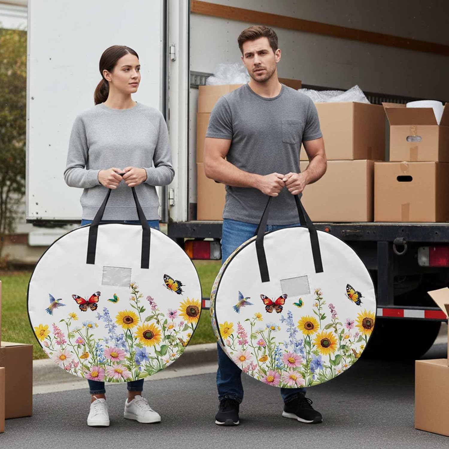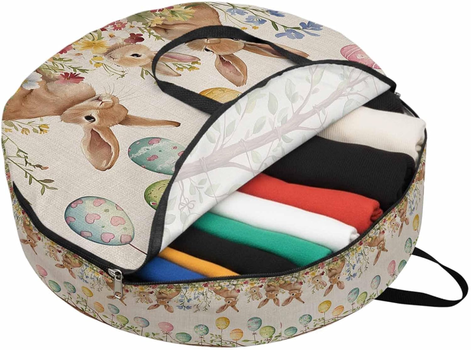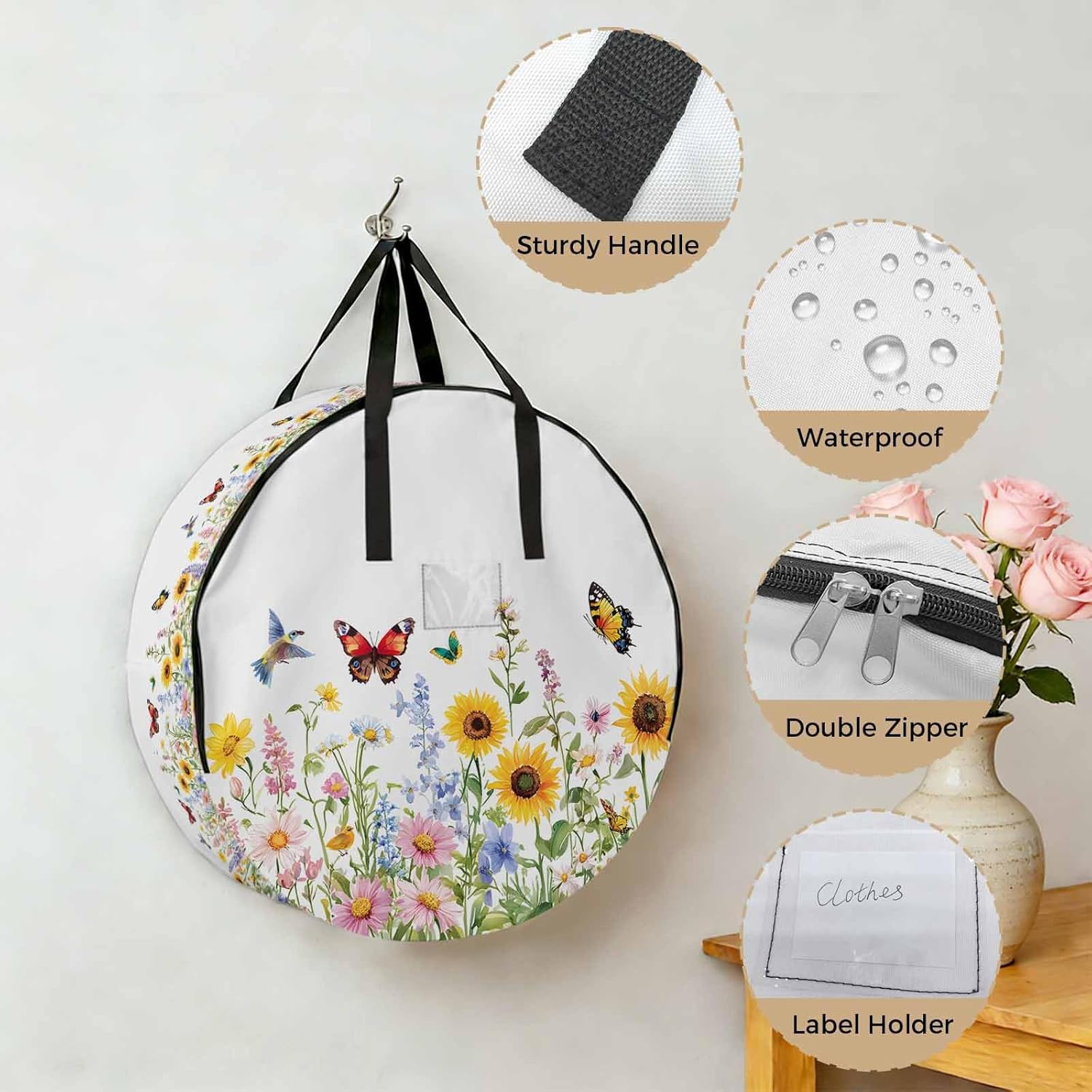 Reclaim Your Closet Space with the Round Storage Solution! Material: polyester Diameters: 24 inch, 30 inch, 36 inch Depth: 7 inches Package Includes: Round Storage Bag One Bag, Endless Possibilities: Whether you are swapping out your summer wardrobe, moving into a new dorm, or packing away holiday decorations, this bag has you covered. The circular design is uniquely suited for: Bedding: Comforters, quilts, sheet sets, and oversized pillows. Clothing: Winter coats, sweaters, and bulky ski gear. Home Decor: Holiday wreaths, garlands, and floral arrangements. Outdoor Gear: Camping blankets, sleeping bags, and beach towels. Dual Zippers: The high quality double zipper design allows the closet organizer to open wide from both sides, making it effortless to load and unload even the bulkiest comforters or wreaths. Reinforced Handles: Sturdy, reinforced handles are securely stitched to provide extra strength and a comfortable grip when carrying heavy loads or pulling the bag from under a bed. Clear Label Pocket: A transparent built-in label holder allows you to quickly identify the contents of each bag without ever having to unzip it, keeping your storage perfectly organized.
