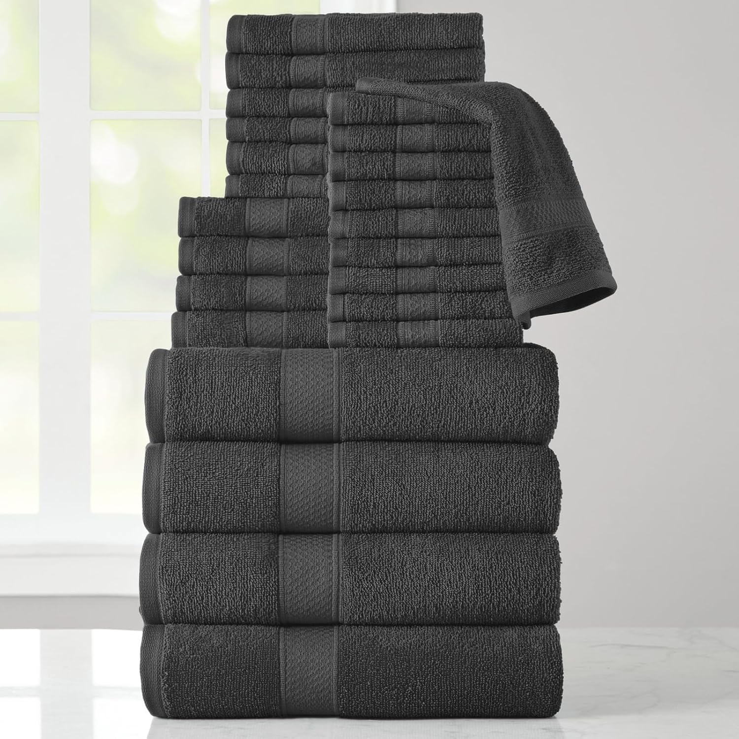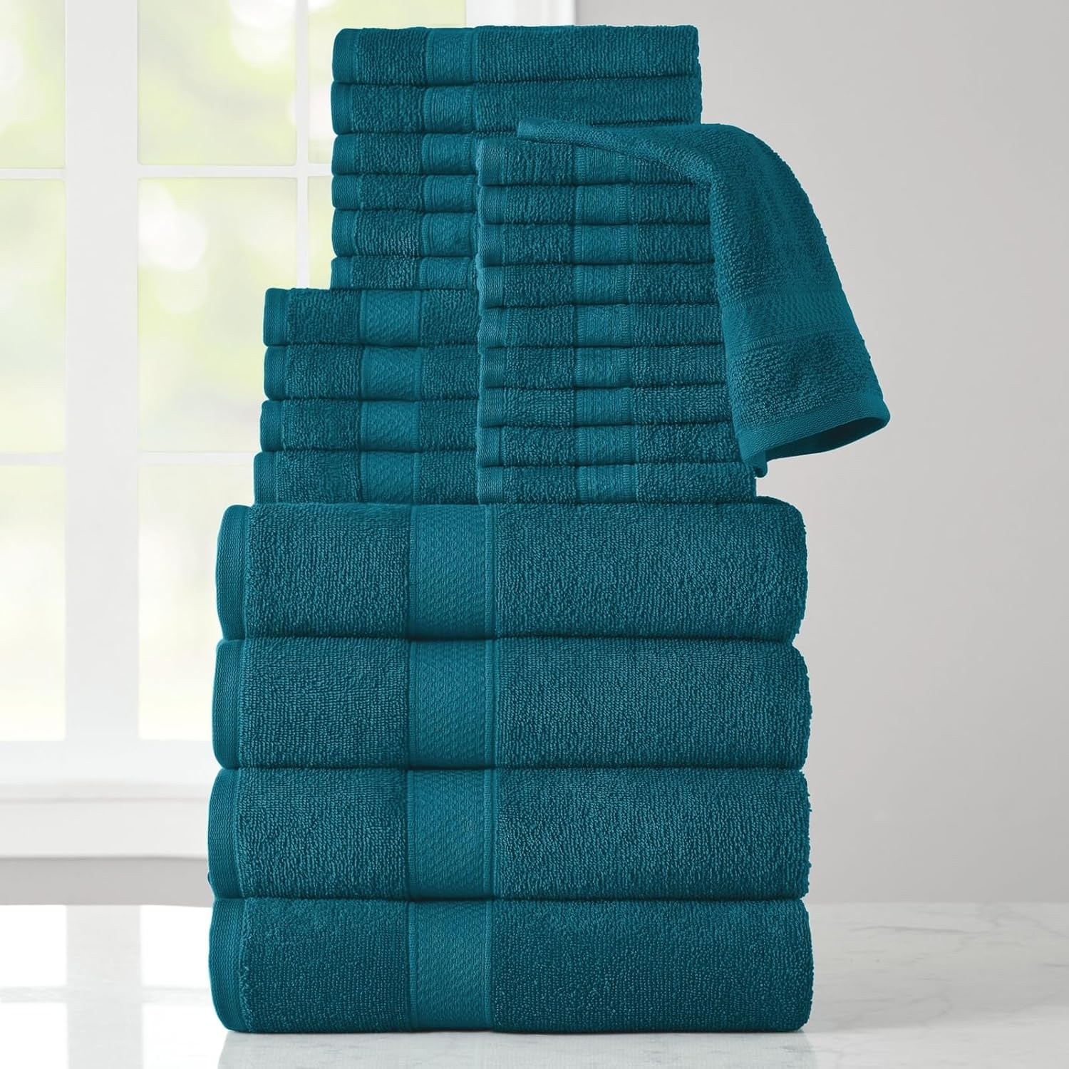 Refresh your bathroom with the Stoneberry Home 24-Piece Cotton Towel Set, a complete and coordinated collection of absorbent cotton bath towels designed for comfort, style, and everyday use. Woven from lightweight 380 GSM 100% cotton, these quick-dry towels deliver a soft, breathable feel that’s ideal for families, guests, or anyone who is looking for comfort and convenience. The set includes bath towels, hand towels, fingertip towels, and washcloths, everything you need in one matching towel set. Perfect for modern bathrooms, dorm rooms, guest suites, gyms, and travel, these bathroom towels are both functional and stylish. Their fast-drying and highly absorbent construction helps prevent musty smells caused by lingering dampness and humidity, typical of bathrooms, keeping your towels fresher between washes. This 24-piece towel set is a practical solution for any household seeking low-maintenance, high-quality bath linens. With its solid color and everyday performance, the Stoneberry Home towel set offers a complete bath linen refresh that combines quality, durability, and soft comfort.