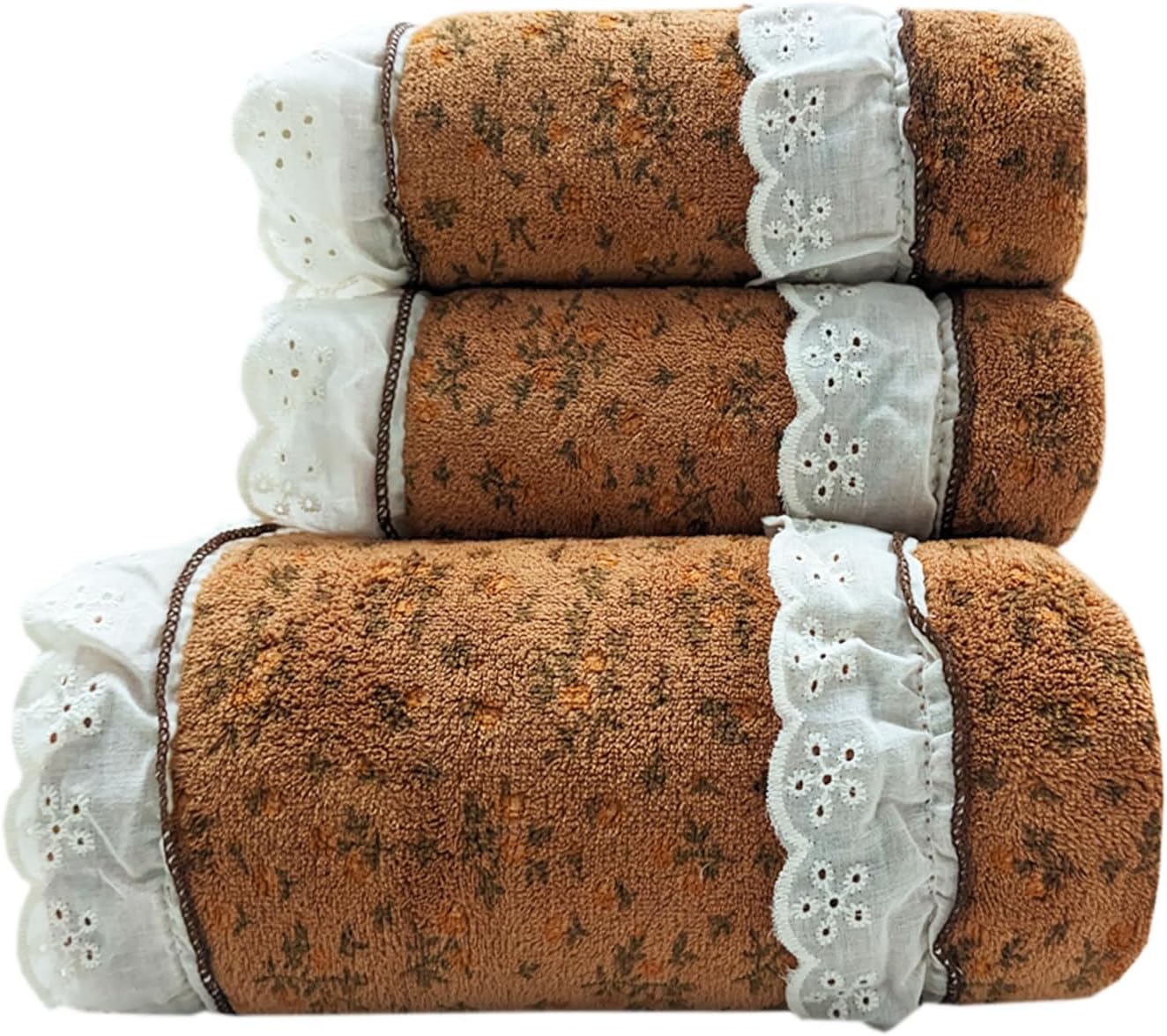 Elevate your bathroom decor with this charming 3-piece towel set featuring a delicate beige base adorned with elegant blue floral patterns and intricate lace trim detailing. The set includes one bath towel and two hand towels, crafted from premium coral velvet material that offers both luxurious softness and exceptional functionality. These towels are engineered for superior absorbency and quick-drying performance, making them practical for daily use. The romantic floral design adds a touch of sophistication to your bathroom while maintaining its essential purpose of effective drying.