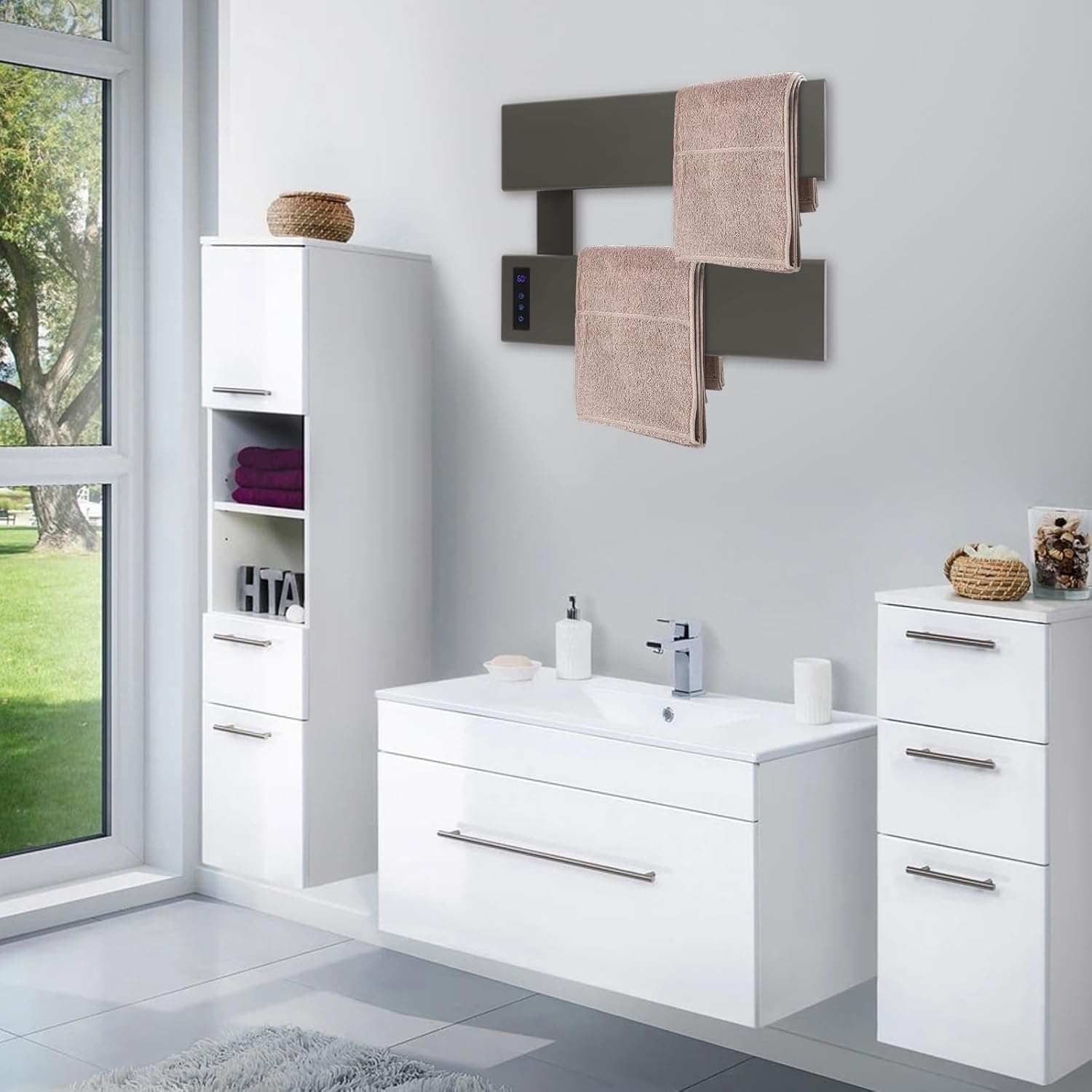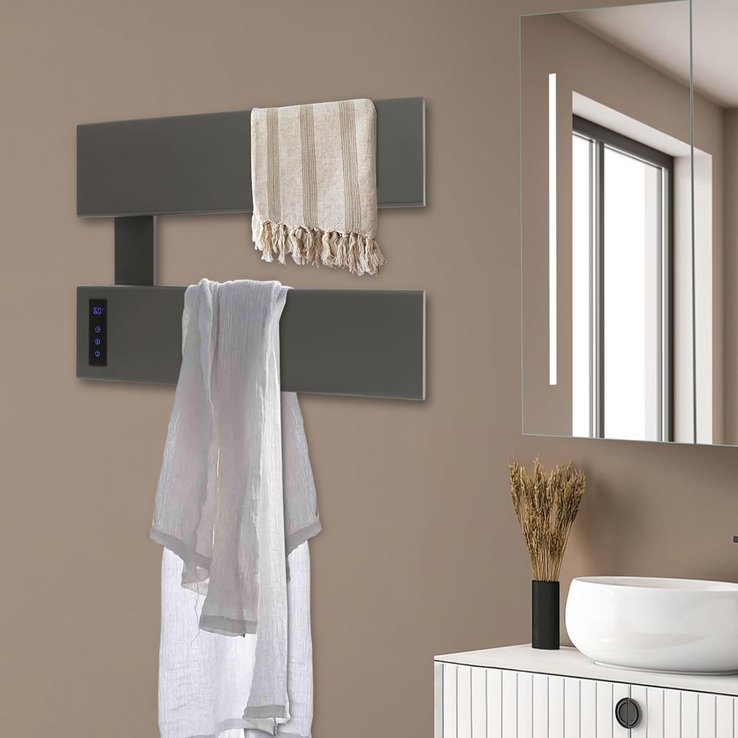 DescriptionThis electric towel rack will be ideal for drying your small and large towels indoors. It comes with the wide heating panel and thermostatic heating design, which ensures that your towels are heated and kept warm quickly and evenly. In addition, the wall-mounted towel heater also comes with temperature adjustment and timer design, allowing you to design the drying time in detail according to your schedule so that you can enjoy a cozy and warm towel wipe while showering, washing, or shaving.DetailsLED Screen: The LED touch panel makes it easy to see the temperature and time for quick and easy control.IPX4 Grade: The product features an excellent IPX4 waterproof rating, which allows it to withstand water splashed in different directions without being damaged, allowing it to be installed in wet environments such as bathrooms.ApplicationThis electric towel warmer is suitable for drying or heating towels in hotels, hostels, bathrooms, kitchens, or other places.SpecificationsColor: Gun GreyMaterial: Aluminum AlloyProcess: Chemical Polishing, Anodize, Baking Paint, SprayingMount Type: Wall-mountedPlug Type: US StandardWaterproof Grade: IPX4Assembly Required: YesNumber of Tiers: 3/2/1Voltage: 110VMax. Load Bearing Capacity: 20kg/44lbsPower: 100WTemperature Setting Range: 40-65℃/104-149℉Time Setting Range: 3h/4h/5hProduct Overall Size: 45*8*53cm/17.72*3.15*20.87in (3 Tier ) 45*8*32cm/17.72*3.15*12.6in (2 Tier ) 45*8*12cm/17.72*3.15*4.72in (1 Tier ) Package Size:86.5*27.5*17cm/34.06*10.83*6.69in (3 Tier )57.5*21.5*17cm/22.64*8.46*6.69in (2 Tier )51*15*13cm/20.08*5.91*5.12in (1 Tier )Gross Weight: 3.1kg/6.83lbs(3 Tier), 2.1kg/4.63lbs(2 Tier), 1.45kg/3.2lbs(1 Tier)Net Weight: 2.94kg/6.48lbs(3 Tier), 2kg/4.41lbs(2 Tier), 1.38kg/3.04lbs(1 Tier)Package Included1* Electric Towel Heater1* English ManualOther Needed AccessoriesNotes1. Please check the size carefully before ordering.2. Please read the English manual carefully before using the product.3. This product is designed for drying and moderate warming. That is to say, it can dry towels efficiently and keep them warm. Please note that it is not designed to make the towels reach a high temperature like that of a towel warmer bucket(excluding).4. Please allow the slight color difference caused by the shooting light and 1-3cm error due to manual measurement, and make sure you do not mind before you order.