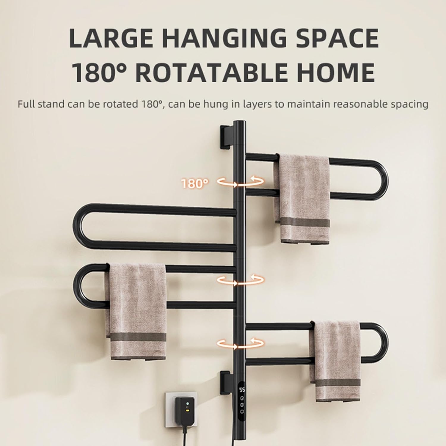 We provide you with an advanced heated towel rack to keep your clothes and towels in constant,gentle temperature even in cold weather.With its help,you are allowed to be free from unhygienic troubles. Thanks to the timer design,it ensures convenient and secure use in your daily life. Use this versatile heated towel racks for bathroom in different locations and all year round!Great to put in multiple locations such as bathrooms, mudrooms,laundry rooms, hotels, spas, gyms, fitness centers, or country clubs!In addition to warming your towels on cold, rainy, or snowy days,you can use the heated towel rack to quickly dry bathing suits. Specifications Name:Heated towel racks for bathroom Item size: 16.9*30.7*3.5in/ 43*78*9cm Temperature range:30-70 °c Timing range: 1-9h Finish:Baking paint surface Voltage:110 v-240v Power: 135w Package included: 1 x heated towel rack 1 x pack of fixing part(nail free adhesive is not included in the scope of supply but is easy to purchase) 1 x english manual Kind tips: It is recommended that hard wiring be installed by professionals for your safety.