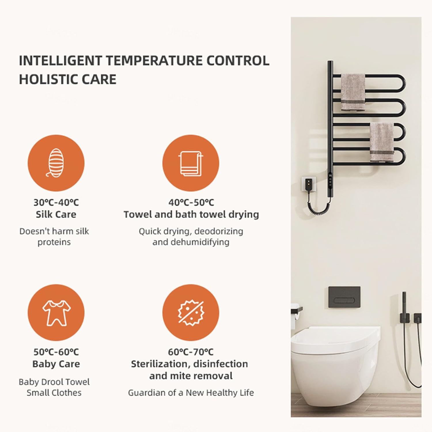 We provide you with an advanced heated towel rack to keep your clothes and towels in constant,gentle temperature even in cold weather.With its help,you are allowed to be free from unhygienic troubles. Thanks to the timer design,it ensures convenient and secure use in your daily life. Heated towel racks for bathroom perfectly with any space style, it can be used in many occasions such as home, hotel, gym and pool, you can immediately have a warm and comfortable towel after bathing, swimming, exercising or after the rains.You can also warm blankets or jackets before use for a cozy experience.You can enjoy more convenient and comfortable life. Specifications Name:Heated towel racks for bathroom Item size: 16.9*30.7*3.5in/ 43*78*9cm Temperature range:30-70 °c Timing range: 1-9h Finish:Baking paint surface Voltage:110 v-240v Power: 135w Package included: 1 x heated towel rack 1 x pack of fixing part(nail free adhesive is not included in the scope of supply but is easy to purchase) 1 x english manual Kind tips: It is recommended that hard wiring be installed by professionals for your safety.
