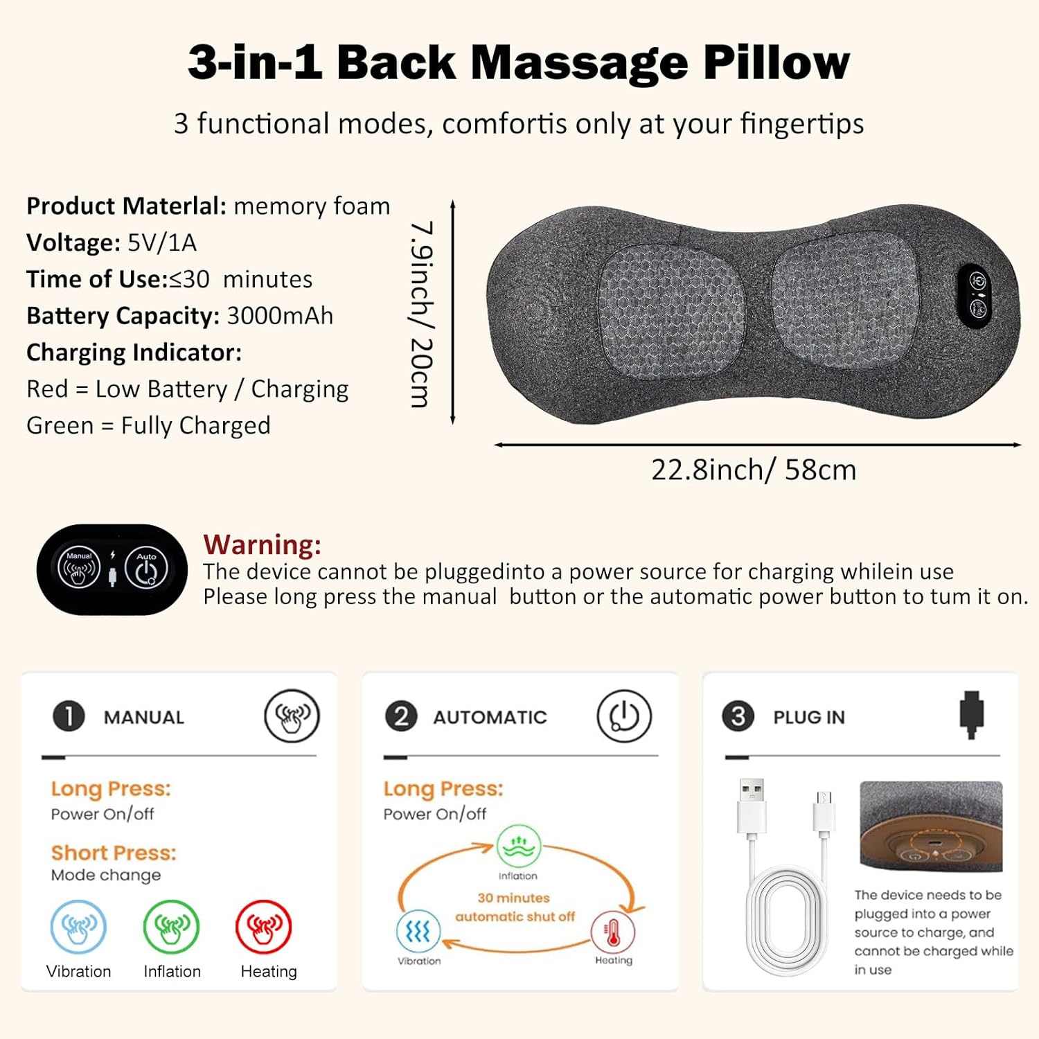| Other Special Features of the Product | Heat, Rechargeable, Timer (30 minutes), Traction, Vibration Massager |