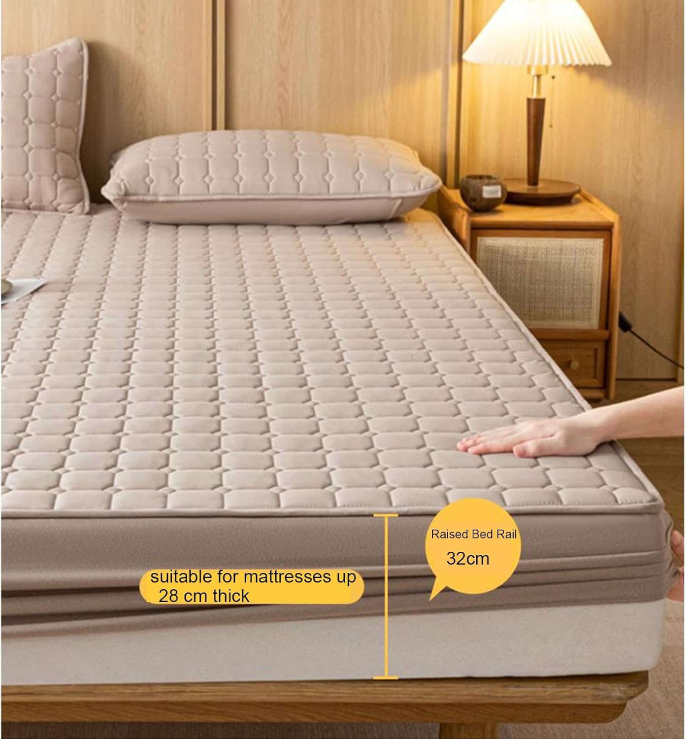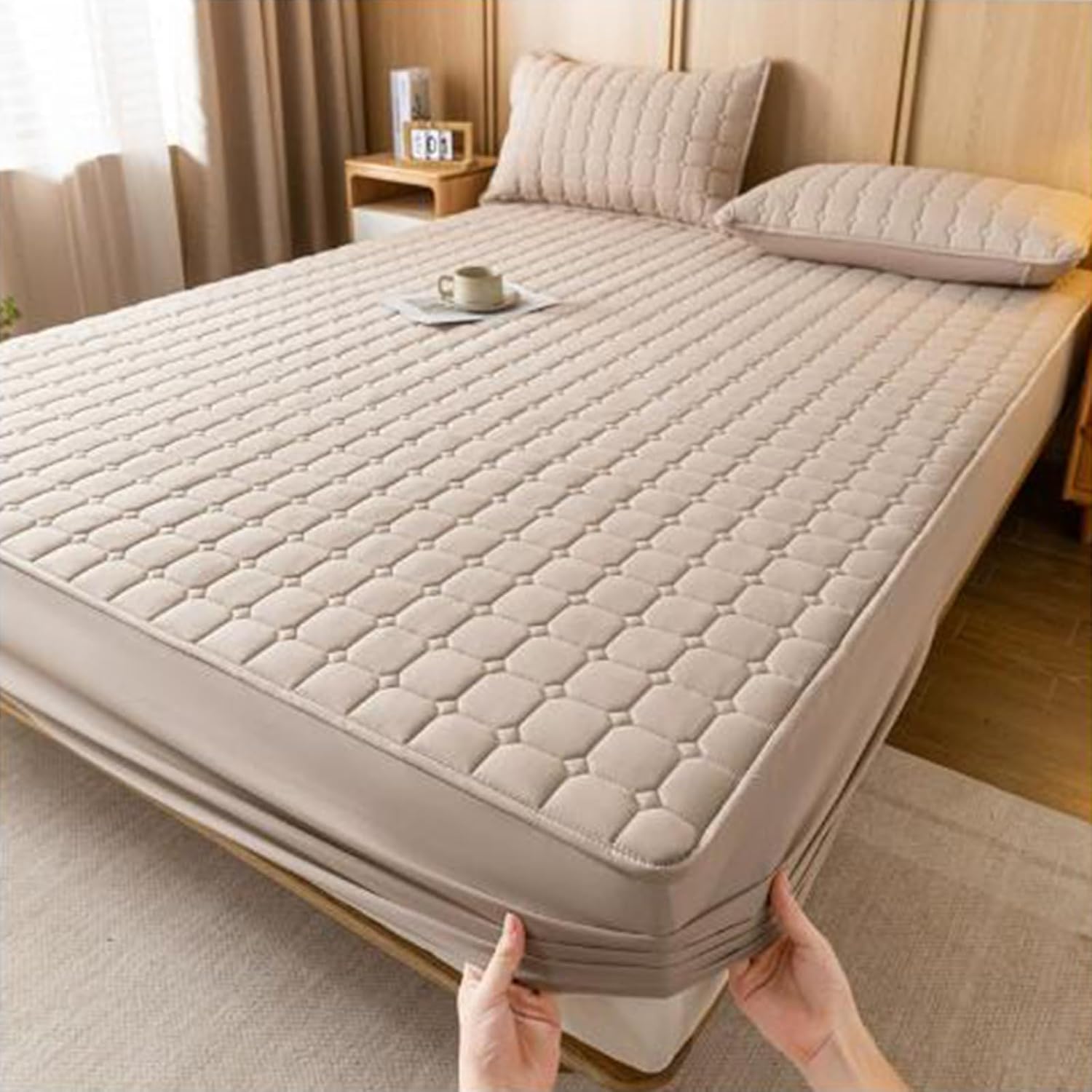 360° wrap-around design,no dead corners,flat and comfortable,fully enclosed design,can be adapted to any sleeping position,will not slide,easy to dismantle,easy to take care of.Features:1. The fabric is soft, not easy to shed, and has good warmth retention effect2. Full enveloping design, inclusive of any sleeping position does not slide3. Easy to disassemble and washSpecification:Product Name: Washed Cotton Quilted Duvet CoverFabric: Skin-friendly washed cottonFilling: Full-sheet down-filled polyester fiberWeaving Process: QuiltingMaterial: Polyester FiberSize:35''x79'' (90x200cm)47''x79'' (120x200cm)59''x79'' (150x200cm)71''x79'' (180x200cm)71''x86'' (180x220cm)78''x86'' (200x220cm)Package Includes:1 * Luxury Mattress Covers(Pillowcase needs to be purchased separately)Notes:1.Due to manual measurement, there is a certain error in the product size.2.Due to lighting effects and shooting angles, there may be chromatic aberration in the product, please understand.