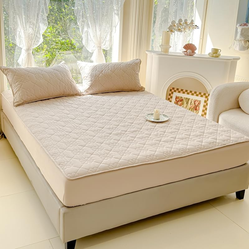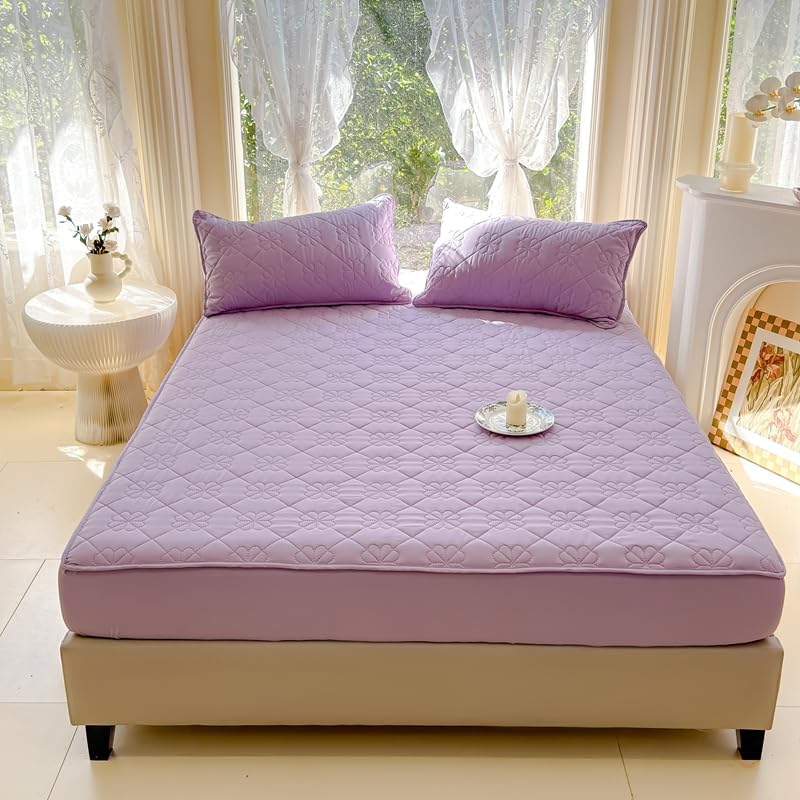 Comfortable and Breathable Fitted Sheet ltra-soft and Breathable Made of thicker filling, the unique airflow system is permeable for fresh air & moisture, our mattress cover brings you a sweet dream. Deep Pocket Design Side skirts adopt elastic fitting technology, our mattress protector can adjust most regular mattresses tightly. 360° Protection This mattress cover ensures hugs each corner of your mattress to keep it in place throughout the night without bunching, sliding, or coming off. Quiet Sleep The noiseless fabric brings you comfortable sleep without a crinkling sound or plastic feel. The mattress protector waterproof will provide a great convenience for your golden sleep. Easy Care & Clean You only take the waterproof mattress protector off & slip it in your washing machine and then low tumble dry. Size: Twin: 39"x75" (100x190cm), 2 Pillowcase 20"x30" (50x75cm) Twin XL: 39"x80" (100x203cm), 2 Pillowcase 20"x30" (50x75cm) Full: 54"x75" (137x190cm), 2 Pillowcase 20"x30" (50x75cm) Queen: 60"x80" (152x203cm), 2 Pillowcase 20"x30" (50x75cm) King: 78"x80" (198x203cm), 2 Pillowcase 20"x30" (50x75cm) Cal King: 72"x86" (183x218cm), 2 Pillowcase 20"x30" (50x75cm) Package includes: 1PCS x Mattress Protector, 2PCS x Pillowcases Notes: 1.Due to manual measurement, there is a certain error in the product size. 2.Due to lighting effects and shooting angles, there may be chromatic aberration in the product, please understand.