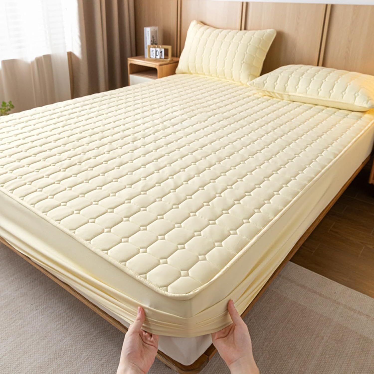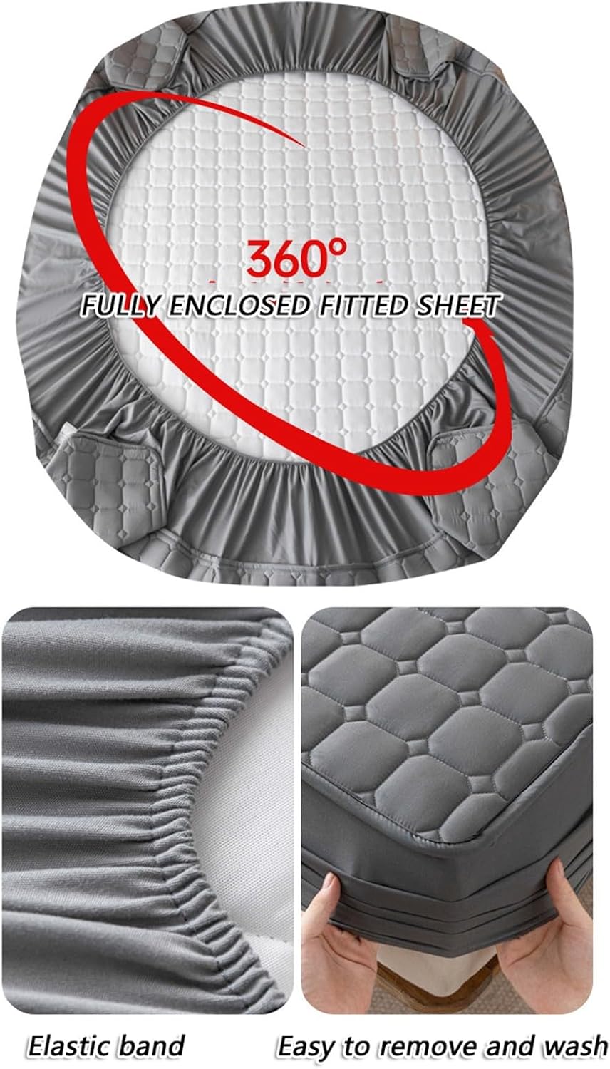Make your bed a haven of peace with our waterproof mattress protector made from premium fabrics. With deep pockets and all-around elastic bands, this mattress protector fits snugly deep into your mattress, ensuring it stays in place all night long.Product Specifications:Name: Waterproof Mattress ProtectorMaterial: Washed CottonFilling: Whole Feather Silk CottonWeaving Process: QuiltingApplicable Season: Four SeasonsPattern: Solid ColorColor (Optional):White,Khaki,Yellow,Light Gray,Dark Gray,Dark BlueFeatures: TPU Waterproof Film, Skin-Friendly and Soft, 360-Degree Full Coverage, Comprehensive ProtectionSize:90x200cm / 35.43x78.74in120x200cm / 47.24x78.74in150x200cm / 59.05x78.74in180x200cm / 70.86x78.74in180x220cm / 70.86x86.61in200x220cm / 78.74x86.61inPillowcase:48x74cm / 19x29.1inPackage Includes:1 PCS x Mattress Protector2 PCS x PillowcasesWashing Instructions: Normal Temperature Washing, Do Not Bleach, Hang to Dry, Do Not Iron, Normal Temperature Dry Cleaning