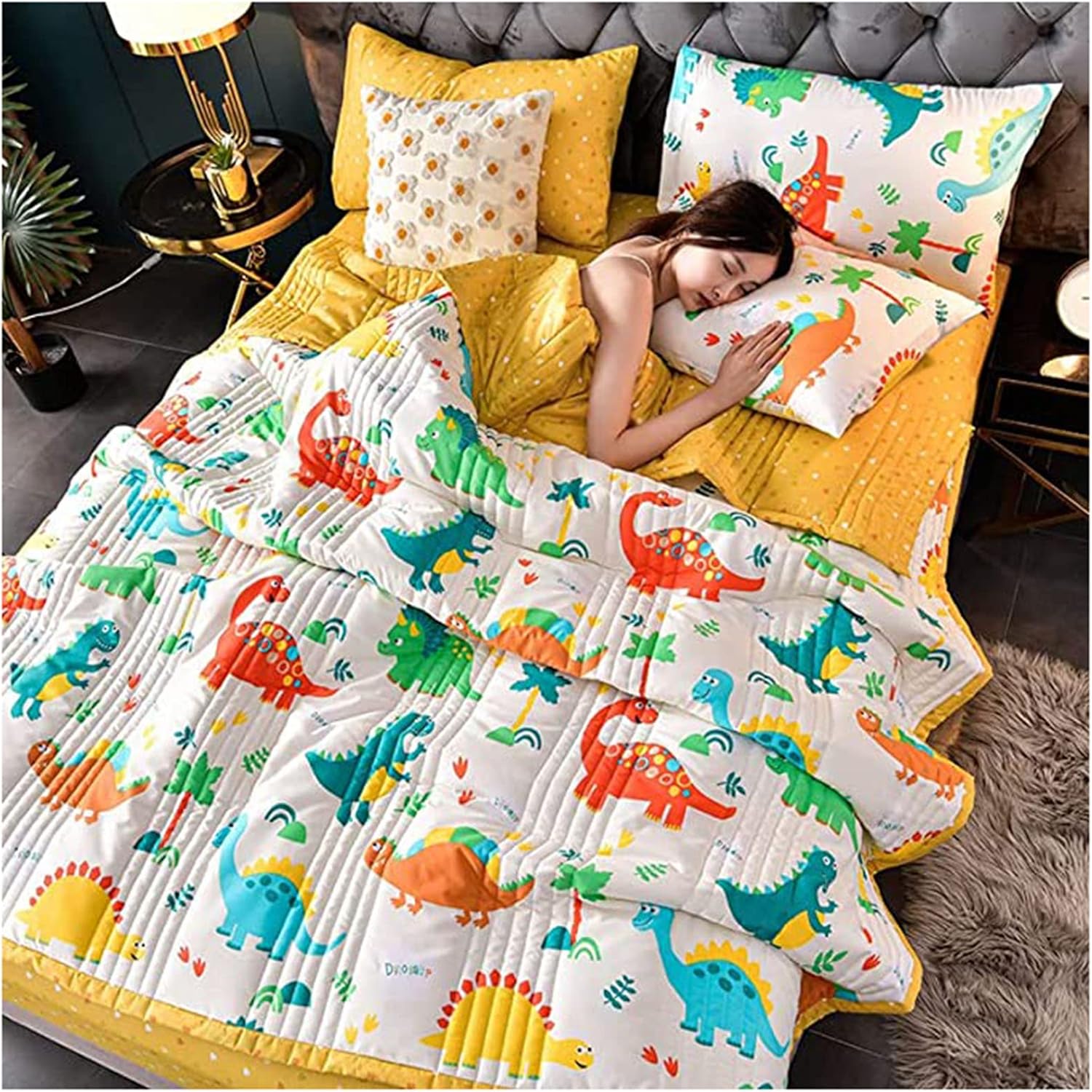 The lightweight summer comforter is super soft and breathable. The good quality down alternative filling touches like cloud, It will soothe and calm you on hot nights and accompany you to sleep soundly and comfortably. FEATURE:1. Washable cotton fabric & Microfiber Filling, no fading, no pilling.2. The thin summer comforter have great moisture absorption, skin friendly and comfortable, more soft and more breathable,it can keep you nice and cool even in humid muggy space.3. Excellent Ultrasonic quilting process is adopted, which is stronger and makes the filling more uniform. AB version design, elegant and beautiful.4. The all season blanket can be used all the year round as a thin comforter, quilt, coverlet, bedspread. It is qualified for multi daily uses.5. Machine wash in a gentle cycle with cold water, tumble dry on low or dry naturally, do not over wring. do not bleach. SPECIFICATION:Material: Washable cotton & Microfiber Size: 100*150cm, 150*200cm, 180*200cm, 200*230cmSeason: 4 SeasonsPackage includes: 1 x Summer Quilt★ Slight size difference is allowable due to manual measurement..BEST CHOICE: We promise every good effort products to make sure your satisfaction. We make every effort to provide quality services. You could contact our customer service when there any questions.