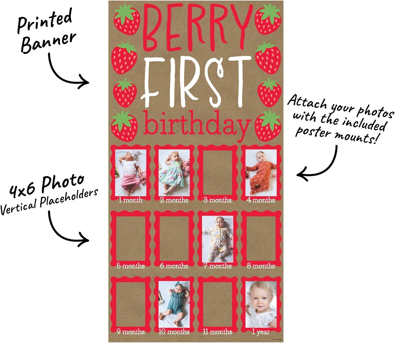 This Berry First Birthday photo banner is the sweetest way to celebrate your baby’s first year and turn those monthly milestones into a full party moment. Designed for a Berry Sweet Strawberry first birthday, this vertical kraft paper banner features labeled 4x6 photo placeholders from 1 month through 12 months so you can create a complete baby timeline display in minutes. It brings the trending hand-painted butcher paper banner look you are seeing everywhere right now, but it is professionally printed on recycled brown kraft paper, so you skip the DIY and still get that fresh, fruit-inspired style. At 22.5 by 44 inches, it is the perfect size for doors, walls, or behind your dessert table, instantly creating a bright, photo-ready backdrop guests will gather around. Use it as a first birthday photo banner, baby timeline banner, or keepsake piece after the party. With included poster mounts for easy setup and a full collection of matching Berry Sweet Strawberry party decorations available, this made-in-the-USA banner makes it easy to create a coordinated, meaningful first birthday celebration that feels fun, fresh, and completely put together.