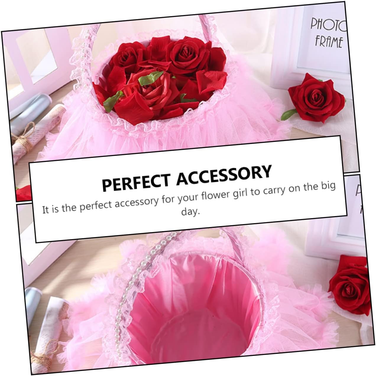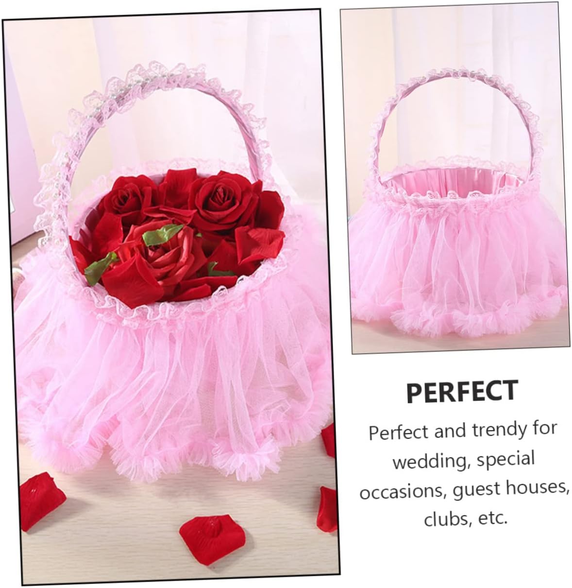 Package List 1 x flower basketCharacteristics - : Plastic and Cloth lace for weddings.- Color: Pink delicate flower basket.- Can be to hold flowers, flower petals, candies and other novelties woven baskets.- Pink lace, romantic and beautiful. Elaborate production and great ingenuity decorative baskets.- This flower girl basket is the perfect size for holding flowers or rose petals. Make your walk down the aisle an occasion to remember decorative storage basket.- The entire basket has been embellished with elegant lace, very beautiful scatter flower basket.- This flower basket is a nice decoration for you or your friend's wedding Wedding.Goods Descriptionwedding party It is essential to a wedding ceremony.decorative baskets It's specially designed for wedding occasions.delicate flower basket This beautiful flower basket with beautiful lace design will a romantic color to your wedding party.baby basket Compact size makes it easy to store and carry.white The wedding flower basket also will create the romantic atmosphere