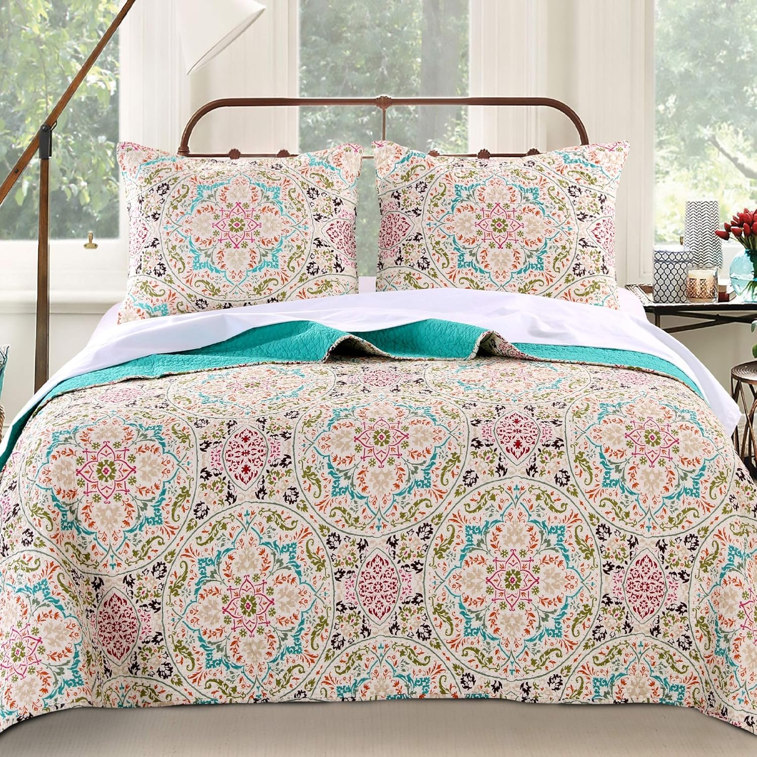Dress your bed in a mosaic of jewel tones with the Morocco gem pillow shams. Each Morocco gem sham splashes a kaleidoscope of color across your room in bright circles like stained glass. Reverses to a solid color transitional aquamarine. Prewashed and pre-shrunk 100percent cotton face and back with 100percent cotton fill. Machine quilted with fabric bound edges for durability and surface interest. dimensions: 20x26" standard pillow sham, 20x36" King pillow sham, +/- 2". machine wash.
